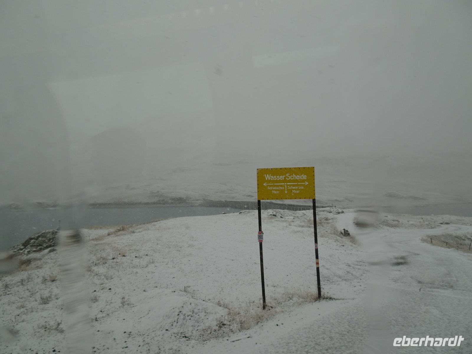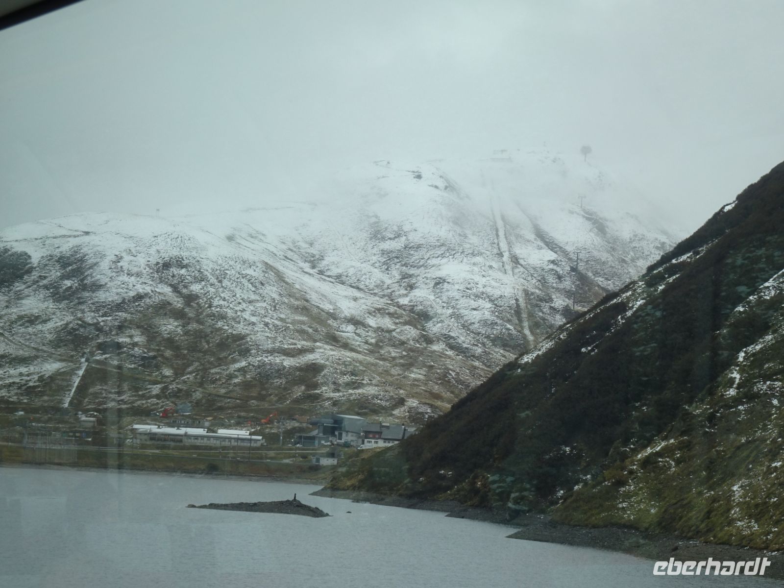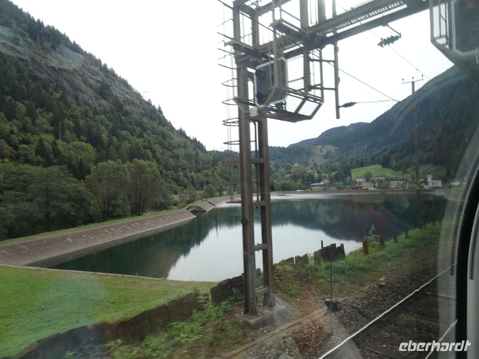 Vorbei an Pontresina und dem Morteratschgletscher ging es zum Berninapass in 2.235 m Höhe. Nicht ohne vorher noch an der hier bestehenden Wasserscheide zwischen Nordsee und adriatischem Meer vorbei zu fahren. Die Berge und Gletscher hatten sich auch an diesem Tag verhüllt, nur bei unserem Halt in Alp Grüm, nun schon auf der nach Süden gehenden Fahrt in das Puschlaver Tal, konnten wir die der Stromversorgung des Bernina Express dienenden Wasserkraftwerke bestaunen. Durch Kehren und Galerien ging es vorbei an Le Prese - hier wird der Bernina Express zeitweise zur Straßen-Bahn - weiter zum Kreisviadukt von Brusio - beeindruckend!