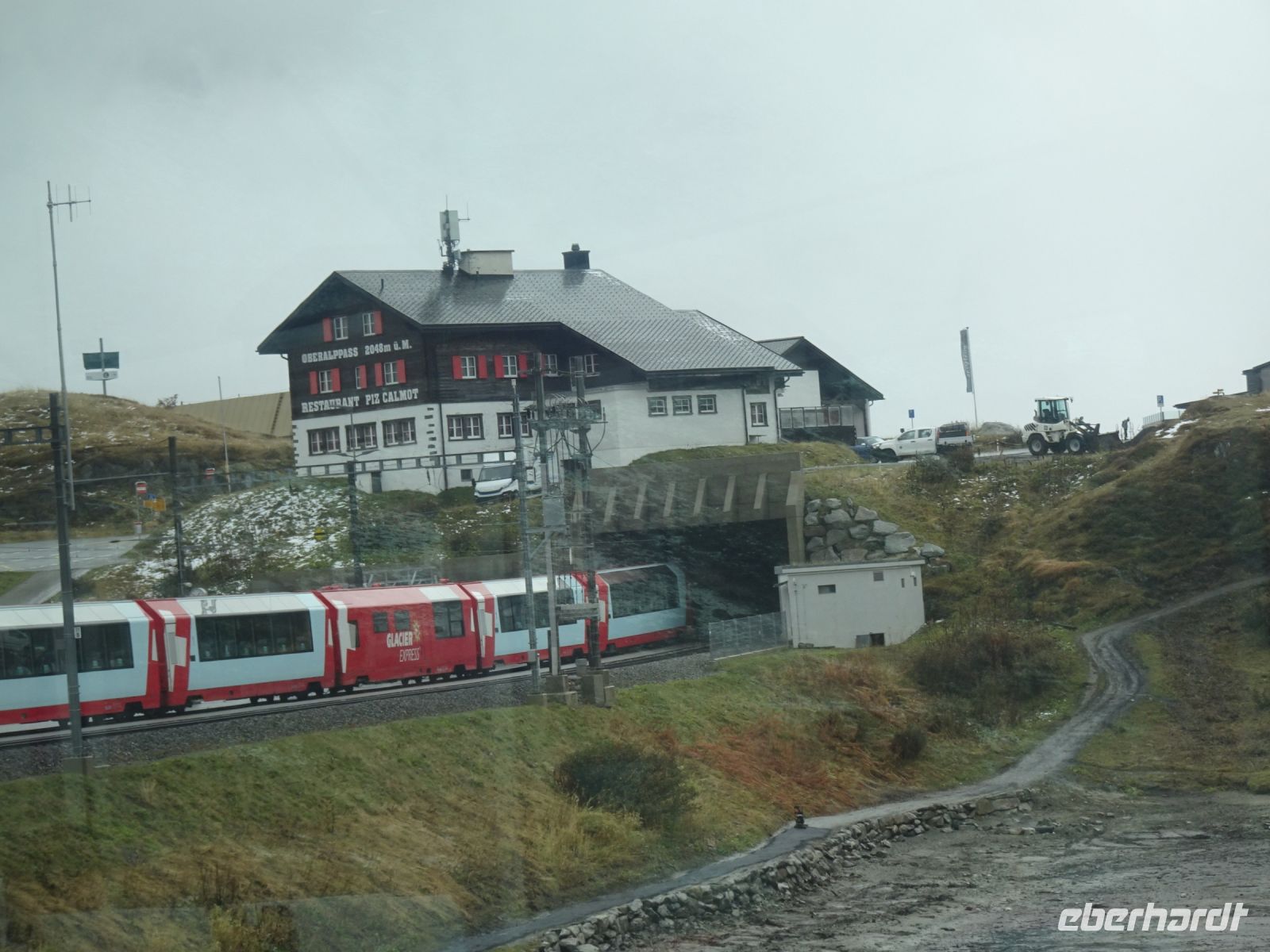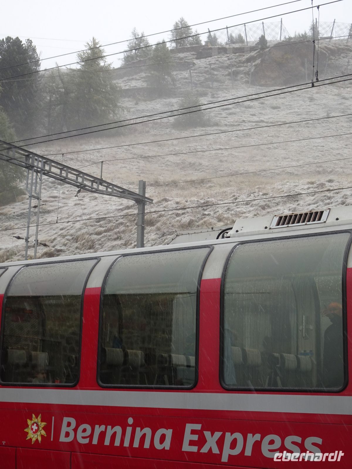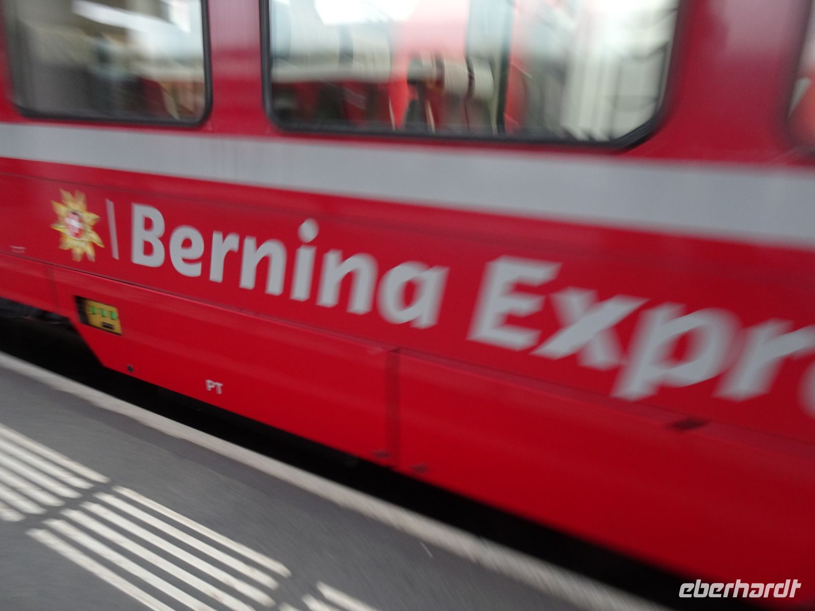 Nach einem opulenten Frühstück ging es - wie immer nur mit leichtem Gepäck - zu Fuß über die Seepromenade zum Bahnhof in St. Moritz. Unser Zug wurde rechtzeitig bereitgestellt und wir konnten in einem der wunderbaren Panoramawagen Platz nehmen.