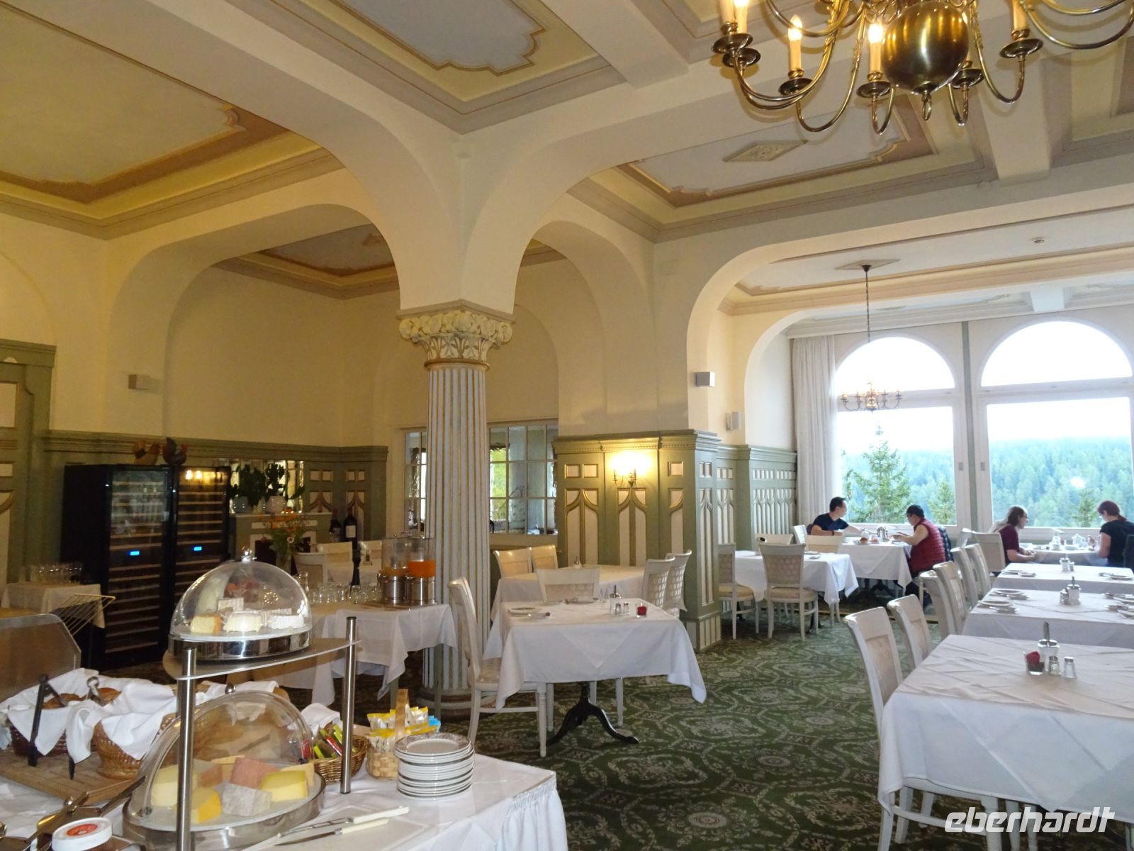 Zu Fuß und mit einer sehr praktischen Rolltreppe erreichten wir zentrumsnah unser über 130 Jahre altes Traditionshotel Soldanella. Ein Prachtbau mit wunderbarem Blick aus dem Speisesaal über den Moritzersee auf der Rosegg-Gruppe. Und in so einer exquisiten Umgebung war natürlich auch das dreigängige Abendmenue ein Höhepunkt. Wollen Sie wissen, was es gab? Als Vorspeise wurde ein kleiner Bündener Teller mit Schinken- und Käsespezialitäten gereicht. Hauptgang war Kalbsgeschnetzeltes nach Züricher Art mit Butternudeln und zweierlei Karotten. Abschluß: eine französische Creme im Töpfchen. Guten Appetit!