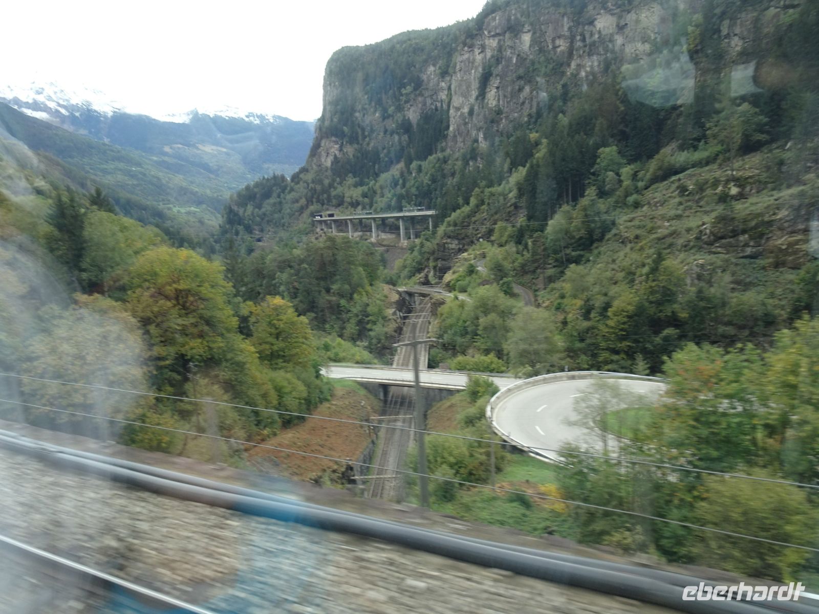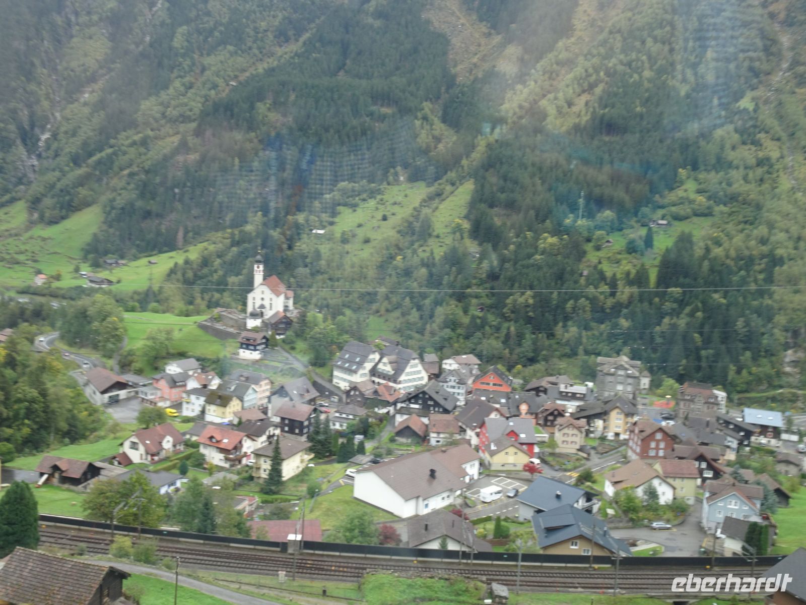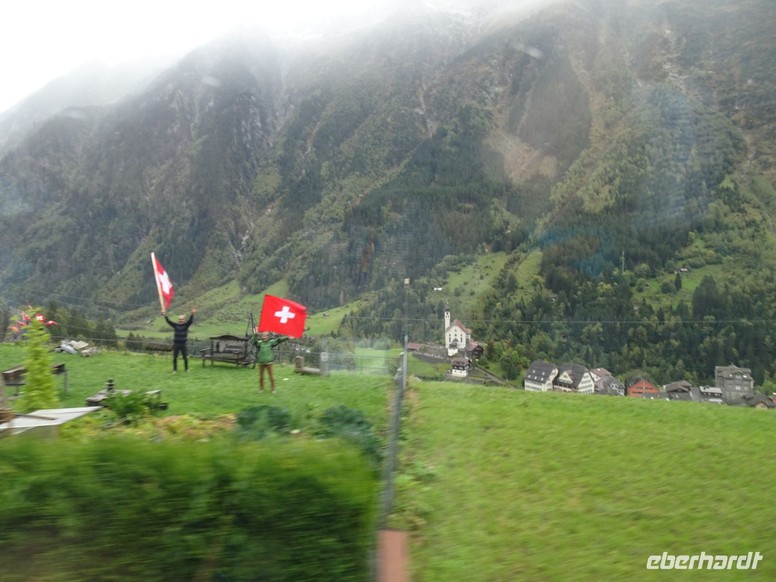 Nach kurzem Blick vom Bahnhof über den Ort und See Lugano bestiegen wir unsere Plätze erster Klasse im Gotthard Panorama Express. Für diesen Zug, der nicht den 56 km langen Basistunnel, sondern die seit dem 19. Jahrhundert existierende Tunnelstrecke nutzt, hat sich die Schweizer Bahn einen extra Service einfallen lassen: sachkundige Zugbegleiter, in unserem Fall der Senior Erich, empfingen uns und gaben umfangreiche Erläuterungen während der Fahrt. Besonders interessant: der Zug führt einen Fotowagen, in dem die Seitenscheiben teilweise geöffnet werden können, um optimale Fotos schießen zu können. In diesem Wagen sitzt auch der führende Kopf des Gotthard-Tunnelprojektes, der Politiker, Finanzier und Bahnpionier Alfred Escher (1819 - 1882), lebensgroß und aus edlem Holz. Tolle Idee! Auch der Versand von Postkarten mit Zugmotiven kostenfrei aus dem Zug ist eine gute Idee. Und: auch die aus verschiedenen Medienberichten bekannten Schweizer Fahnenschwinger bei Wassen begrüßten uns - zweimal sogar wegen des kehrenreichen Abstiegs des Zuges vom Gotthardpass.