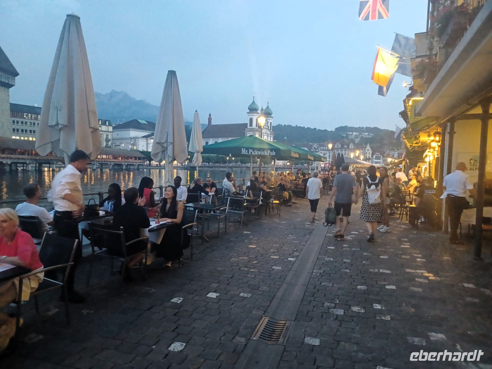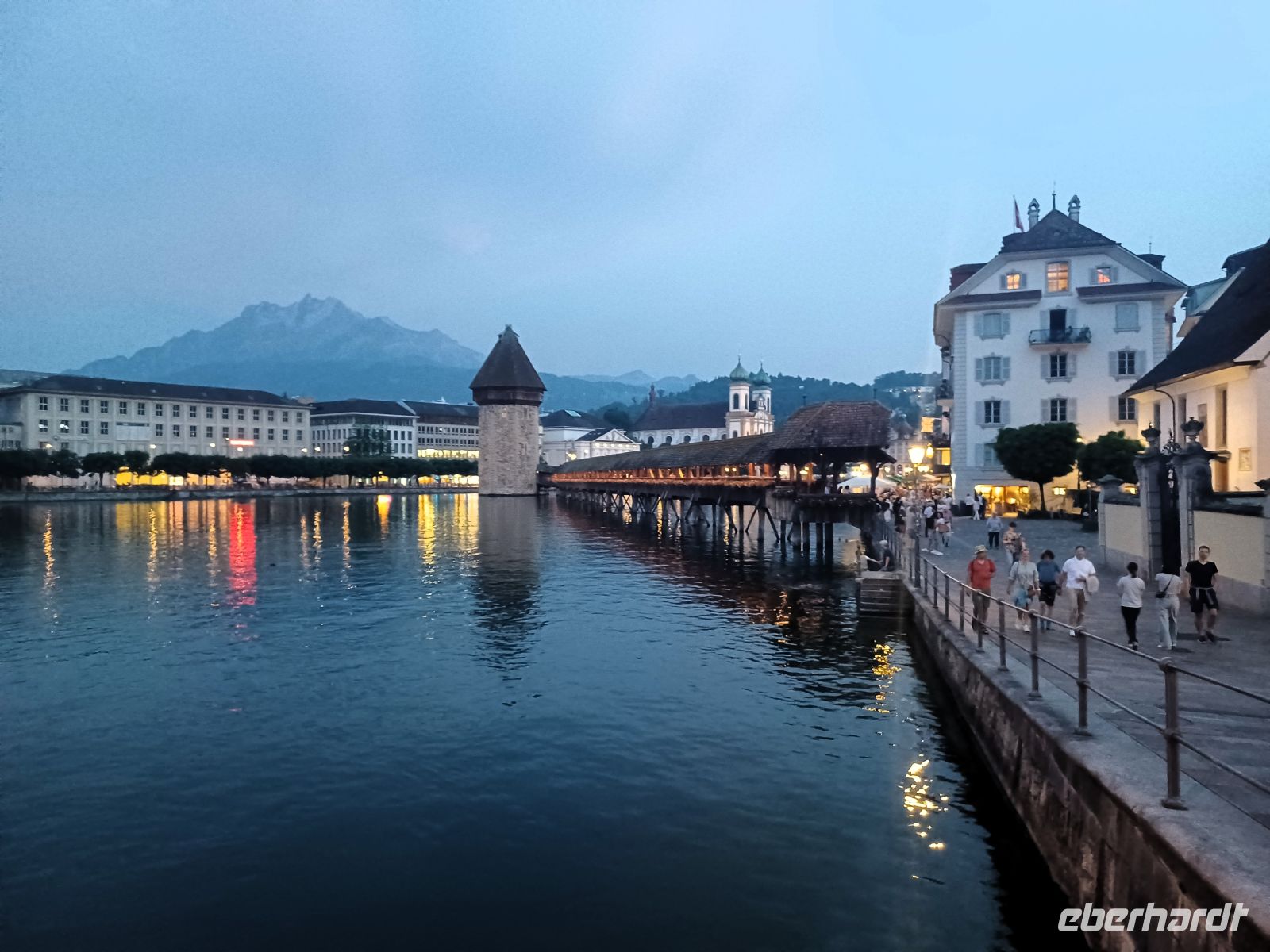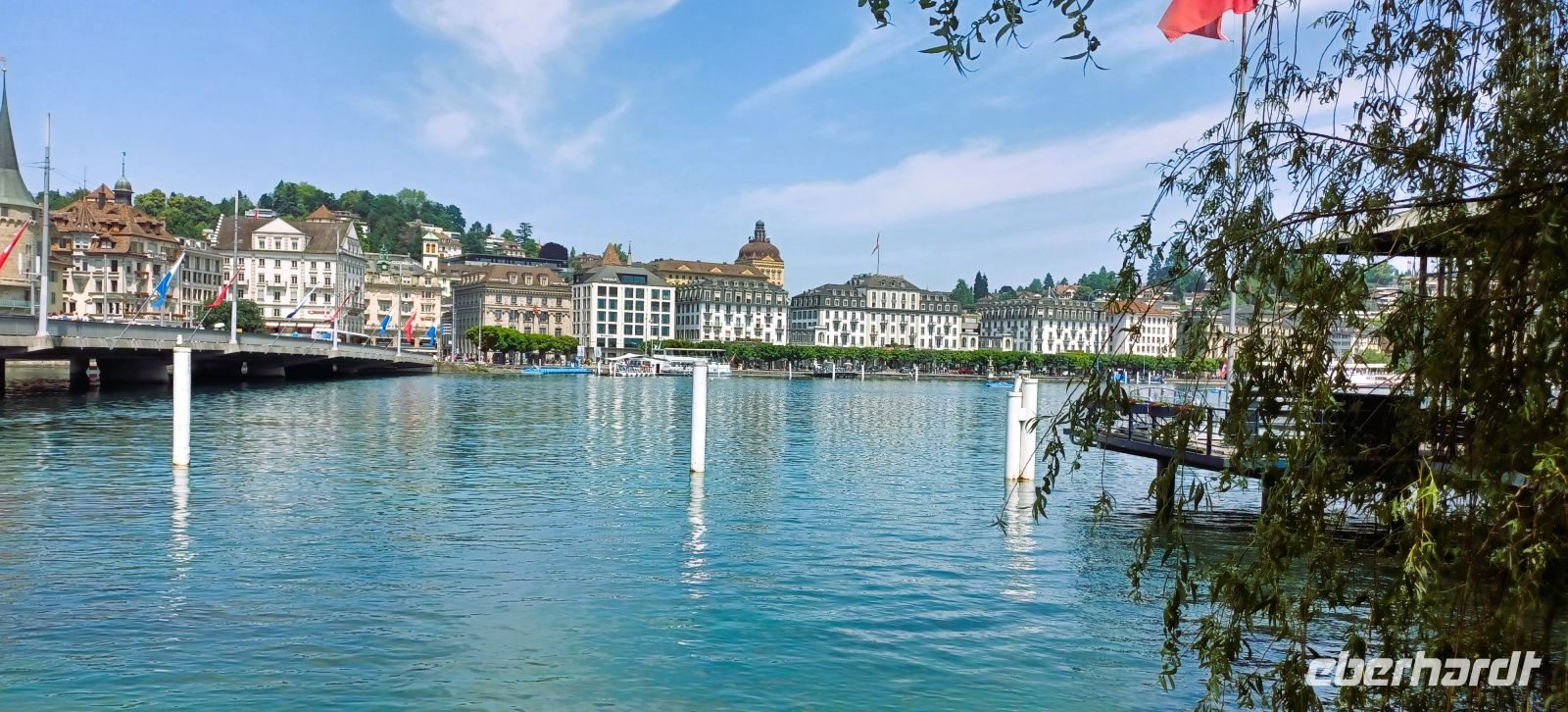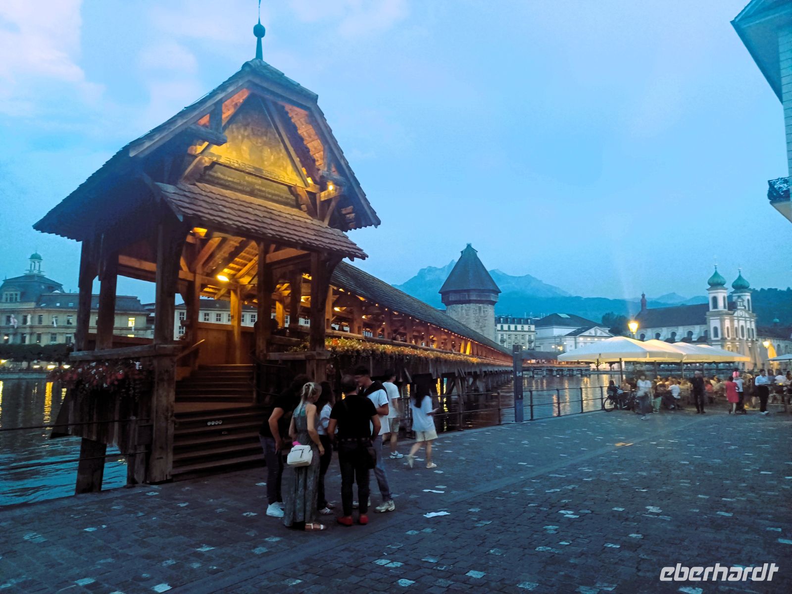 Die heutige Zugfahrt endet am Kopfbahnhof von Luzern; voller Erwartung auf das Kommende verlassen wir den gut klimatisierten Wagen um in mittäglicher Wärme von unserer Stadtführerin begrüßt zu werden. Nun beginnt erneut eine Zeitreise; bald gelangen wir vom modernen Bahnhof zum wohl größten Schatz den die Stadt zu bieten hat, es ist die Kapellbrücke mit ihrem bunten Blumenschmuck. Immer wieder schweift von hier der Blick nach links auf die wirklich imposante Häuserkulisse der Stadt; sie blieb, verschont von allen Kriegen, in ihrer Ursprünglichkeit den Menschen erhalten. Gleich im Anschluss gelangen wir dann auch in die Altstadt um ein weiteres Mal über die geschmackvolle Farbenprächtigkeit der Fassaden zu staunen. Ebenso staunten einst wohl auch Goethe und Richard Wagner über das Pittoreske Luzerns, es hat sich seither kaum etwas verändert…