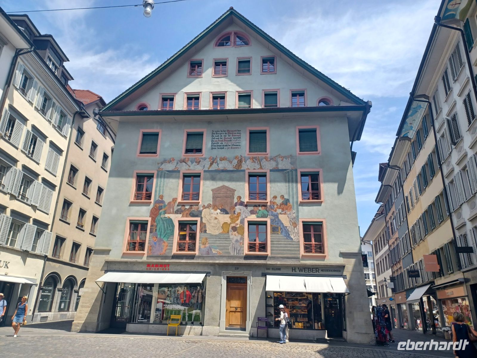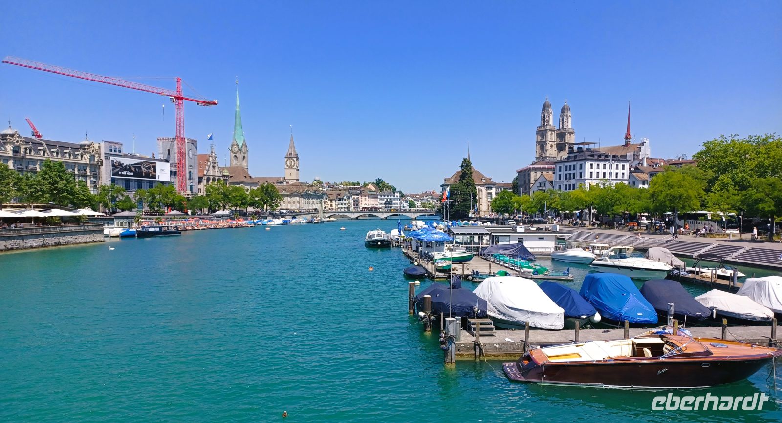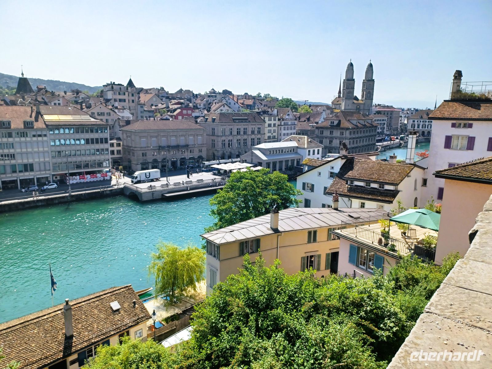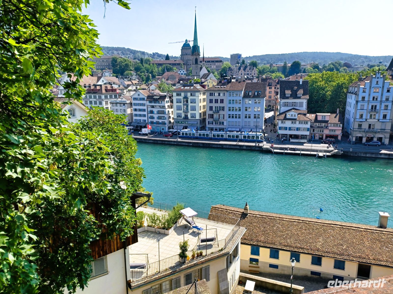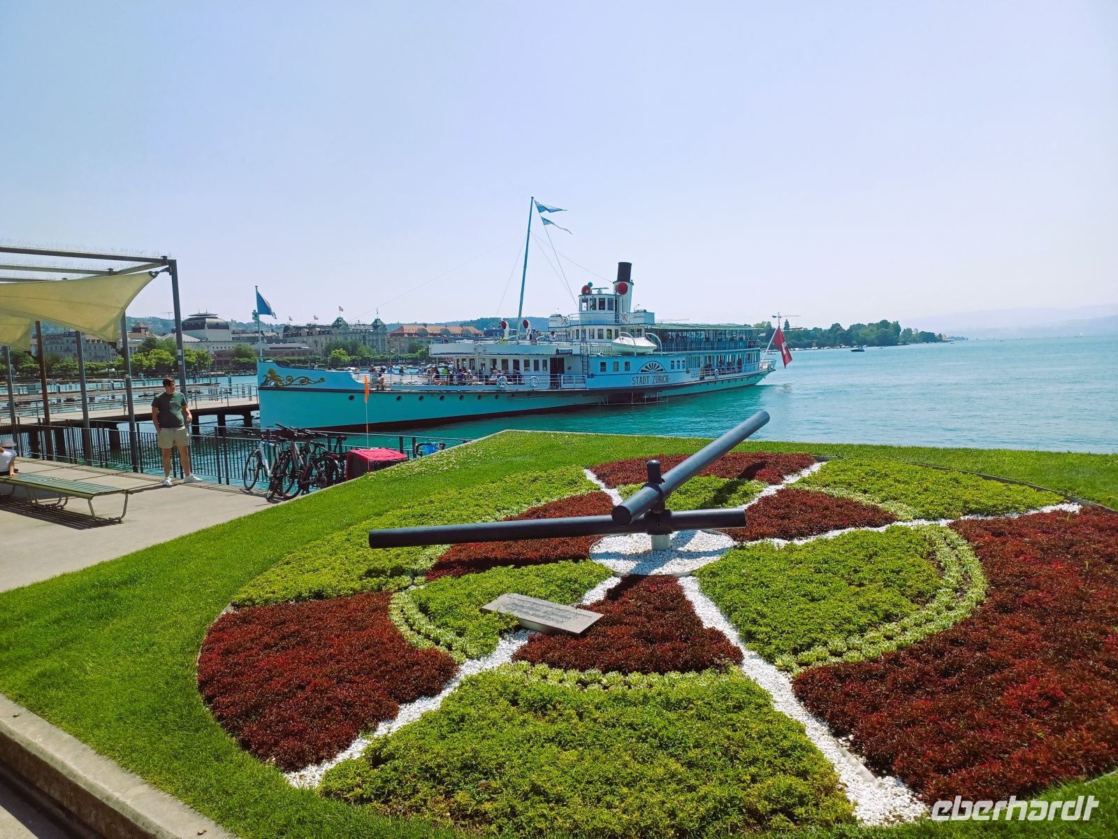 20.6.2025. Ein kleiner Trost bleibt bei allem: Der Vormittag gehört noch der schönen und geschichtsträchtigen Stadt Zürich mit ihrer wunderbaren Architektur. Ein Bummel durch die schmalen Gassen, umsäumt von alten Häusern mit den oft farbigen Fassaden, ein Besuch der zahlreichen Kirchen mit unruhiger Historie um schließlich zum großen See zu gelangen. Er bietet dem Besucher zahlreiche Bänke zum Ausruhen um ungestört vom unruhigen Stadtgetriebe den Blick weit über diese Wasserfläche schweifen zu lassen. Die Wärme hat einen leichten Dunst darüber gelegt aber hier, im Schatten der dichten Bäume, ist es angenehm kühl; ein leichtes Lüftchen weht vom Wasser herüber und macht den mittäglichen Aufenthalt angenehm.