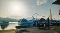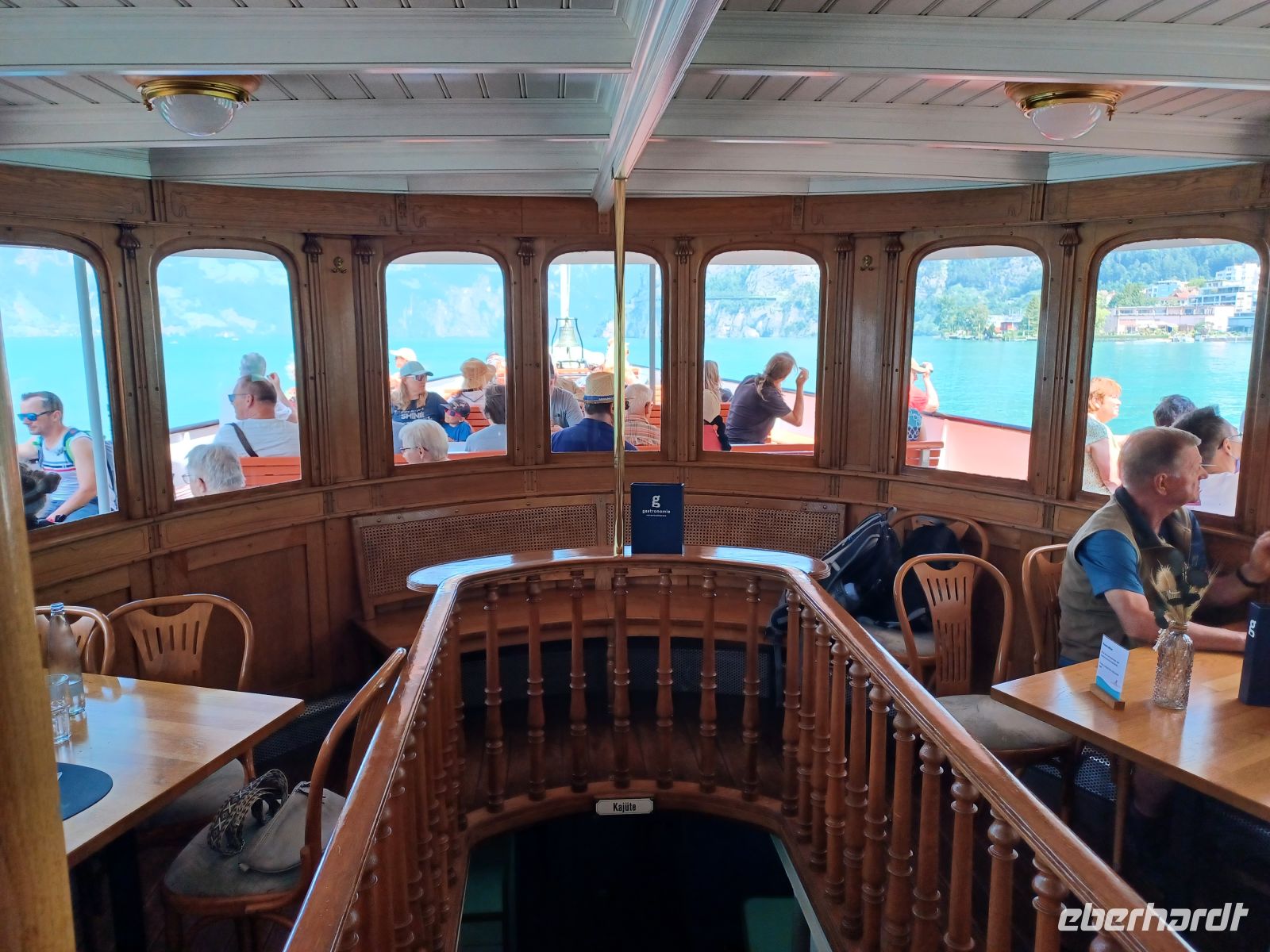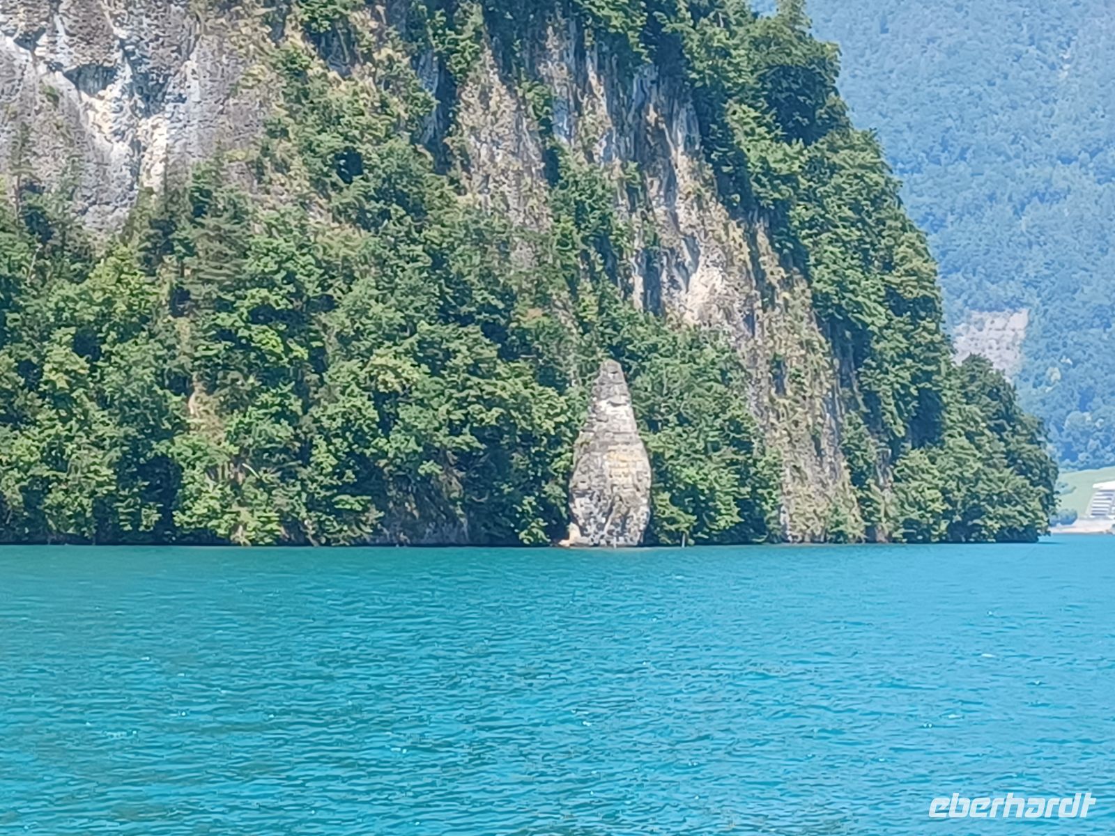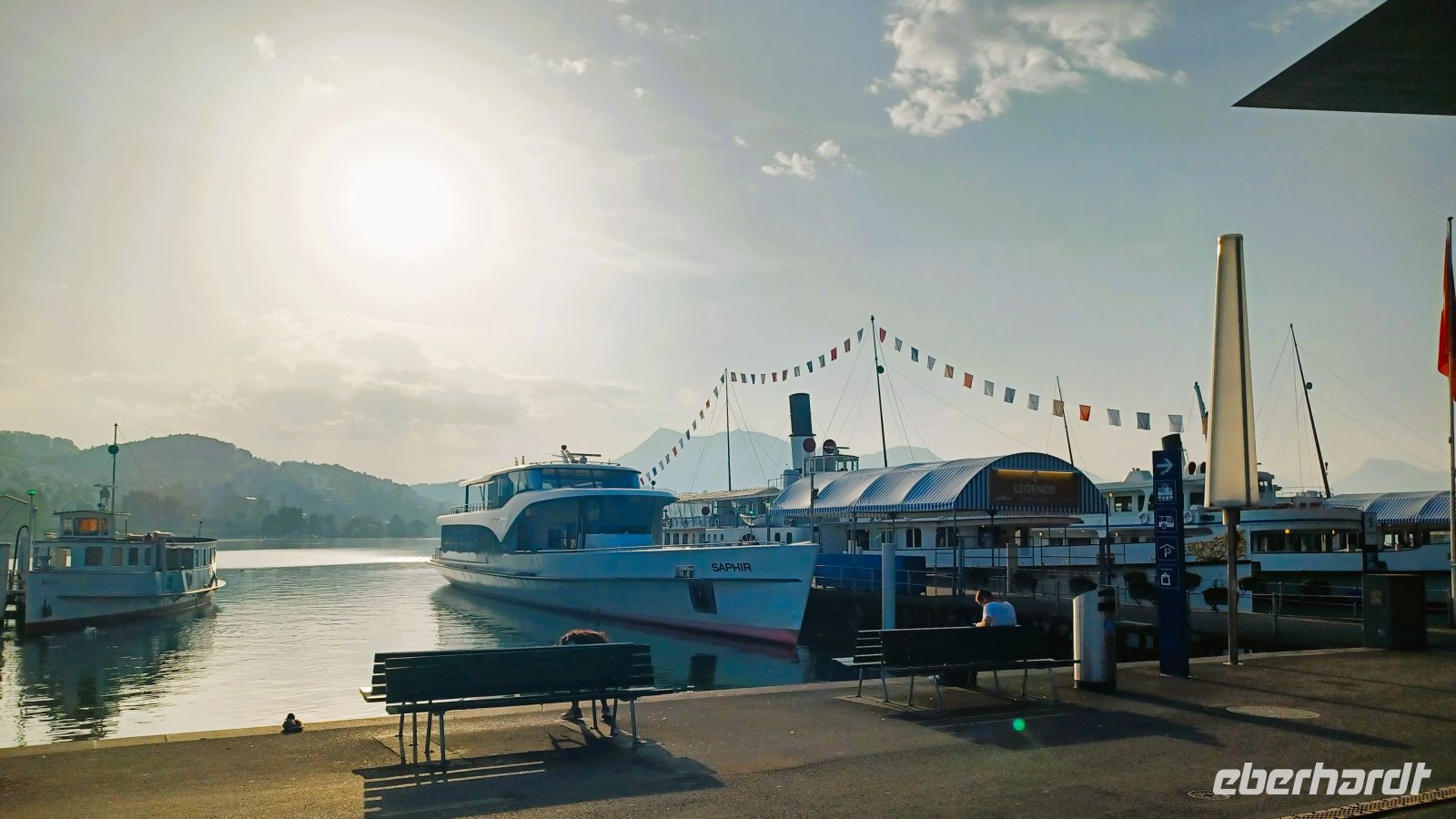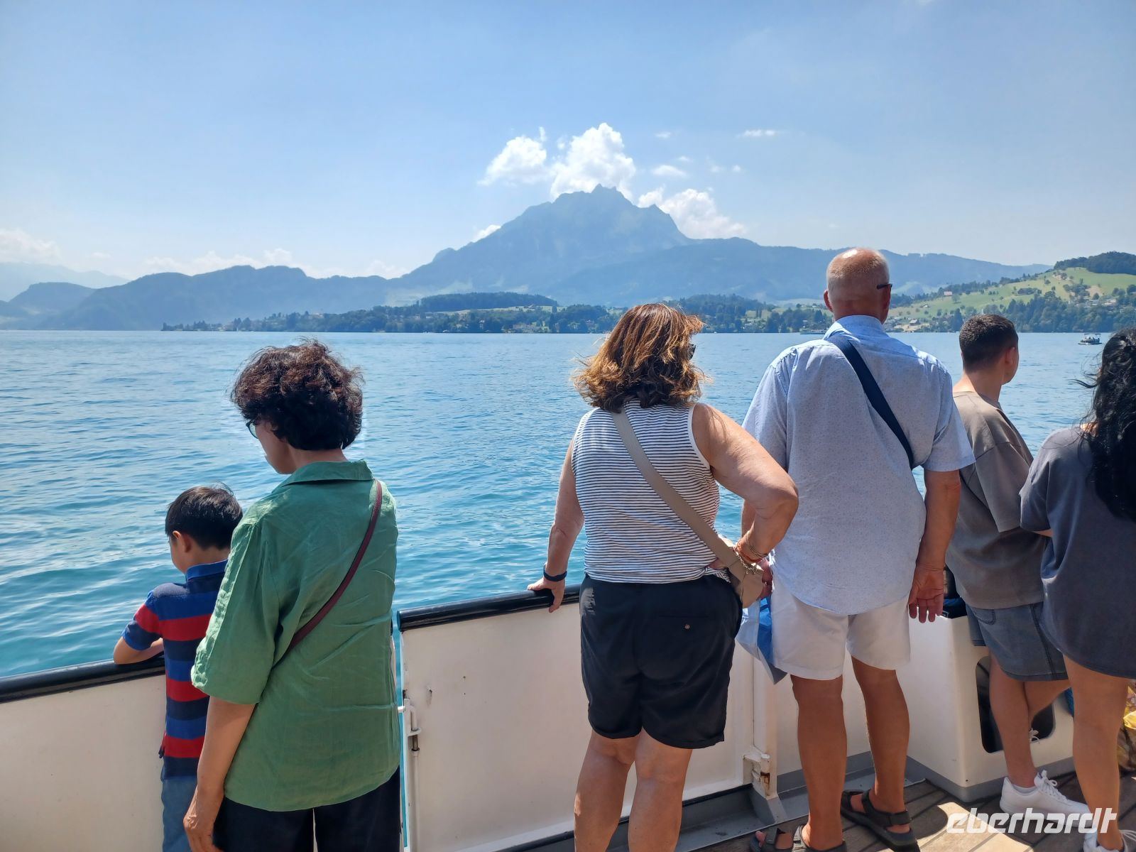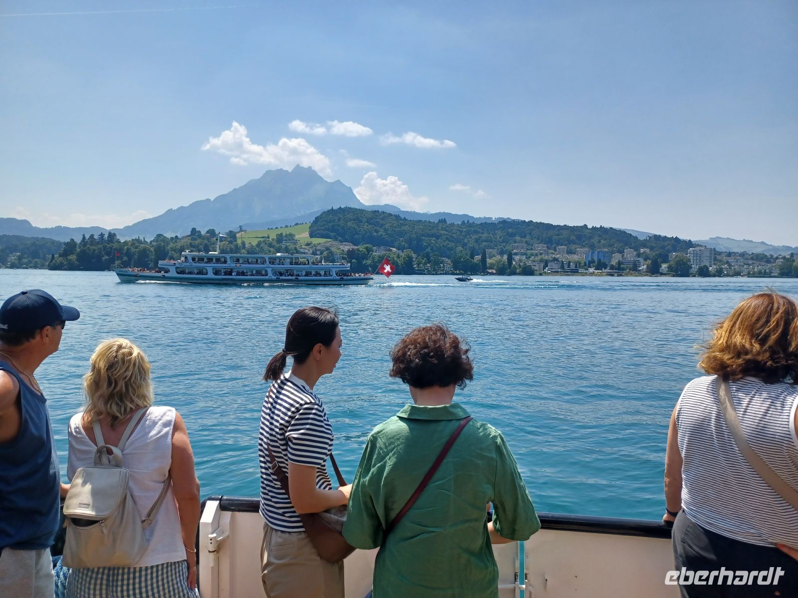 Die Sonne lässt die mächtige Wasserfläche glitzern; die umliegenden Berge rahmen diese wunderschöne Szenerie ein und wir genießen diese gemächliche Fahrt auf dem alten Dampfer. Es ist auch hier warm, aber ein angenehmer Wind streift uns während der Fahrt, er erfrischt auf angenehme Art. Einige Schiffe kommen uns entgegen, sie werden mit einem langen Hupsignal begrüßt.
