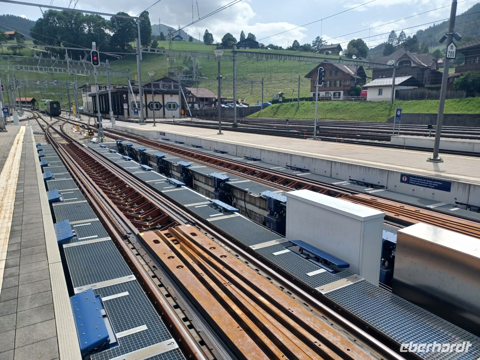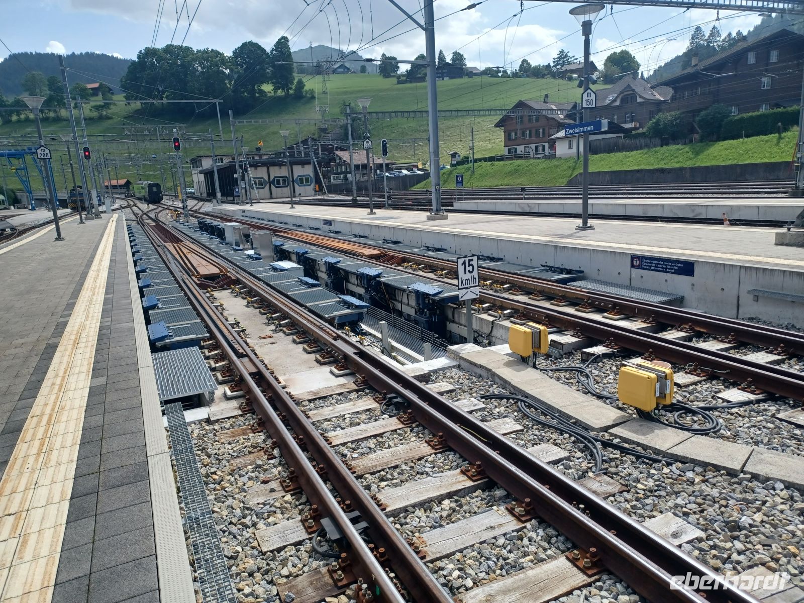 Im Ort Zweisimmen wird die Lok gewechselt und – die Spurweite. Das geht ganz automatisch während der Fahrt; unmerklich werden die Räder hydraulisch nach innen verschoben – ein weiteres Zeugnis der überragenden Arbeit Schweizer Eisenbahningenieure!