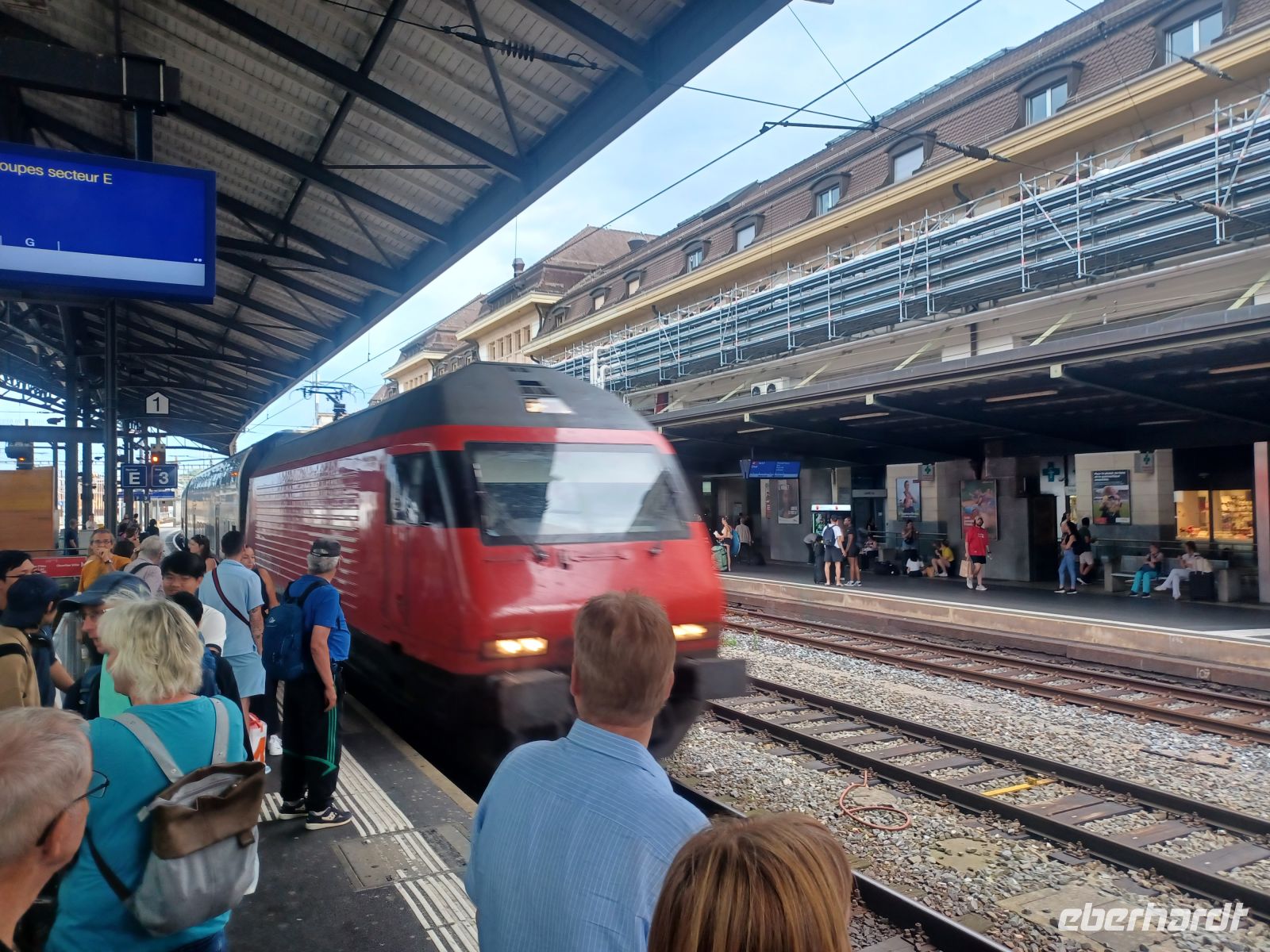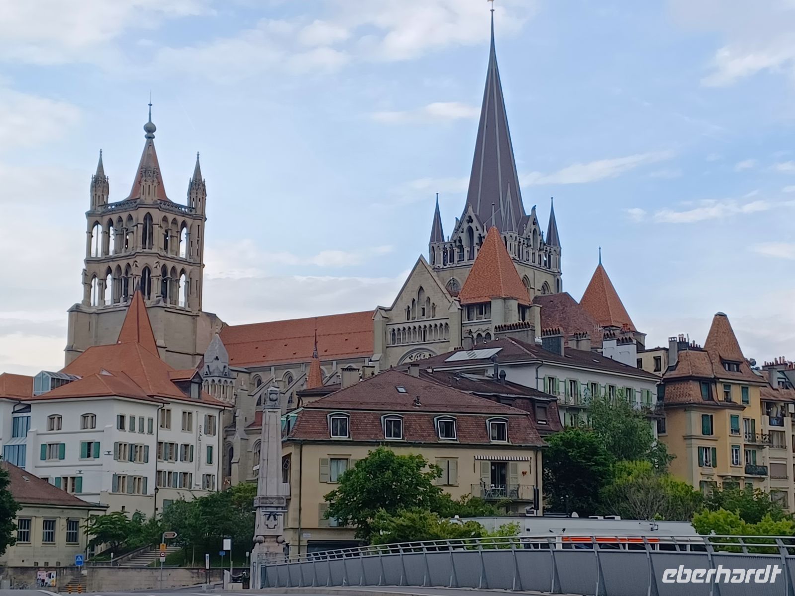 Die Zeit schreitet jedoch unaufhörlich voran; die Bahnstecke senkt sich langsam ab und wenig später erblicken wir voraus die mächtige Wasserfläche des Genfer Sees. Unsere Fahrt führt uns nun in zahlreichen Windungen hinab zum glitzernden Gewässer; ein letzter Umstieg in Montreux und nach einer halben Stunde haben wir unser heutiges Ziel erreicht: Lausanne.
