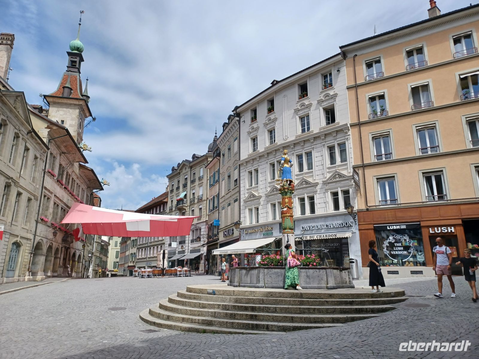 Dann beginnt der Abstieg über die uralte Treppe mit ihrem hölzernen Überbau – das ist Historie pur! Wie in alten Zeiten die Marktfrauen gelangen wir zum politischen Zentrum der Stadt mit dem prachtvollen Rathaus und dem Brunnen mit der Statue der Justitia.