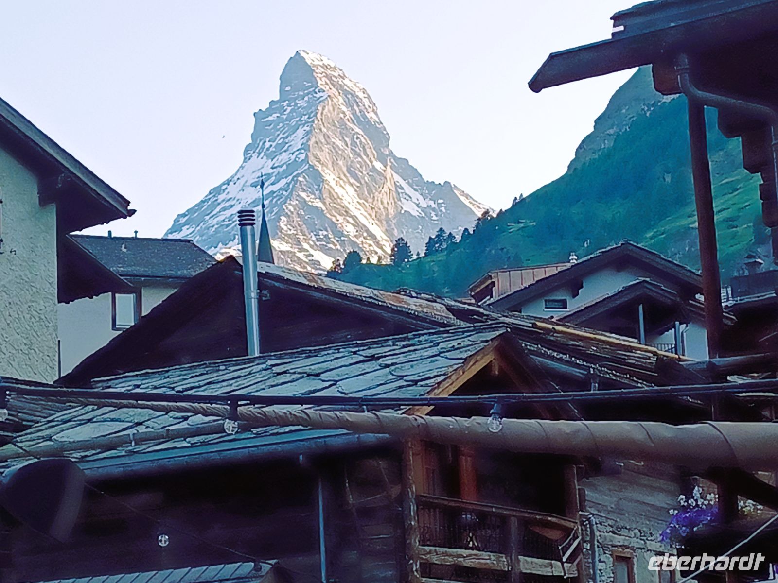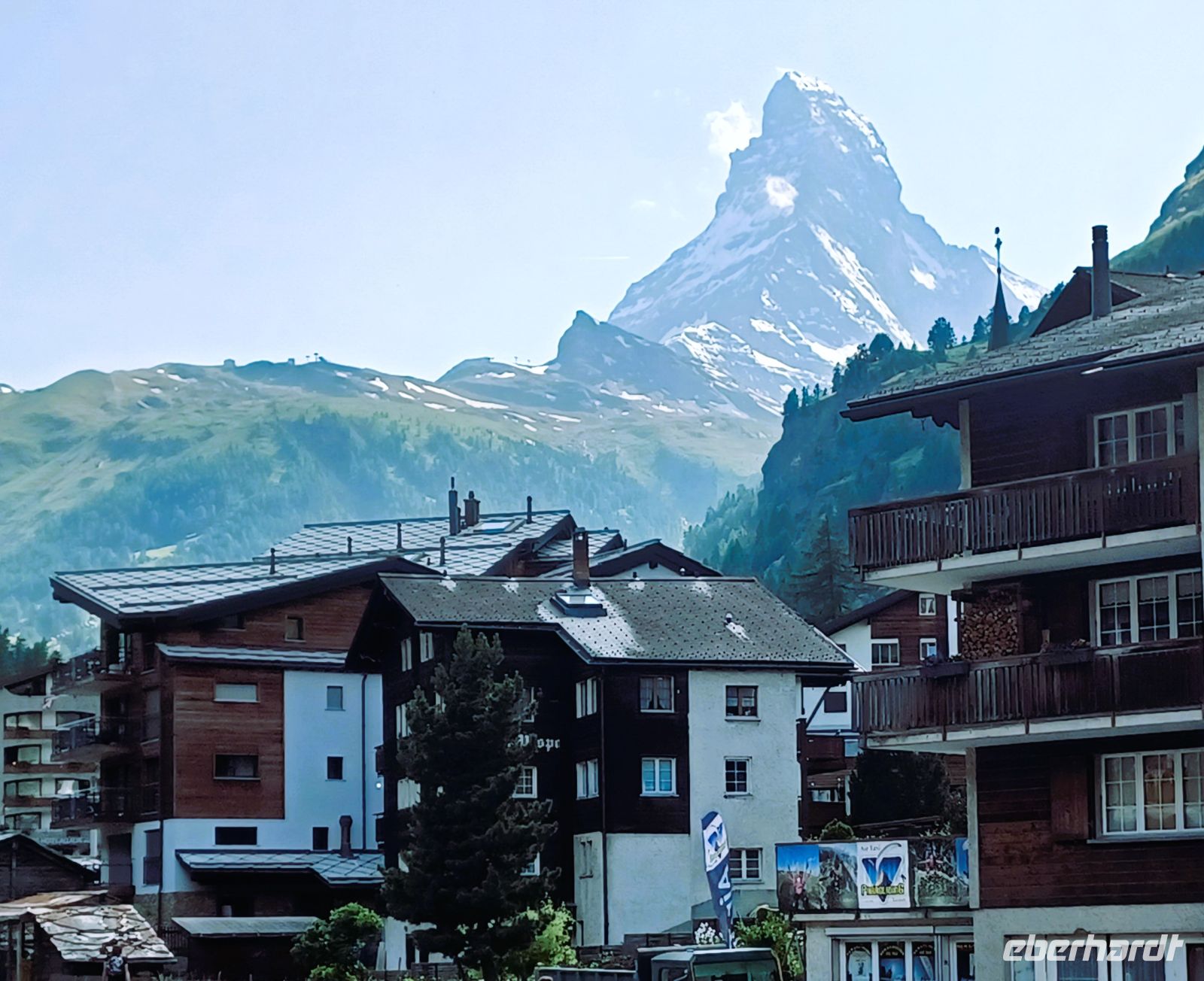 16.6.2025. Um in den vollen Genuss dieses Ausflugs zu kommen, brauchen wir jedoch schönes Wetter. Das Rauschen der nahen Vispa holt mich gegen sechs aus dem Schlaf; ich wage einen Blick zum Fenster hinaus und schaue auf das Wabern tiefliegender Wolken die sich im engen Tal von Zermatt festgehangen haben. Bleiben wir optimistisch und lassen die erst eben aufgegangene Sonne etwas arbeiten. Und richtig: Schon als wir beim Frühstück sitzen hat sich alles etwas gelichtet; wenn auch die Wolken an diesem Tag nicht ganz verschwinden werden, die Sicht ist dennoch recht gut.