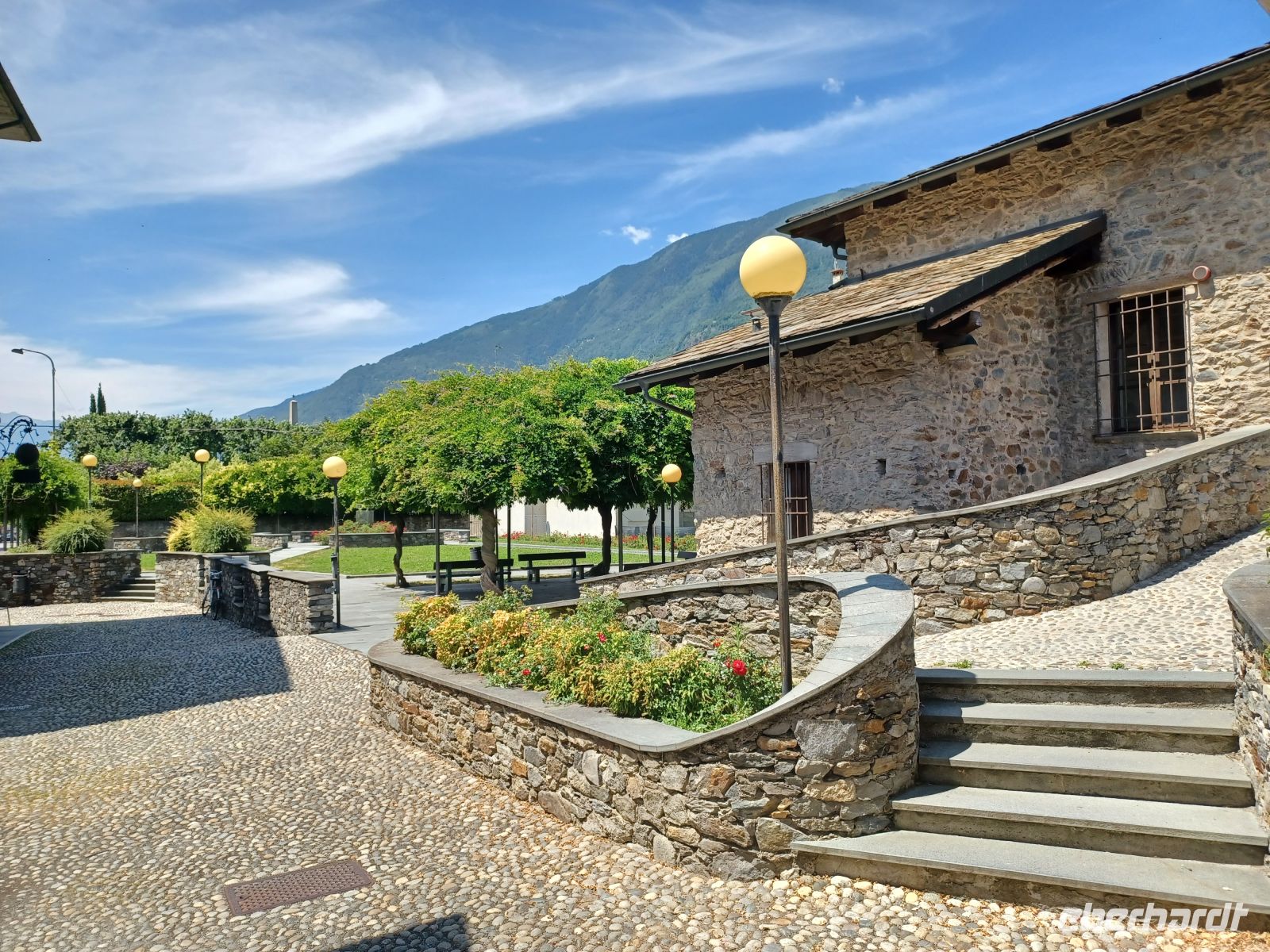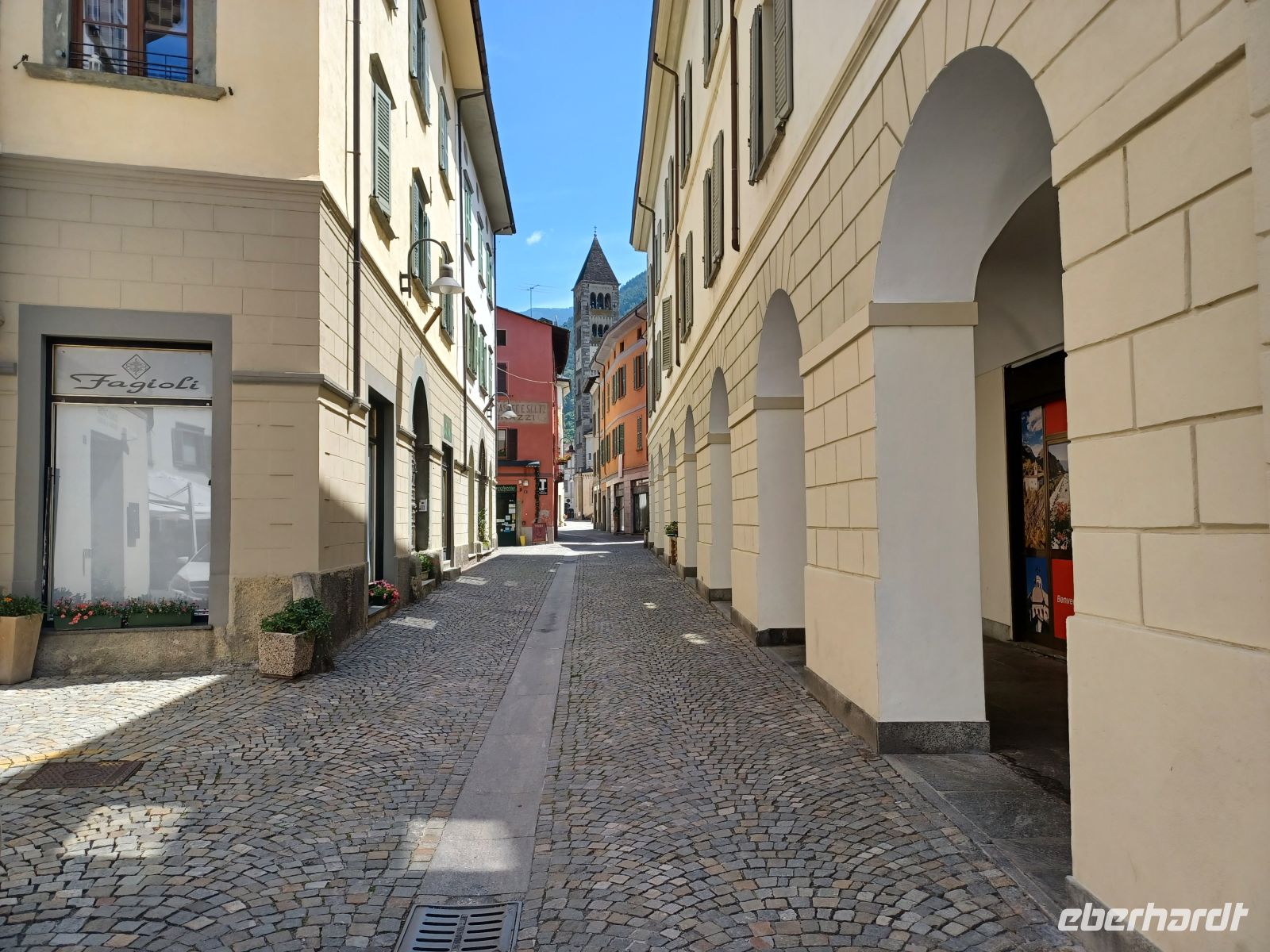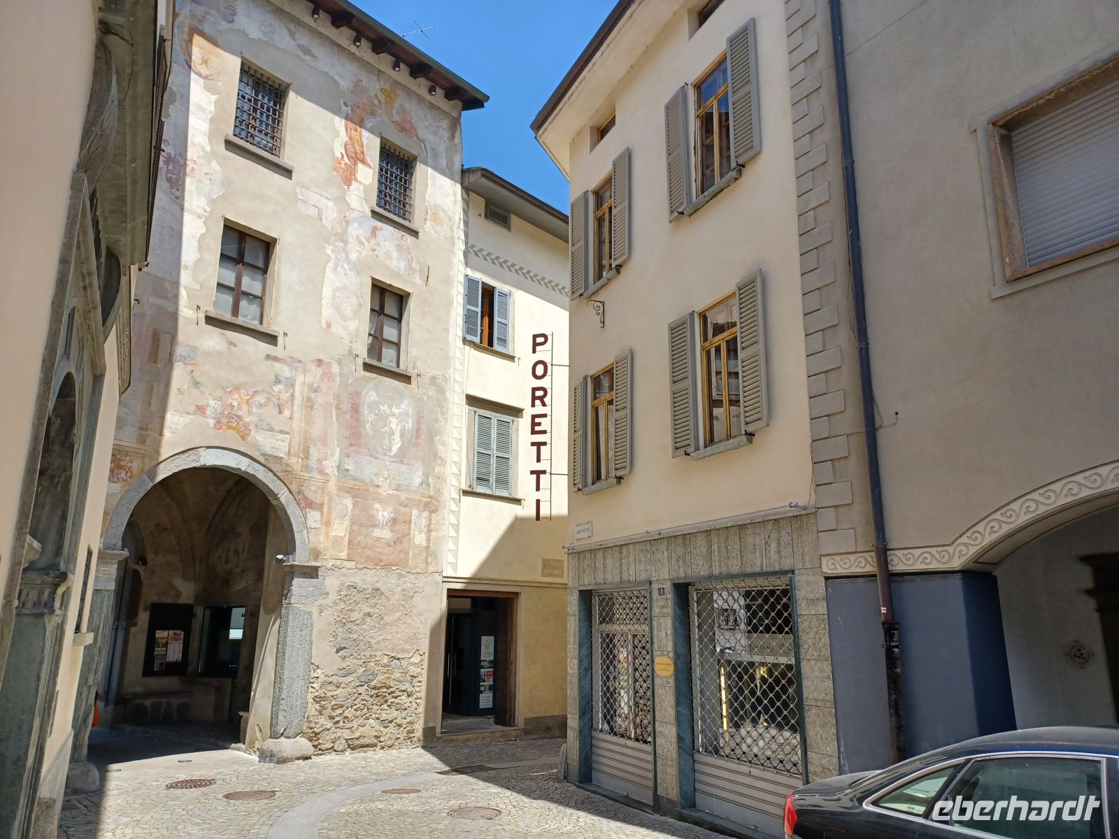 Dort angelangt hat man uns Bahreisenden Busse zur Verfügung gestellt; mit ihnen werden wir hinunter in den Ort Tirano gebracht. Als wir dort aussteigen sind wir nun wieder im Hochsommer angelangt. Eine üppige Vegetation wohin das Auge blickt – und wir gönnen uns hier eine Mittagspause. Einfach, aber doch irgendwie interessant, zeigt sich uns die Altstadt des Ortes.