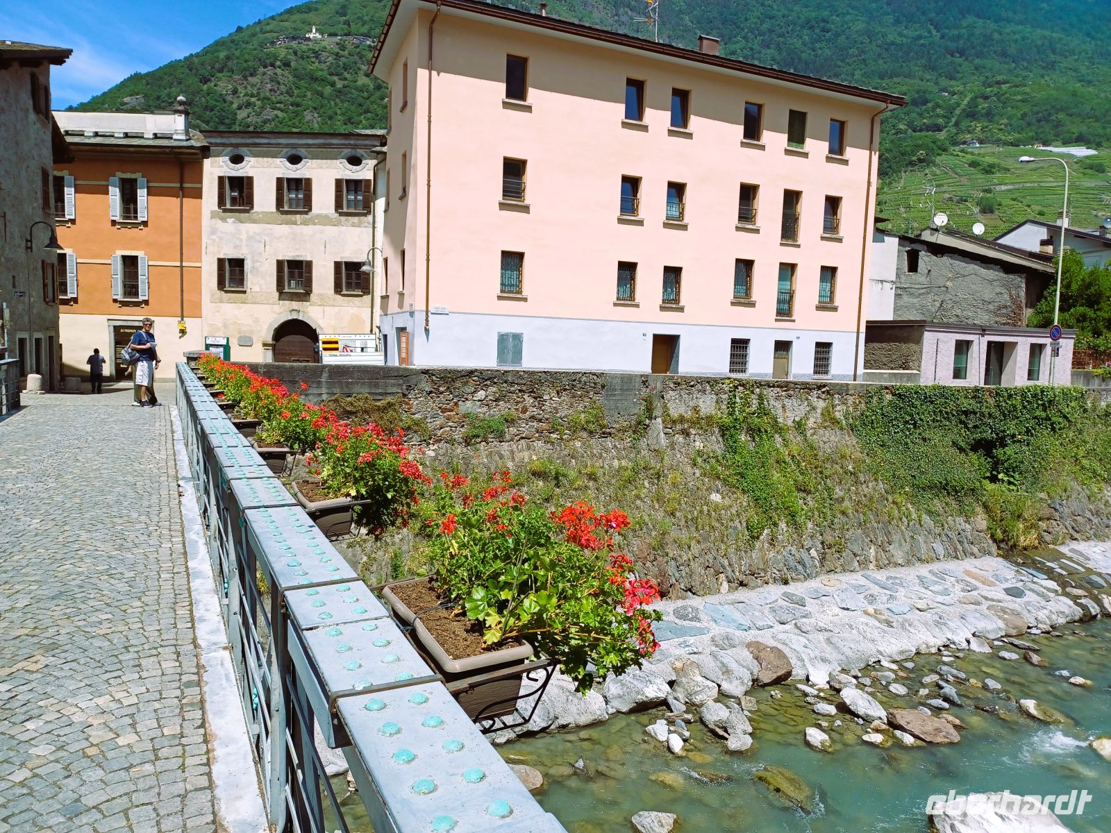 Am Nachmittag nehmen wir nun Platz in einem gut klimatisierten Reisebus; er bringt uns zunächst durch das breite Tal des Flusses Adda, auch Veltin genannt. Die Südhänge zeigen uns ihre Weinreben, denn ein guter Tropfen wird hier gezogen.