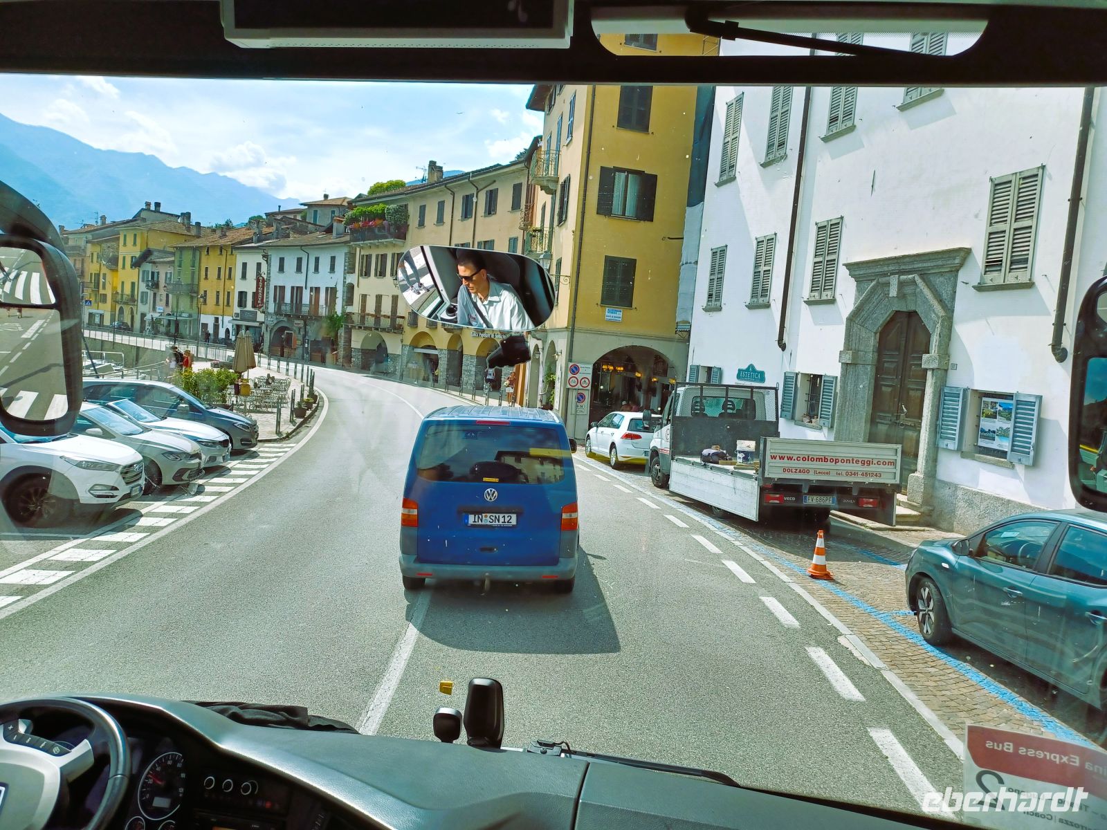 Dann geht es entlang des Comer-Sees; zahlreiche Surfer sind hier unterwegs und vom Bus aus sehen wir die typischen Häuser der Lombardei die oft genug bis dicht an die Straße heranrücken.