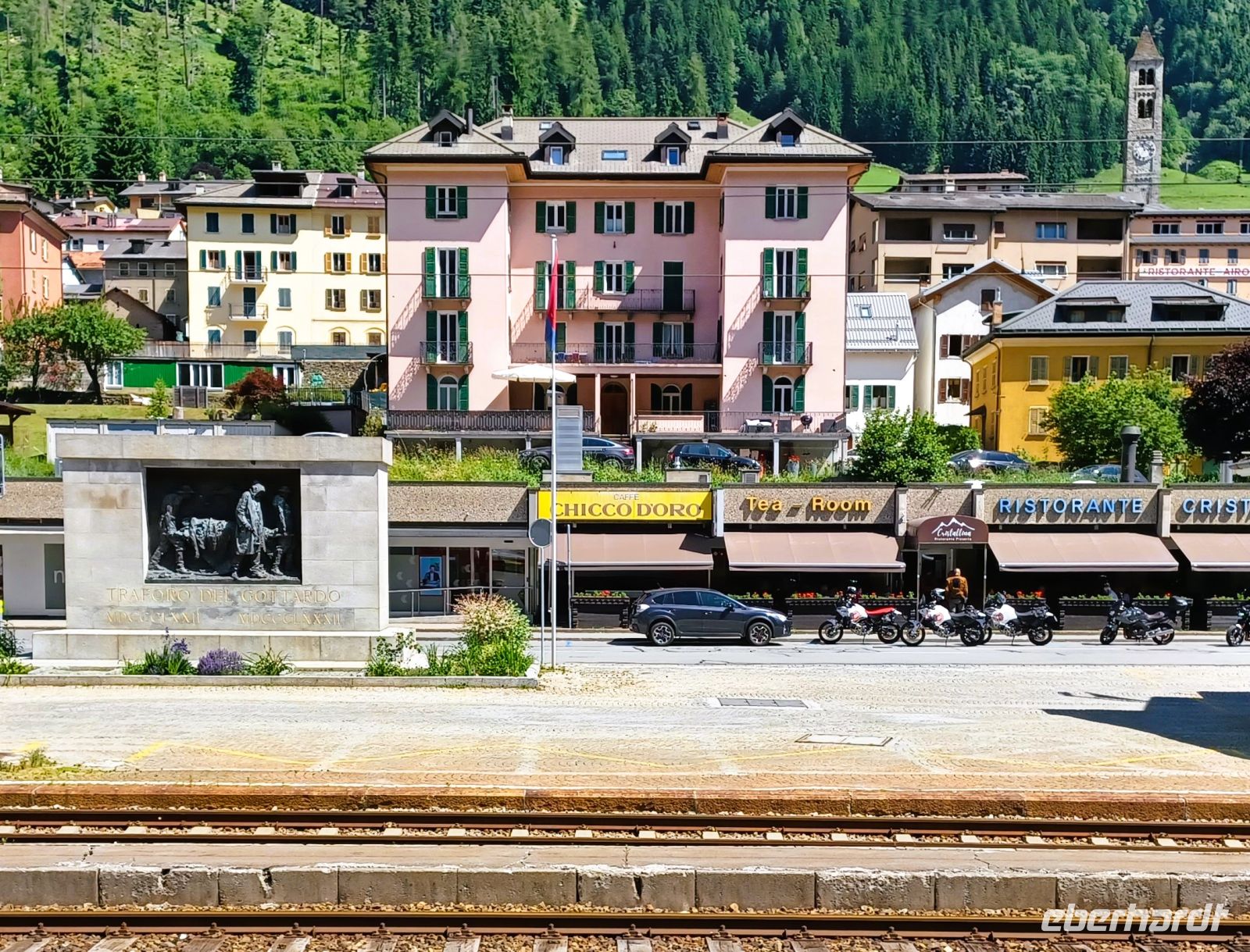 19.6.2025. Eine tropische Nacht liegt hinter uns als wir uns am Vormittag aufmachen um über die Piazza Grande des Tessiner Orts Locarno mit seinem echt italienischen Ambiente in Richtung Bahnhof zu gelangen. Pünktlich kommen wir in Lugano an und erwarten erneut eine großartige Zugfahrt. Auf dieser Gotthard-Strecke wird uns eine Zugbegleiterin zugeteilt; sie wird uns alle Fahrthöhepunkte näher bringen. Die sympathische Dame hat zunächst keine gute Nachricht für uns: Der Express hat technische Probleme und daher – Verspätung. Ja, auch so etwas gibt es bei der ansonsten perfekten Schweizer Bahn; aber es wäre ein Wunder wenn nicht schon längst ein Plan vorliegen würde. Um es vorab zu sagen: An unserem Programm wurde nichts gestrichen.