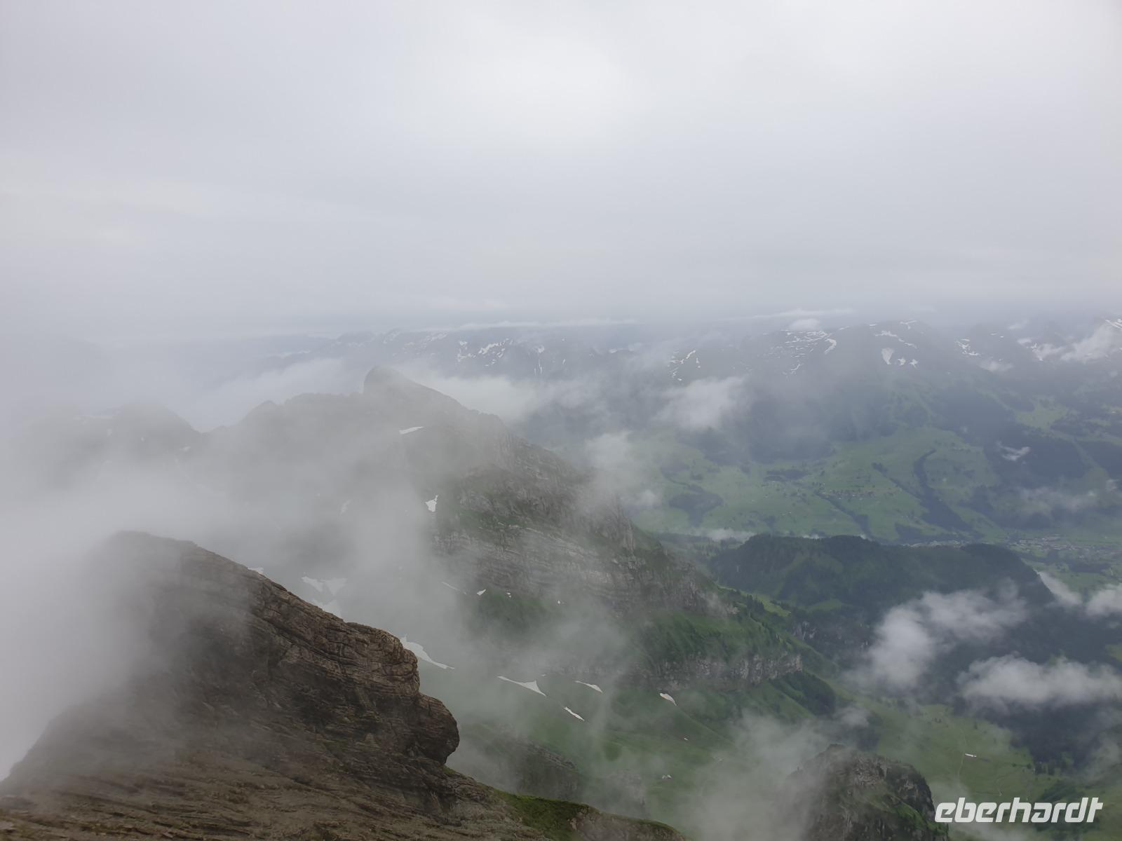 Durch das Prättigau, das Rheintal und durch Toggenburg, die Anreise zur Schwägalp. Eine bequeme Auffahrt mit der Großkabinenbahn auf den Säntis. Schöne Ausblicke, auch wenn der Sechs-Länderblick heute nicht drin ist.