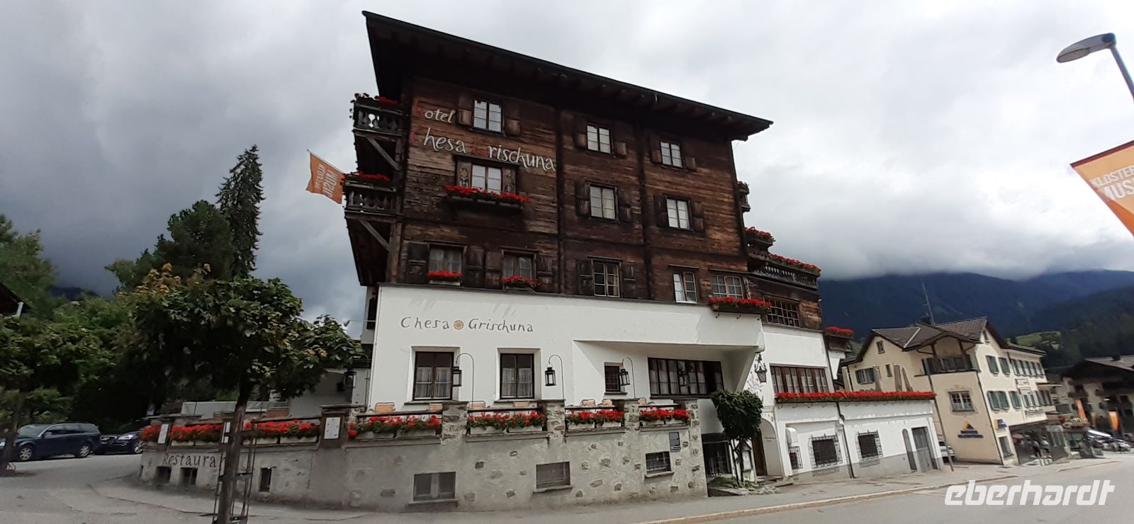 Der Himmel sah nicht rosig aus. Doch wir hatten eine Kutschfahrt zur Alp Gafiun bestellt. Als wir in Klosters ankamen hörte der Regen auf und so konnten wir unsere romantische Kutschfahrt genießen. Sie führte uns entlang des Landquart Flusses auf Wiesen und durch Wälder mit schönen Aussichten auf die Bergwelt. Wir kehrten in die gemütliche Alp ein und genossen die rustikale Jause aus einheimischen Produkten. Gut gestärkt und gelaunt bringt uns das Pferdegespann wieder zurück nach Klosters. Da wir auf der anderen Seite des Tales fuhren entdeckten wir noch schöne alte Bauernhäuser. Der Bergferienort Klosters zeigt im Gegensatz zu Davos die Idylle eines ursprünglichen Bündner Dorfes. Viele Prominente Gäste wie der britische König Charles der regelmäßiger Gast war. Wir nutzten die Zeit für einen Bummel durch den Ort und besichtigten die beiden Kirchen oder kehrten zum Kaffee ein.