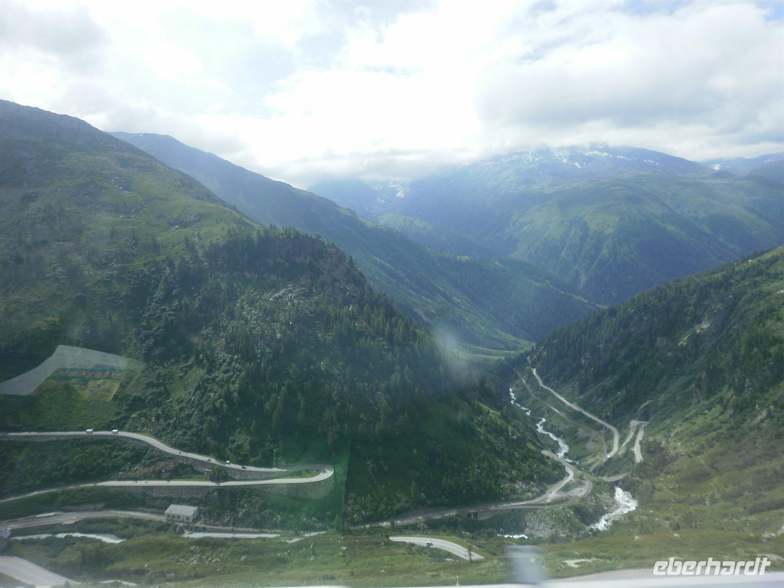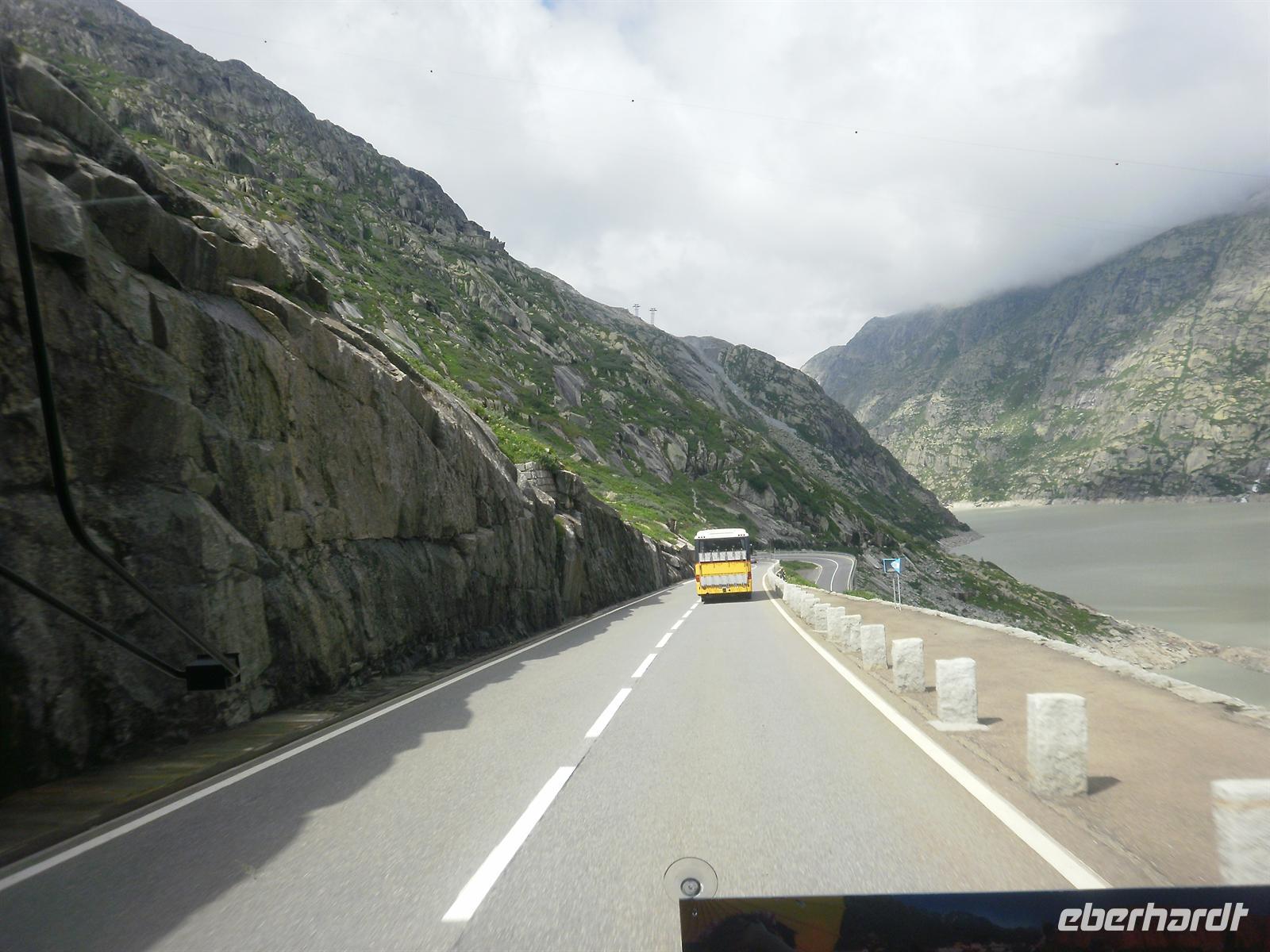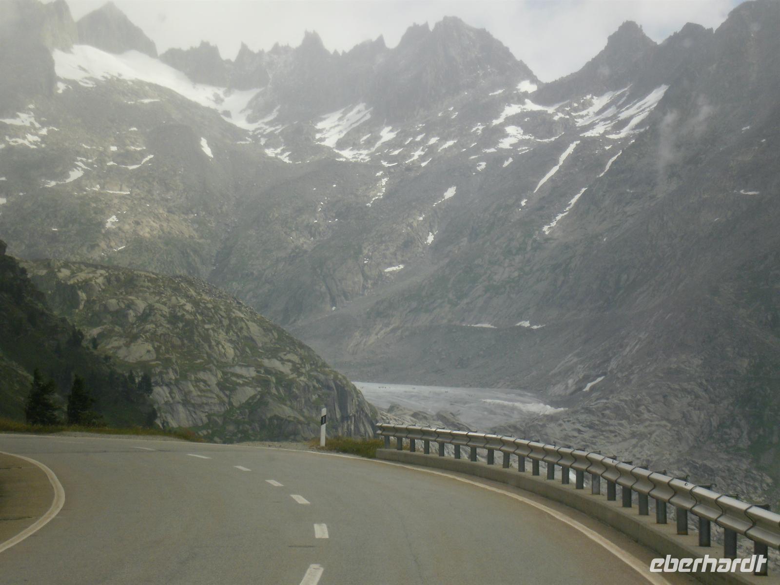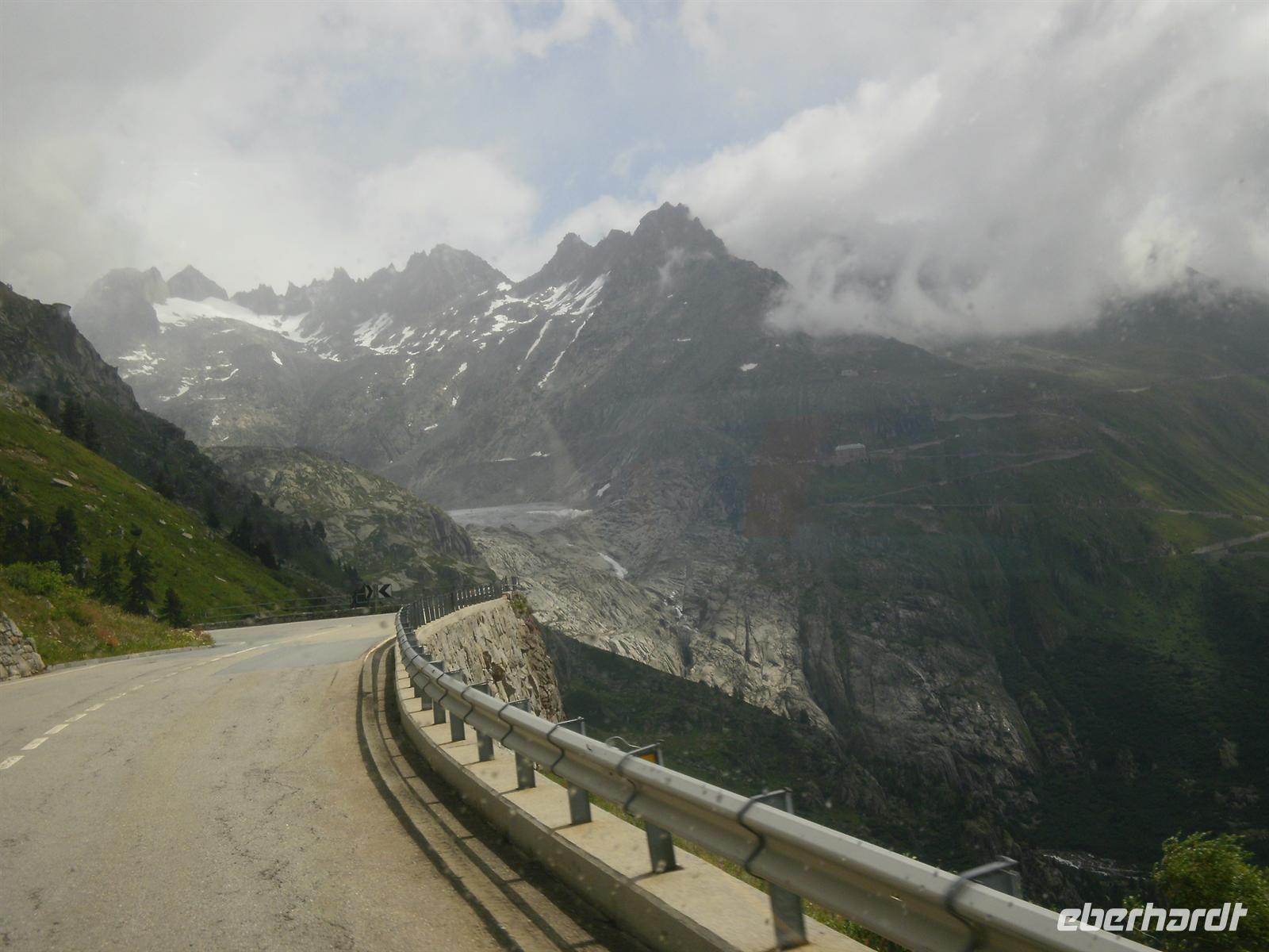 Nachdem wir es in unserem Panoramawagen der 1. Klasse gemütlich gemacht hatten, ging es über Filisur, Tiefencastel, Thusis, Chur, Reichenau, die Vorderrheinschlucht, Disentis und über den 2.033 Meter hohen Oberalppass nach Andermatt. Die Bahnfahrt mit dem langsamsten Schnellzug der Welt dauerte etwa fünf Stunden, aber keine Angst - niemandem von uns wurde langweilig. Das Landschaftsbild verändert sich ständig und es gibt verdammt viel zu sehen...! Zudem wurden wir mit einem schmackhaften Mittagessen verwöhnt. Der Glacier-Express fährt übrigens mit einer Durchschnittsgeschwindigkeit von etwa 35 Kilometern pro Stunde. Das im 12. Jahrhundert von den Walsern gegründete Andermatt erreichten wir am frühen Nachmittag. Dort erwartete uns bereits unser Buschauffeur André mit dem Bus und weiter ging es durch das Urserental bis Realp. Hier nun begann die herrlich Straße hinauf zum 2.436 Meter hohen Furkapass. Dieser verbindet den Kanton Uri mit dem Kanton Wallis und ist die Wasserscheide zwischen Nordsee und Mittelmeer. Auf unserer Fahrt konnten wir übrigens auch die Gleisanlagen der alten Furka-Bergstrecke sehen. Diese wurde mit Eröffnung des Furka-Basistunnels vor knapp 30 Jahren leider stillgelegt und einer großen Initiative von Bahnfreunden ist es zu verdanken, dass man hier mittlerweile wieder mit alten Dampfloks fahren kann - übrigens Bahnromantik pur...!