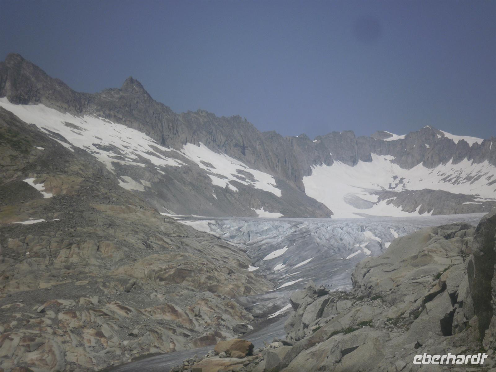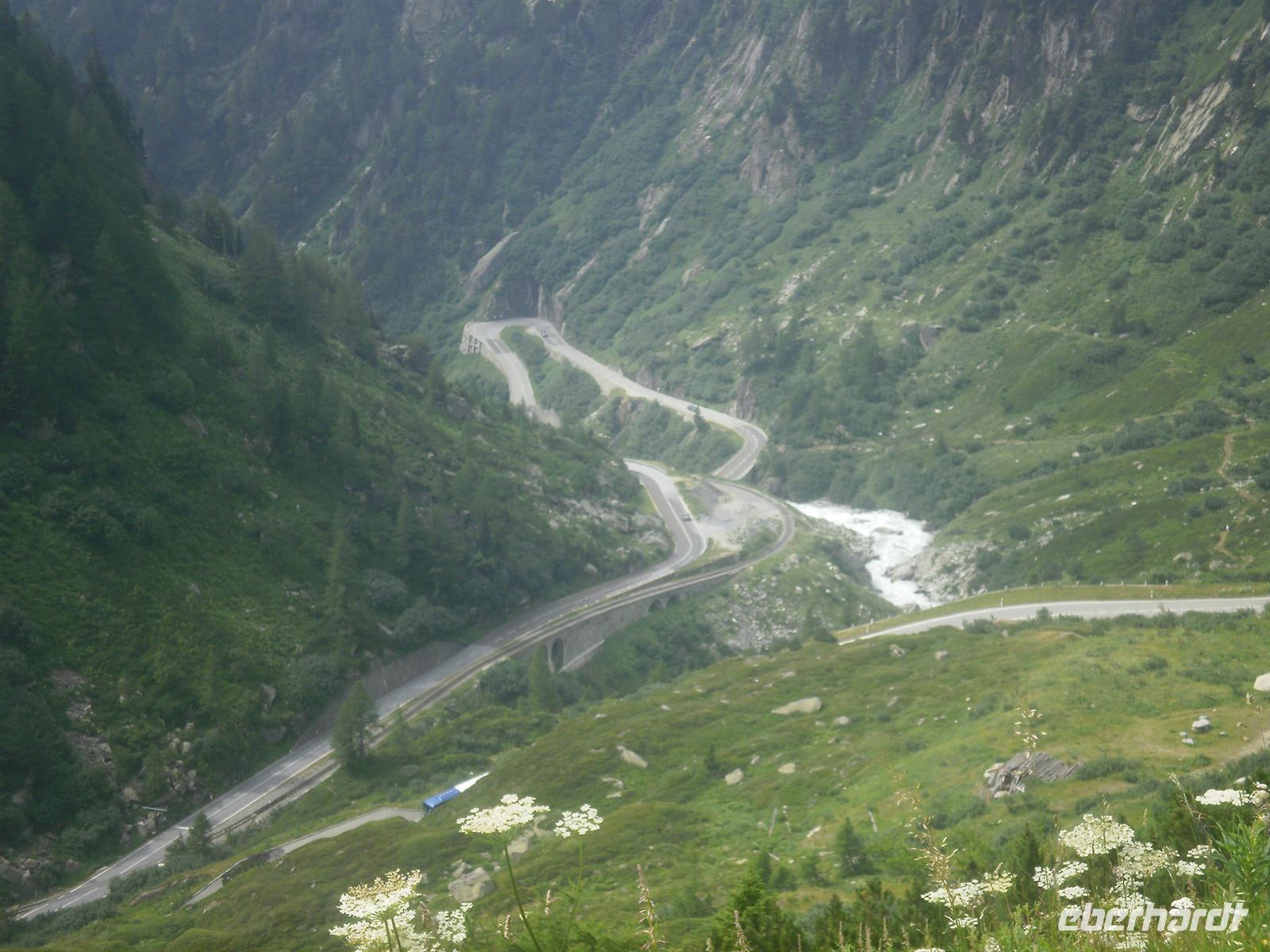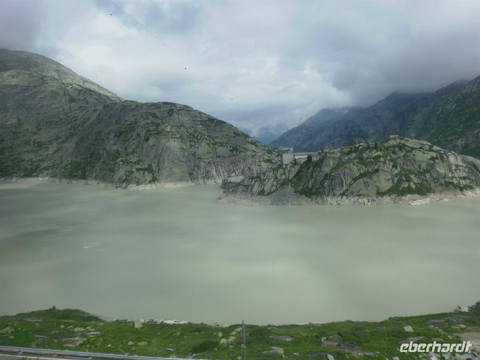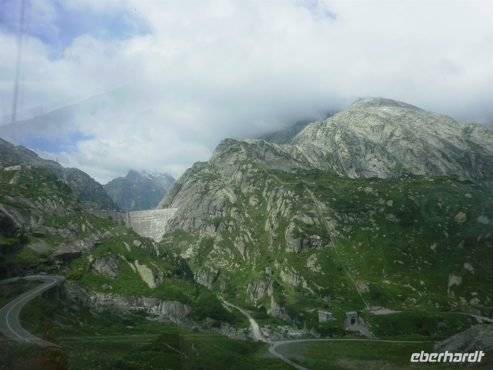 Nachdem wir es in unserem Panoramawagen der 1. Klasse gemütlich gemacht hatten, ging es über Filisur, Tiefencastel, Thusis, Chur, Reichenau, die Vorderrheinschlucht, Disentis und über den 2.033 Meter hohen Oberalppass nach Andermatt. Die Bahnfahrt mit dem langsamsten Schnellzug der Welt dauerte etwa fünf Stunden, aber keine Angst - niemandem von uns wurde langweilig. Das Landschaftsbild verändert sich ständig und es gibt verdammt viel zu sehen...! Zudem wurden wir mit einem schmackhaften Mittagessen verwöhnt. Der Glacier-Express fährt übrigens mit einer Durchschnittsgeschwindigkeit von etwa 35 Kilometern pro Stunde. Das im 12. Jahrhundert von den Walsern gegründete Andermatt erreichten wir am frühen Nachmittag. Dort erwartete uns bereits unser Buschauffeur André mit dem Bus und weiter ging es durch das Urserental bis Realp. Hier nun begann die herrlich Straße hinauf zum 2.436 Meter hohen Furkapass. Dieser verbindet den Kanton Uri mit dem Kanton Wallis und ist die Wasserscheide zwischen Nordsee und Mittelmeer. Auf unserer Fahrt konnten wir übrigens auch die Gleisanlagen der alten Furka-Bergstrecke sehen. Diese wurde mit Eröffnung des Furka-Basistunnels vor knapp 30 Jahren leider stillgelegt und einer großen Initiative von Bahnfreunden ist es zu verdanken, dass man hier mittlerweile wieder mit alten Dampfloks fahren kann - übrigens Bahnromantik pur...!