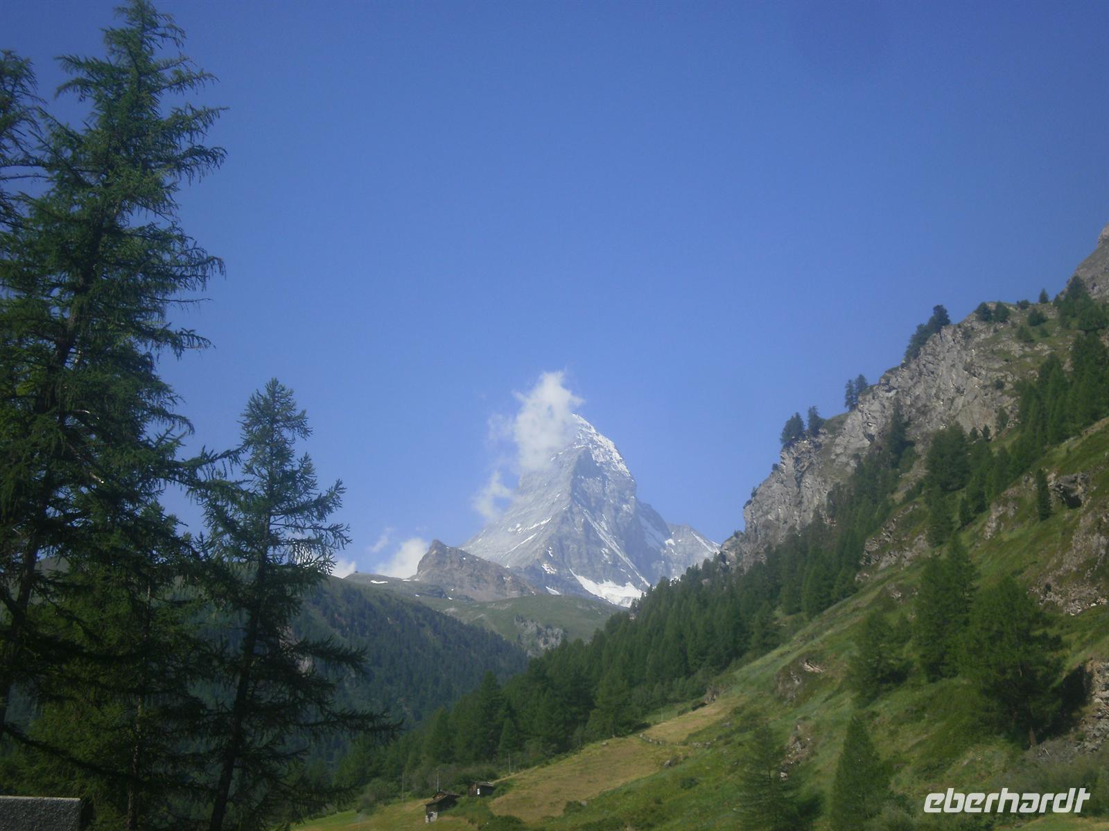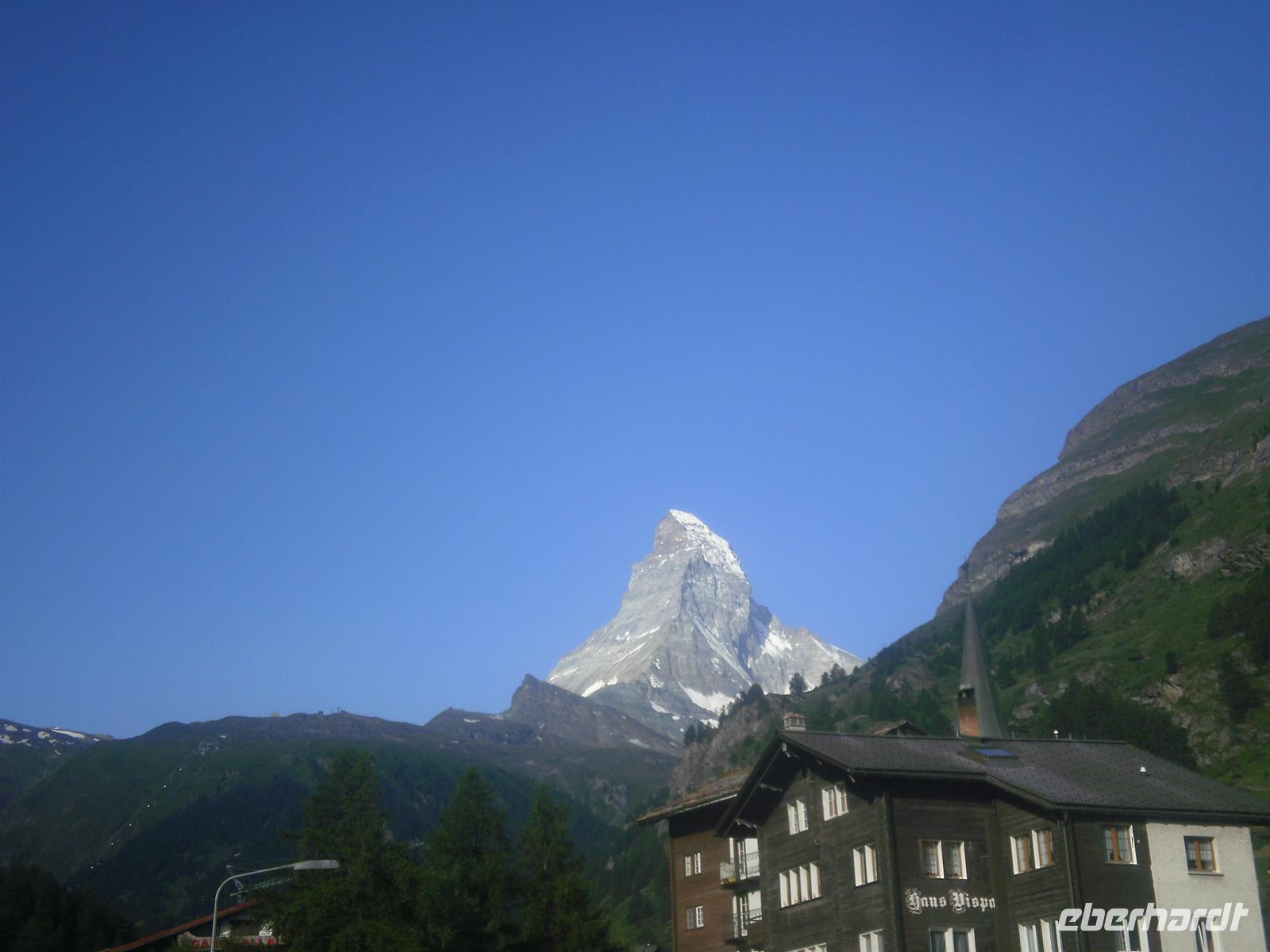 Am Rhonegletscher planten wir einen längeren Aufenthalt. Der Rhonegletscher ist heute noch knapp 10 Kilometer lang und war vor allem im 19. und Anfang des 20. Jahrhunderts aufgrund seiner damals noch weit ins Tal hinunter reichenden Zunge eine große Touristenattraktion. Er schmilzt nunmehr seit der Mitte des 19. Jahrhunderts kontinuierlich und Experten gehen davon aus, dass er in etwa 100 Jahren beinahe vollständig verschwunden sein wird. Weiter ging es durch das Goms, vorbei an Brig und von Visp aus zum letzten Reiseabschnitt des heutigen Tages. Die Fahrt durch das Mattertal war bestimmt von wildromantischen Lärchenwäldern, Lawinenschutzbauten und Tunnels. In Täsch, ca. 5 Kilometer nördlich von Zermatt, war für den Bus diesmal Endstation! Mit einem Pendelzug erreichten wir den Bahnhof des autofreien Zermatt und am Bahnhofsvorplatz wurde das 4478 Meter hohe majestätische Matterhorn erstmals sichtbar - einfach grandios! Im Hotel "Tschugge", unserem Domizil für weitere zwei Nächte, war bereits alles für unsere Ankunft vorbereitet. Um unser Gepäck brauchten wir uns übrigens nicht zu kümmern, denn dieses wurde bereits am Bahnhof in Täsch in Gepäckwagen der Bahn umgeladen, mit dem Pendelzug gelangte es dann zum Bahnhof Zermatt und letztendlich wurde es mit dem hoteleigenen Elektroauto in Zermatt abgeholt. Nach einem reichhaltigen Abendessen als 4-Gänge-Menü ging ein weiterer Tag voller unvergesslicher Eindrücke zu Ende.