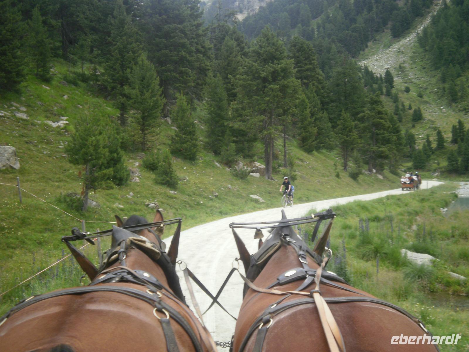 Gegen Mittag fuhren wir dann mit unserem Bus in das nur wenige Kilometer entfernte Pontresina. Das namhafte Engadiner Dorf ist Ausgangspunkt für einmalige Naturerlebnisse. Hier erwarteten uns mehrere Pferdekutschen, die uns in das wildromantische Val Roseg mit dem imposanten Roseggletscher brachten. Hier erlebten wir die Natur hautnah und waren weit weg von Lärm und Stress... - es war einfach herrlich! Zum Glück war auch der Wettergott auf unserer Seite.