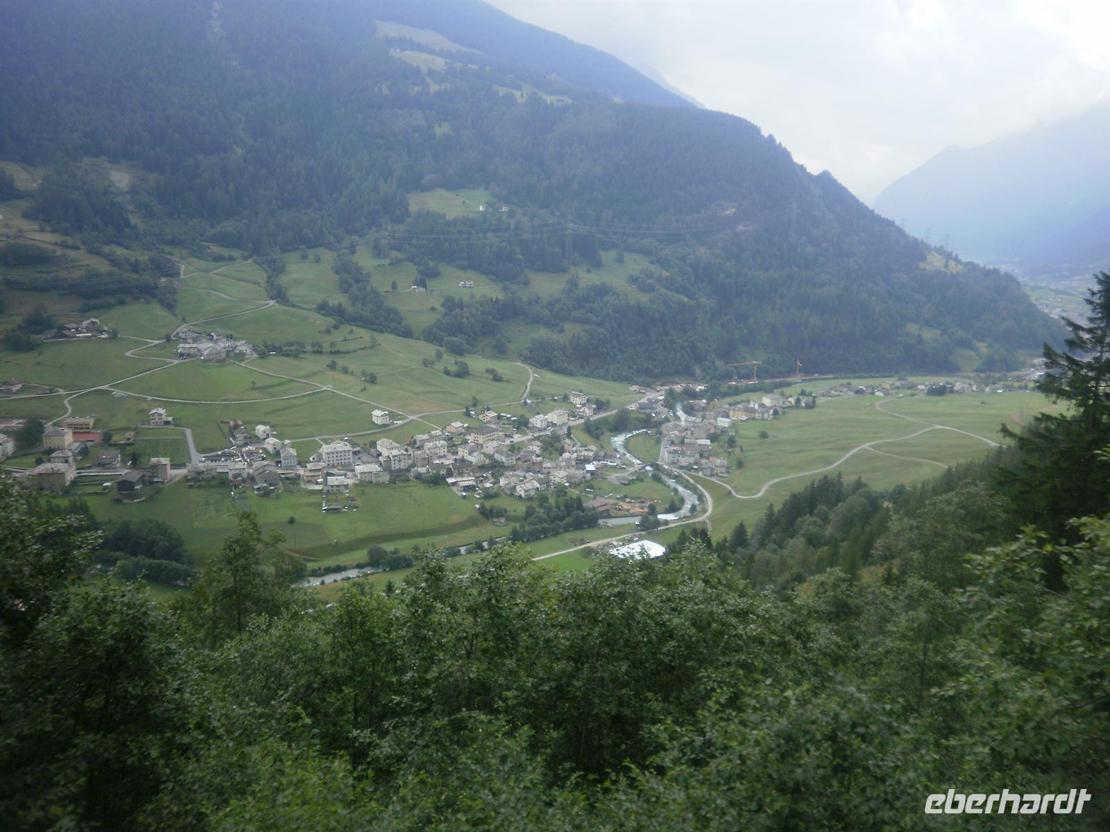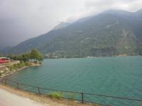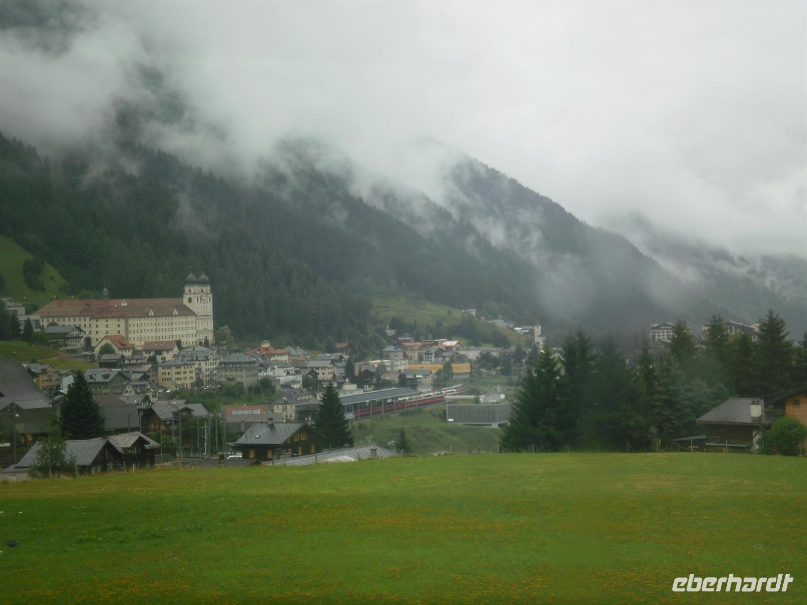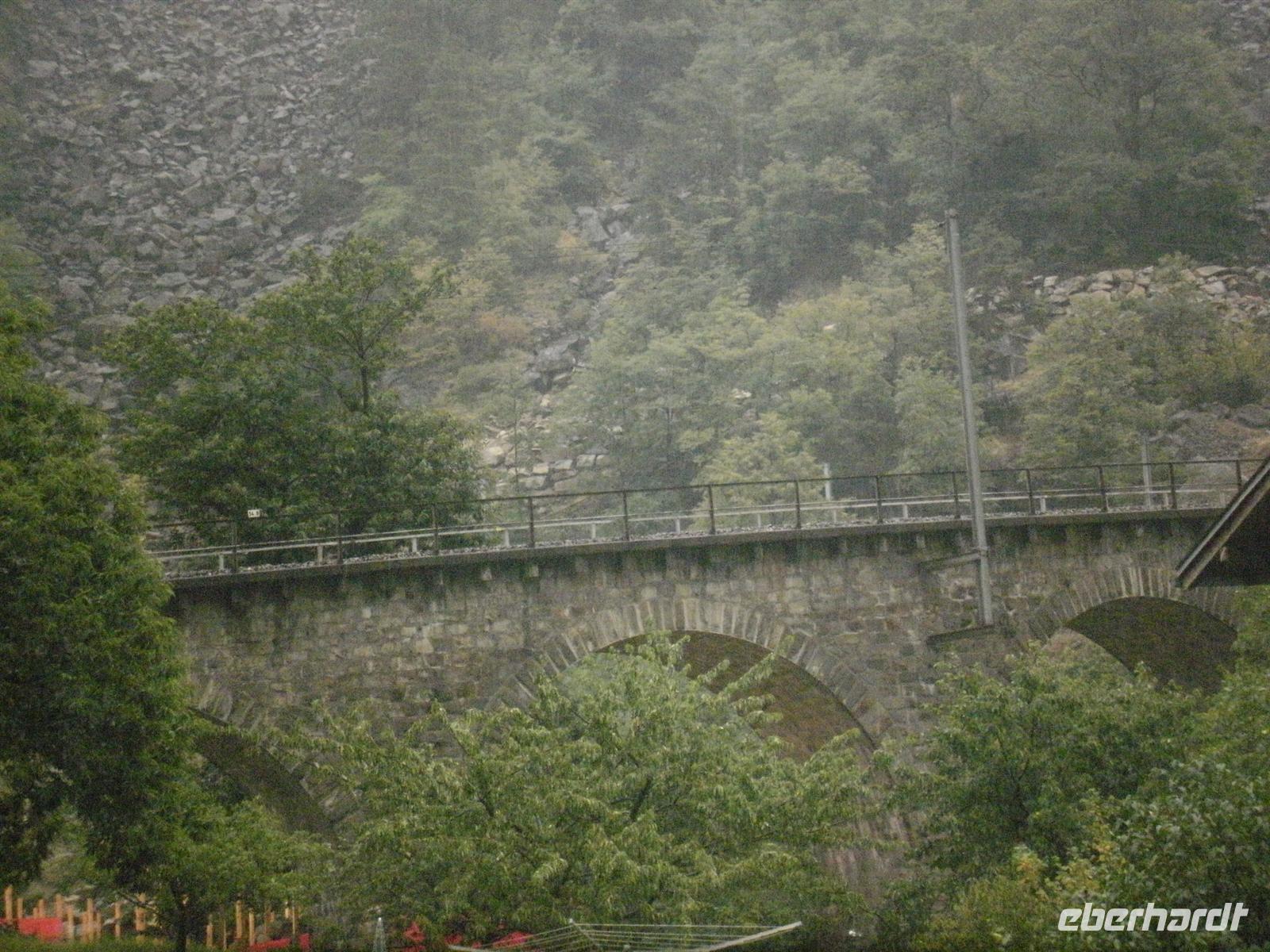 Die Bernina-Linie ist die einzige Schweizerbahn, die offen über die Alpen führt. Sie wurde 1910 fertig gestellt und brachte uns von den Gletschern des Berninapasses auf 2.253 m ü. d. M. hinunter auf 429 m ü. d. M. nach Tirano. Während der Höhenunterschied zwischen Ospizio Bernina und Tirano 1.824 Meter beträgt, misst die Horizontaldistanz nur 22 Kilometer. Diese Höhendifferenz wird ohne Zahnrad-Strecken überwunden - trotz Steigungen von bis zu 70o/oo. Das ist das absolute Maximum, das eine Adhäsionsbahn noch nutzbringend bewältigen kann. Besonders raffiniert ist übrigens auch die Wahl der Linienführung. Sie ermöglicht nicht nur die Überwindung der immensen Höhenunterschiede, sie eröffnet dem Reisenden auch atemberaubende Ausblicke auf eine imposante Bergwelt, auf Gletscher und Täler. Gegen Mittag kamen wir schließlich nach einer etwa 2,5-stündigen Fahrt im Bernina-Express im italienischen Tirano an und die meisten von uns gingen zum Mittagessen ins Restaurant "Al Portici". Einige von uns probierten auf meine Empfehlung hin eine Spezialität dieser Gegend, nämlich "Pizzoccheri". Das ist eine Mischung aus Buchweizennudeln, Spinat, Karotten, Knoblauch, Zwiebeln und das alles mit Butter und Käse überbacken. Dazu gab es für einige ein Glas Hauswein, natürlich aus dieser Gegend - dem milden Veltlin. Wir hatten übrigens angenehme Temperaturen um die 25 Grad, aber leider etwas Regen. Einige von uns nutzten trotz allem noch die Gelegenheit und spazierten zur Wallfahrtkirche "Madonna di Tirano" - diese Kirche mit ihren herrlichen Fresken hatte heute sogar ihre Türen geöffnet, denn meistens ist sie über die Mittagszeit geschlossen - wie fast alle Geschäfte hier! In Italien pflegt man nämlich die Tradition der Siesta und ein altes römische Sprichwort sagt: "Zu dieser Zeit sind nur Hunde und Franzosen unterwegs...".