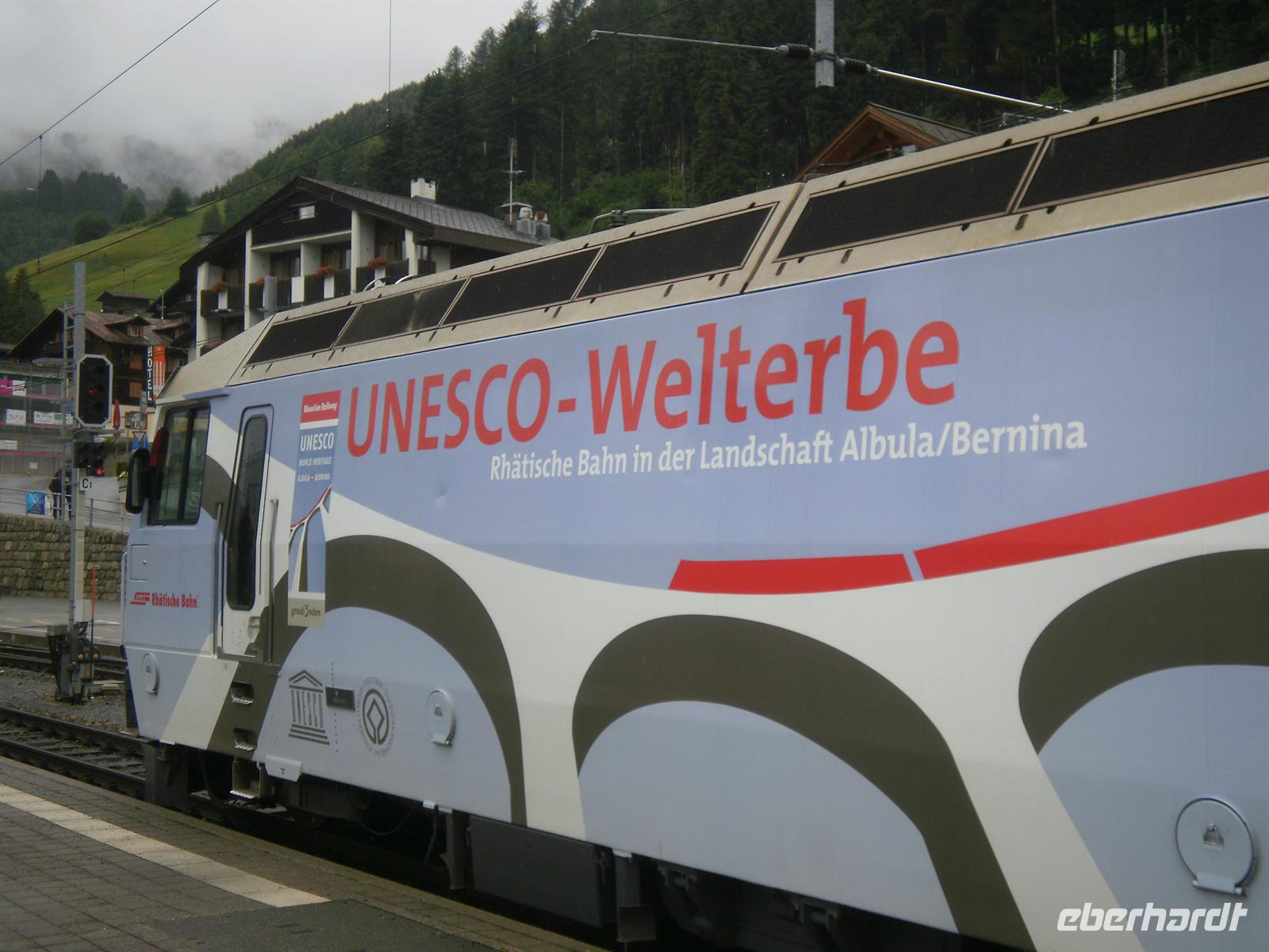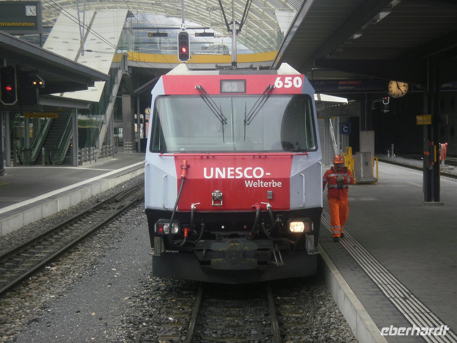 Am Morgen spazierten wir gemeinsam zum nur wenige Gehminuten vom Hotel entfernten Bahnhof von St. Moritz. Zuvor verabschiedeten wir uns von unserem Buschauffeur André, der allein mit dem Bus und unserem Gepäck die etwa 160 Kilometer lange Strecke bis Andermatt zurücklegte. Die eigentlich vorgesehene komplette Glacier-Strecke bis Zermatt konnten wir leider aufgrund einer teilweisen Sperrung der Strecke des Glacier-Express zwischen Fiesch und Lax nicht fahren.
