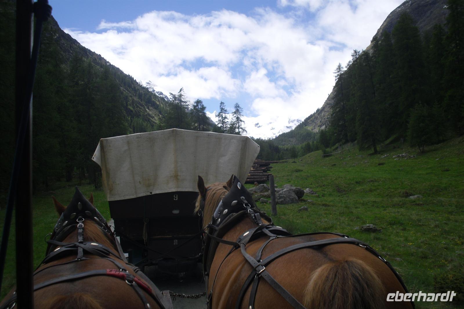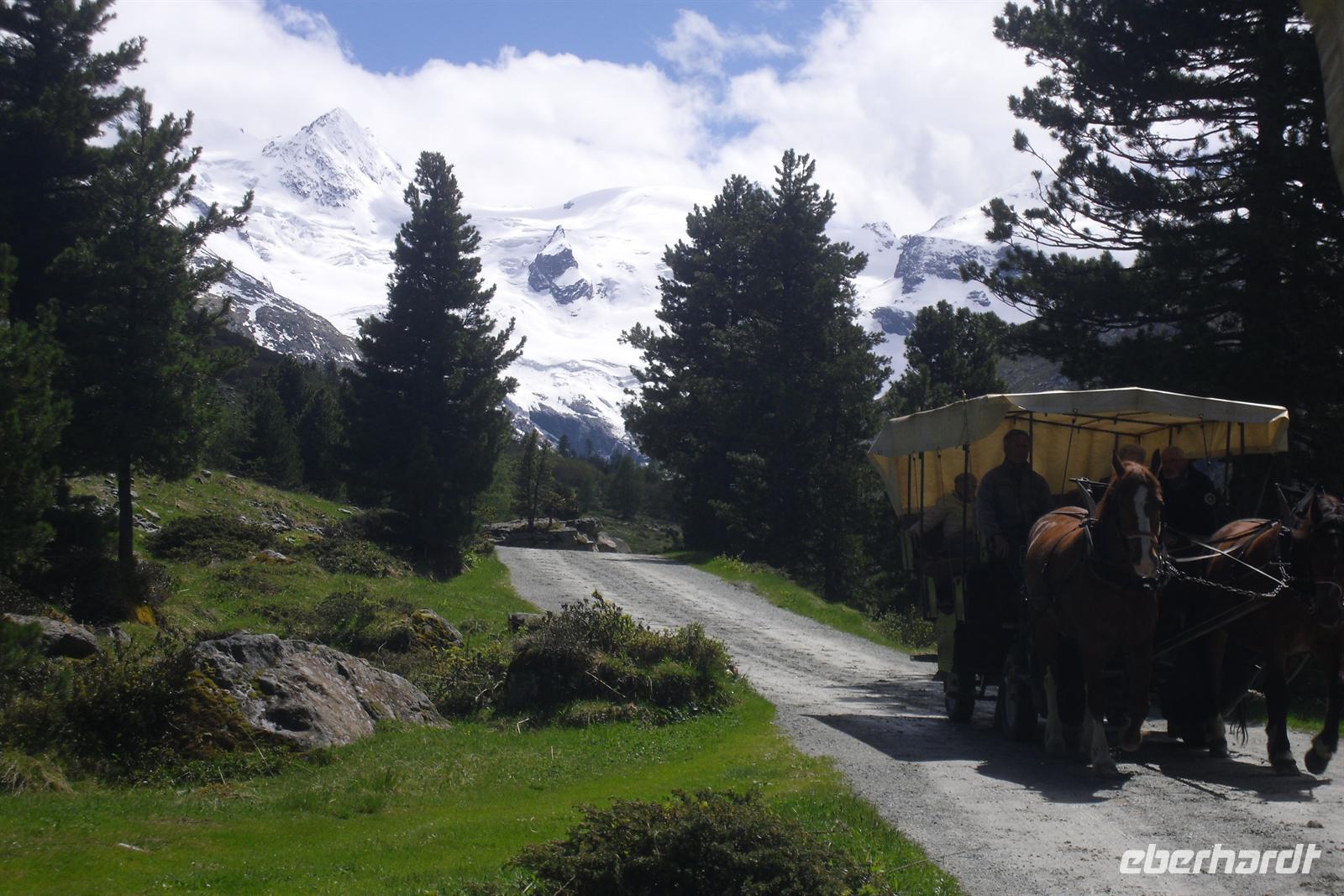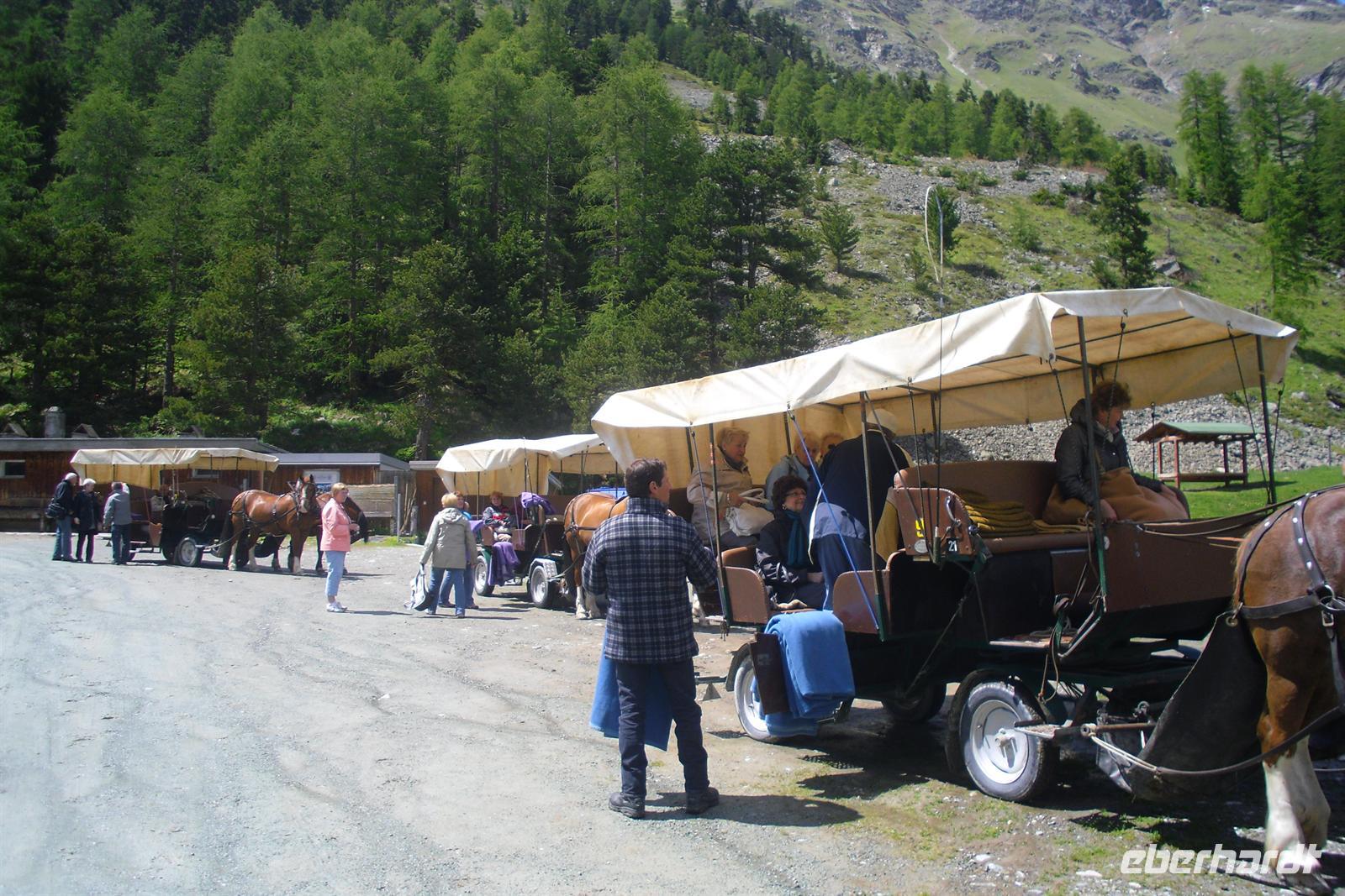 Am Ende der Führung statteten wir dem Traditionscafé "Hauser" einen Besuch ab, hier konnten wir übrigens eine typische Bündner Spezialität - die Bündner Nusstorte - probieren. Gegen Mittag fuhren wir dann mit unserem Bus in das nur wenige Kilometer entfernte Pontresina. Das namhafte Engadiner Dorf ist Ausgangspunkt für einmalige Naturerlebnisse. Hier erwarteten uns mehrere Pferdekutschen, die uns in das wildromantische Val Roseg mit dem imposanten Roseggletscher brachten. Hier erlebten wir die Natur hautnah und waren weit weg von Lärm und Stress... - es war einfach herrlich! Leider war der Wettergott heute nicht so ganz auf unserer Seite - ein Wechselbad der Gefühle, mal Sonne und kurz darauf wieder Regen!
