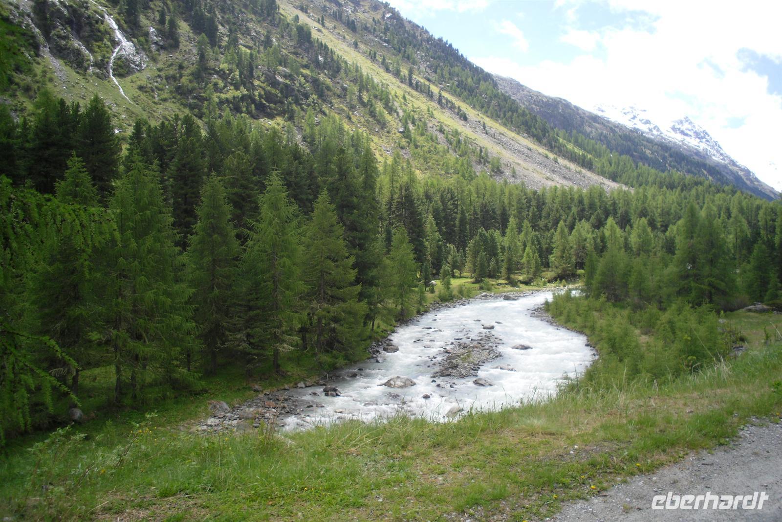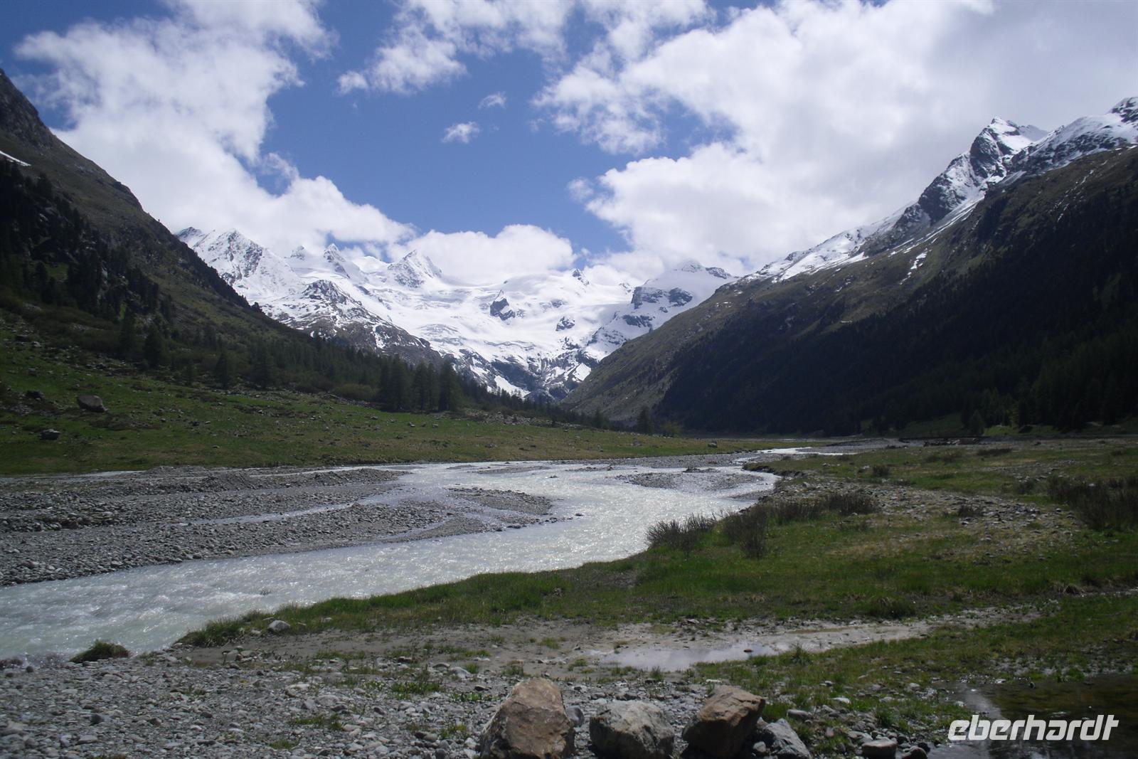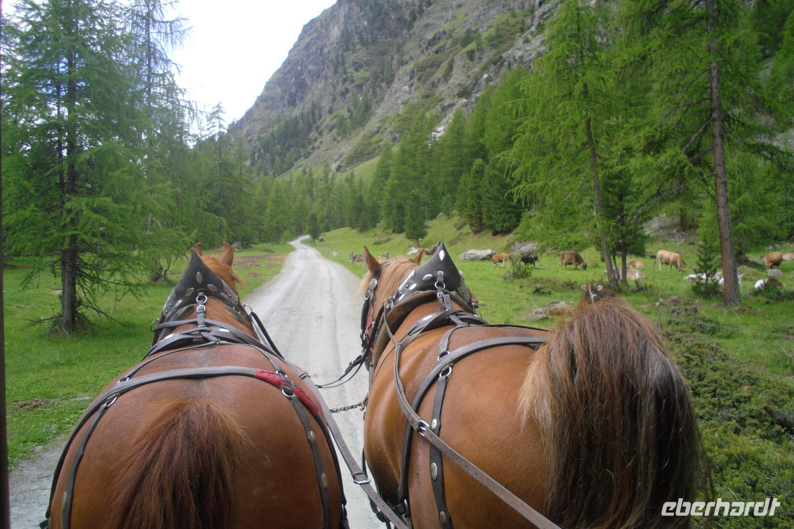Am Ende der Führung statteten wir dem Traditionscafé "Hauser" einen Besuch ab, hier konnten wir übrigens eine typische Bündner Spezialität - die Bündner Nusstorte - probieren. Gegen Mittag fuhren wir dann mit unserem Bus in das nur wenige Kilometer entfernte Pontresina. Das namhafte Engadiner Dorf ist Ausgangspunkt für einmalige Naturerlebnisse. Hier erwarteten uns mehrere Pferdekutschen, die uns in das wildromantische Val Roseg mit dem imposanten Roseggletscher brachten. Hier erlebten wir die Natur hautnah und waren weit weg von Lärm und Stress... - es war einfach herrlich! Leider war der Wettergott heute nicht so ganz auf unserer Seite - ein Wechselbad der Gefühle, mal Sonne und kurz darauf wieder Regen!