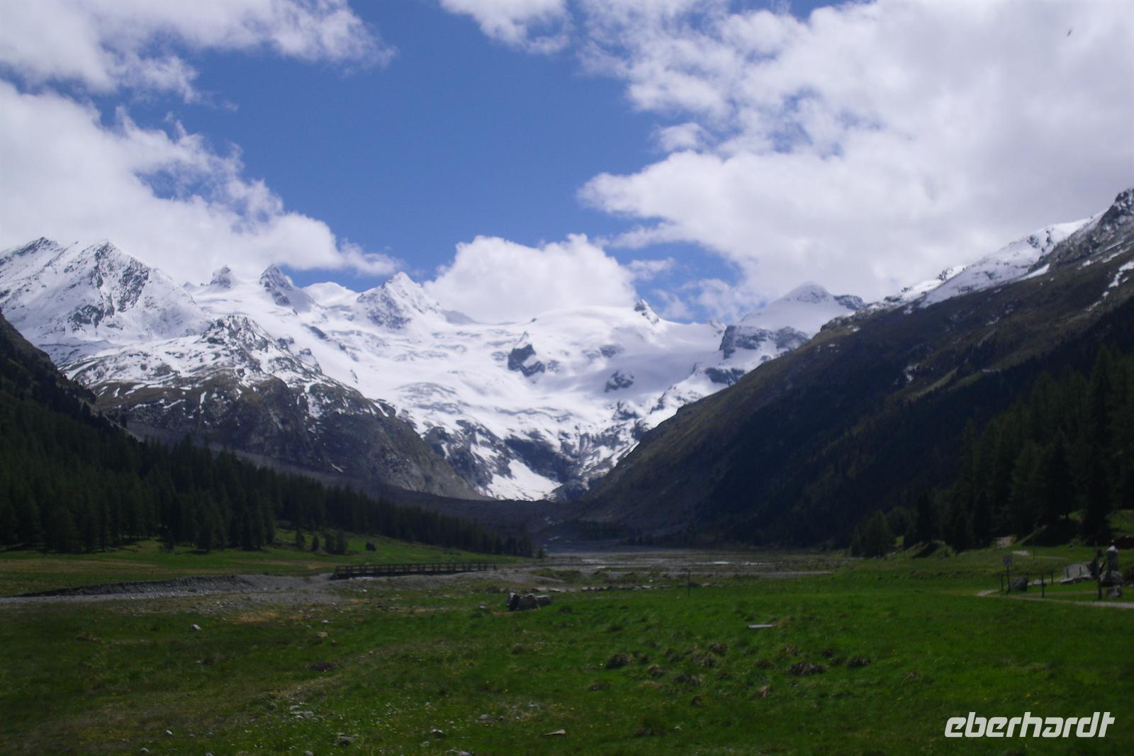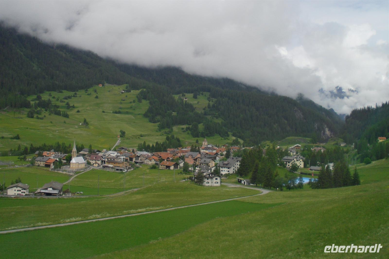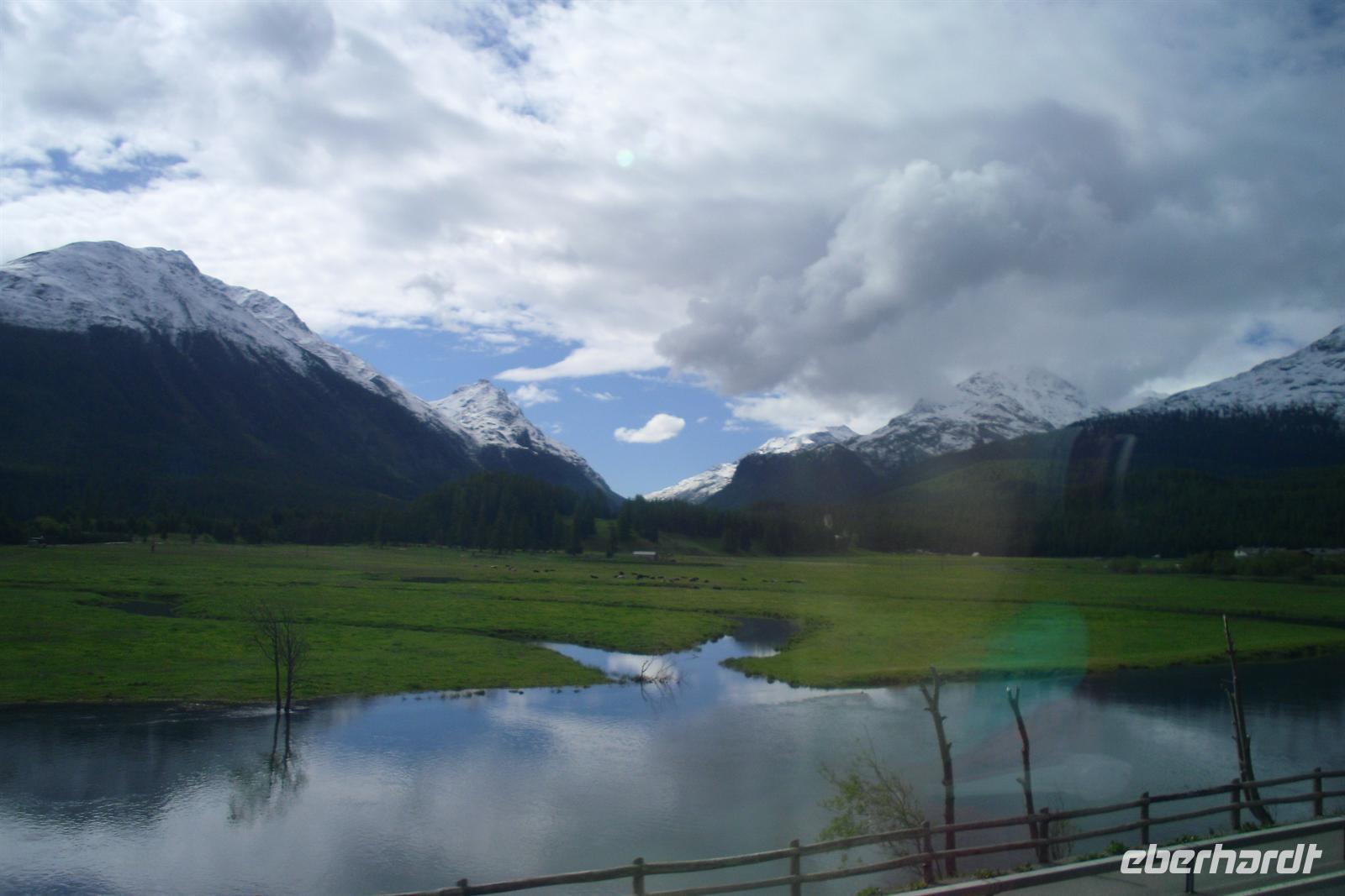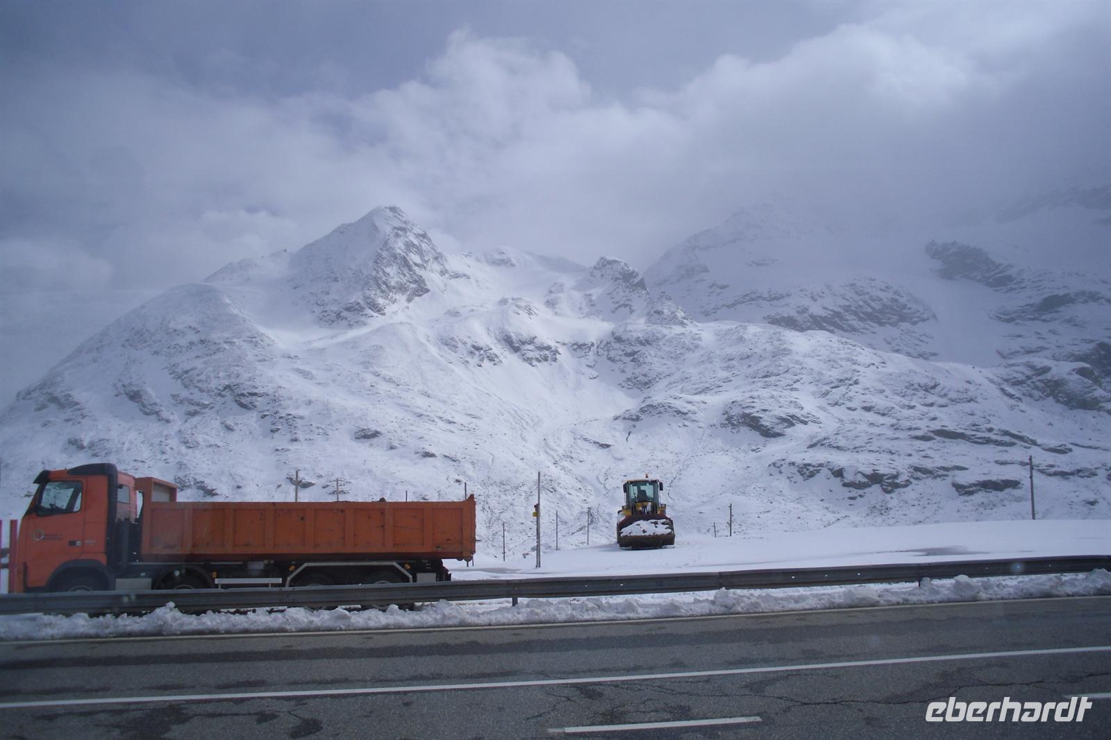 Das ist eine Mischung aus Buchweizennudeln, Spinat, Karotten, Knoblauch, Zwiebeln und das alles mit Butter und Käse überbacken. Dazu gab es ein Glas Hauswein, natürlich aus dieser Gegend - dem milden Veltlin. Einige von uns nutzten auch die Gelegenheit und spazierten zur Wallfahrtkirche "Madonna di Tirano" - diese Kirche mit ihren herrlichen Fresken hatte heute sogar ihre Türen geöffnet, denn meistens ist sie über die Mittagszeit geschlossen - wie fast alle Geschäfte hier! In Italien pflegt man nämlich die Tradition der Siesta und ein altes römische Sprichwort sagt: "Zu dieser Zeit sind nur Hunde und Franzosen unterwegs...". Für uns ging es nun mit dem Bus zurück. Nach kurzer Zeit erreichten wir wieder den Grenzübergang Italien - Schweiz und wie versprochen, legten wir auf der Rückfahrt ein paar Foto-Stopps ein, denn während unserer Bahnfahrt am Vormittag durften wir leider nicht aussteigen. Brusio sollte unser erstes Ziel sein, denn dort erlebt man eine wahre Einzigartigkeit - der Bernina-Express beschreibt eine Schleife über einen Kreisviadukt. 107 Meter ist er lang, und er dürfte zu den meistfotografierten Bauwerken der Rhätischen Bahn zählen. Diese 360-Grad-Kehre bringt wertvolle Höhenmeter, ein Griff in die Trickkiste der Bahnbauer, der sonst nur bei Kehrtunnels angewendet wird. Wir warteten auf einen Bernina-Zug, damit unser Foto perfekt war. Weiter hinauf ging es zum Lago di Poschiavo. Durch die Ortschaften des Val di Poschiavo, einem italienisch-sprachigen Südtal des Kantons Graubünden, erreichten wir die Bernina-Passstraße. Diese ist gewöhnlich ganzjährig geöffnet und stellt die Verbindung zwischen dem Puschlav im Süden und dem Engadin im Norden dar. Damit ist der Pass gleichzeitig eine Sprachgrenze. Eine gelbe Tafel auf dem Pass signalisiert die Europäische Wasserscheide, das Wasser in Richtung Süden gelangt über die Flüsse Poschiavino, Adda und Po ins Adriatische Meer und das Wasser in Richtung Norden wird über den Inn und die Donau ins Schwarze Meer geleitet. Nach einem Aufenthalt auf dem Bernina-Pass ging es mit einem kurzen Stopp mit Blick auf den Morteratsch-Gletscher zurück nach St.Moritz. Ein erlebnisreicher Tag war jetzt zu Ende - es war ein "Wintermärchen", und das mitten im Juni!