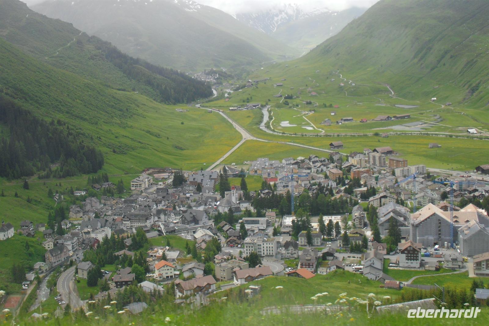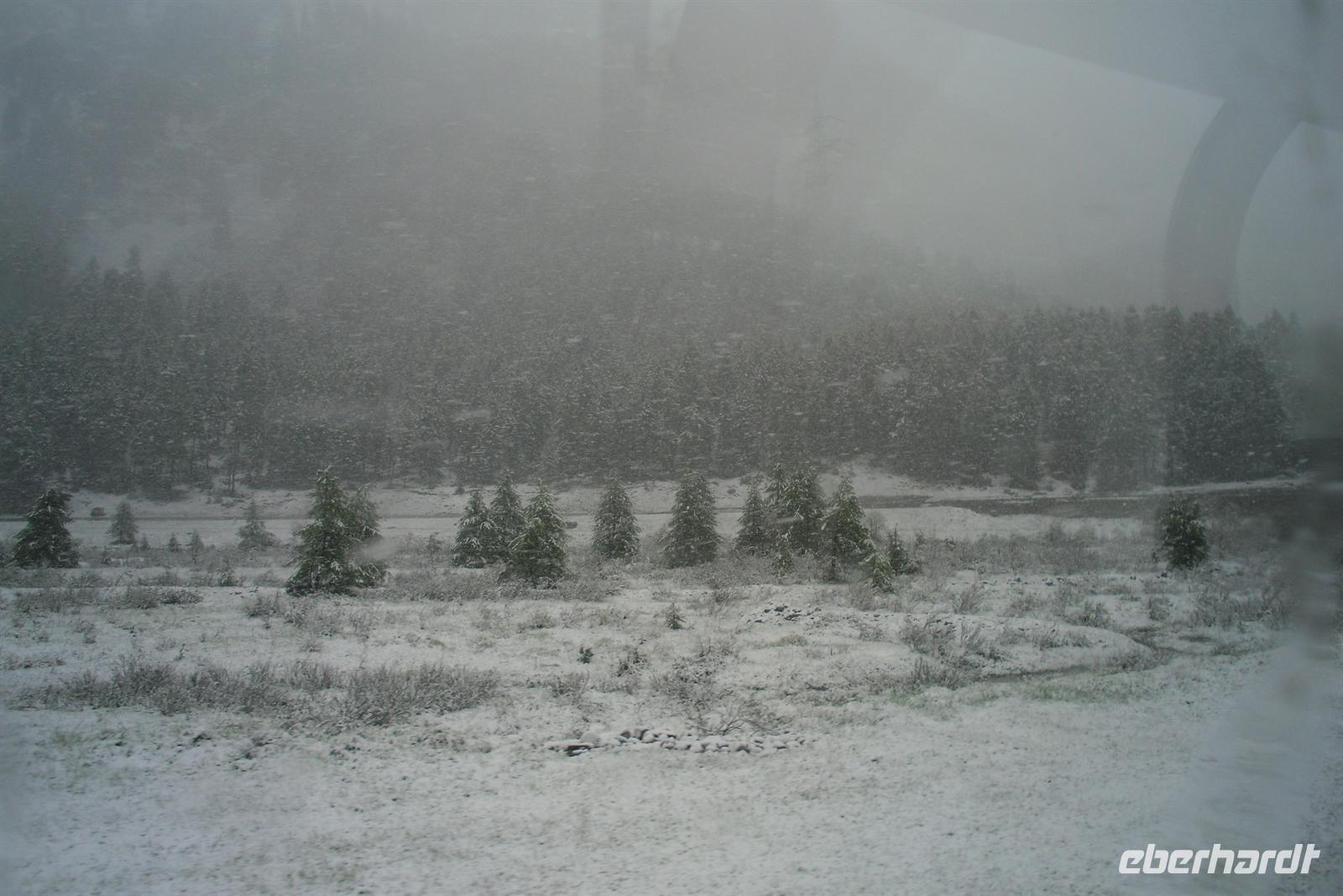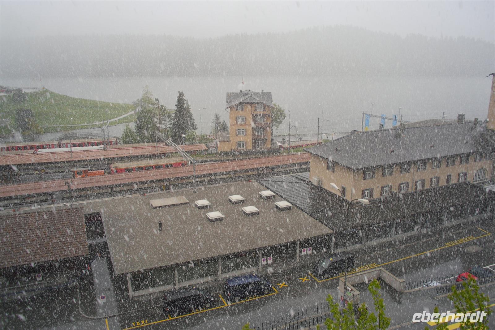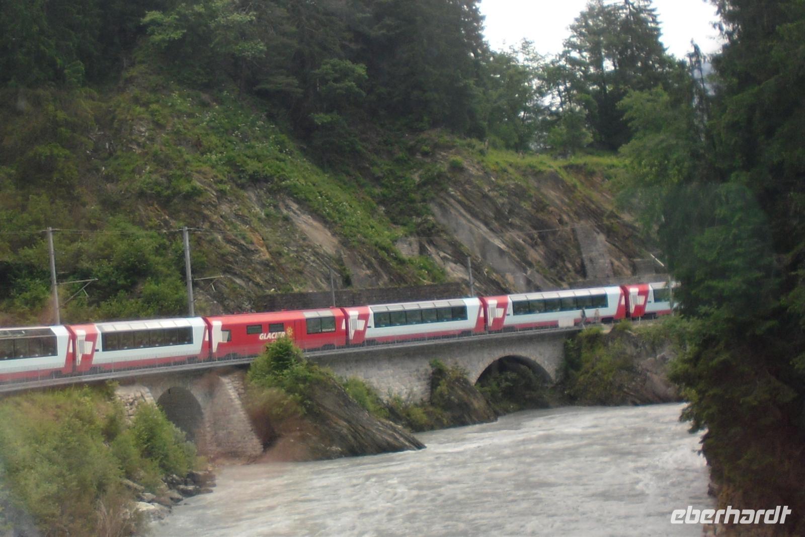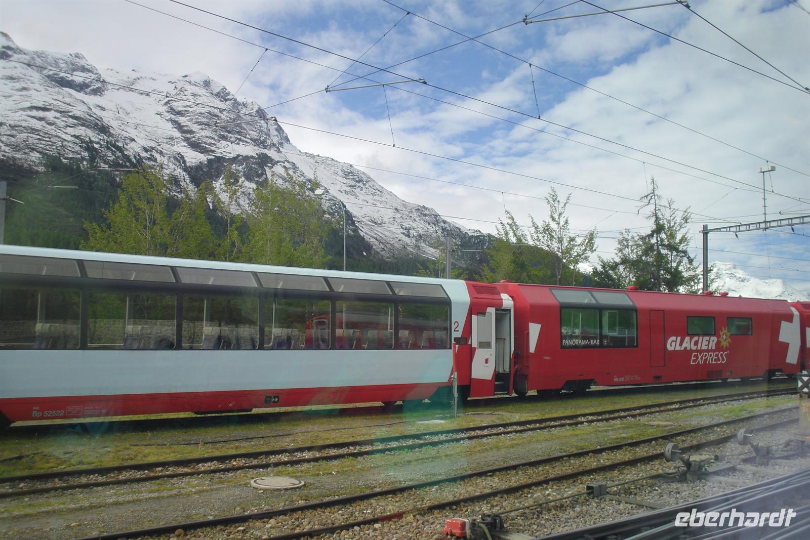 Bahnhof von St. Moritz. Zuvor verabschiedeten wir uns von unserem Buschauffeur André, der allein mit dem Bus und unserem Gepäck die etwa 280 Kilometer lange Strecke bis Täsch zurücklegte. Nachdem wir es uns in unserem Panoramawagen der 1. Klasse gemütlich gemacht hatten, ging es über Filisur, Tiefencastel, Thusis, Chur, Reichenau, die Vorderrheinschlucht, Disentis, über den 2.033 Meter hohen Oberalppass, Andermatt und Brig nach Zermatt. Die Bahnfahrt mit dem langsamsten Schnellzug der Welt dauerte etwa acht Stunden, aber keine Angst - niemandem von uns wurde langweilig. Das Landschaftsbild veränderte sich ständig und es gab verdammt viel zu sehen...! Zudem wurden wir mit einem schmackhaften Mittagessen verwöhnt.