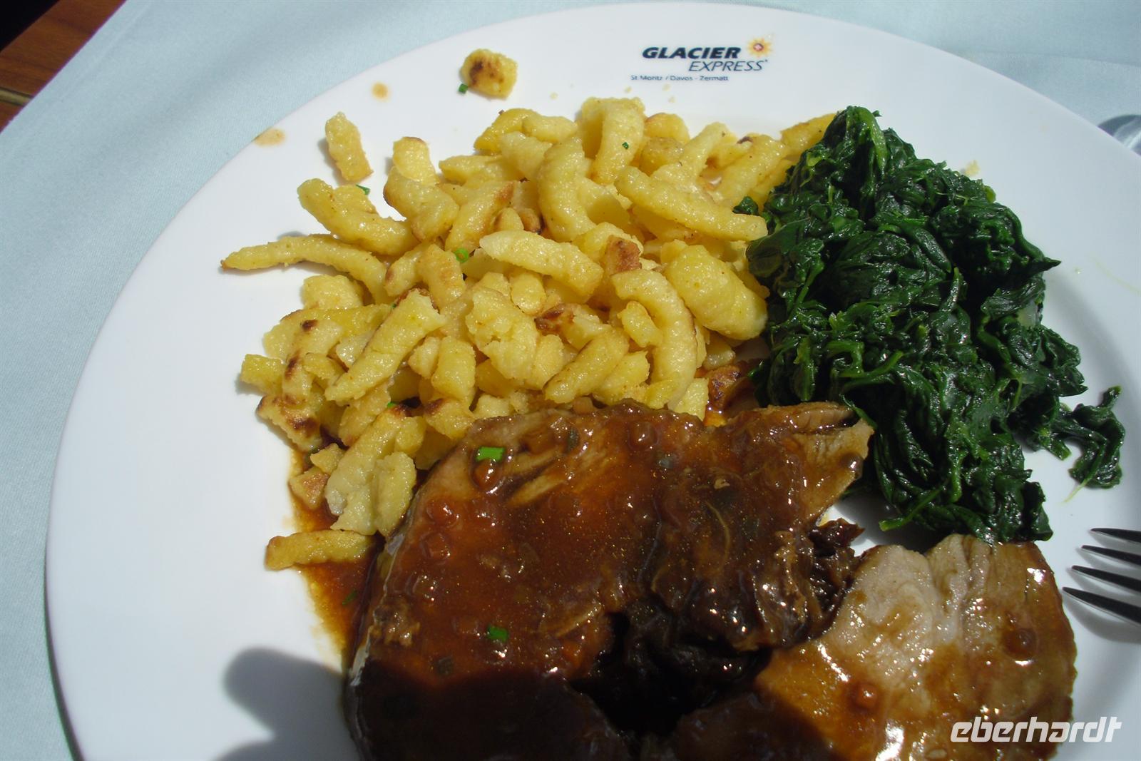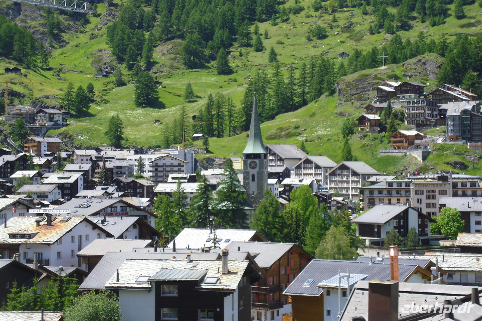 Der Glacier-Express fährt übrigens mit einer Durchschnittsgeschwindigkeit von etwa 35 Kilometern pro Stunde. Am späten Nachmittag erreichten wir den Bahnhof des autofreien Zermatt und unternahmen gemeinsam einen kleinen Ortsspaziergang, um uns sofort mit den wichtigsten Sehenswürdigkeiten vertraut zu machen. Im Hotel "National", unserem Domizil für weitere zwei Nächte, war bereits alles für unsere Ankunft vorbereitet. Um unser Gepäck brauchten wir uns übrigens nicht zu kümmern, denn dieses wurde bereits am Bahnhof in Täsch vom Bus in Gepäckwagen der Bahn umgeladen, mit dem Pendelzug gelangte es dann zum Bahnhof Zermatt und letztendlich wurde es mit dem hoteleigenen Elektroauto in Zermatt abgeholt. Nach einem reichhaltigen Abendessen als 3-Gänge-Menü ging ein weiterer Tag voller unvergesslicher Eindrücke zu Ende.