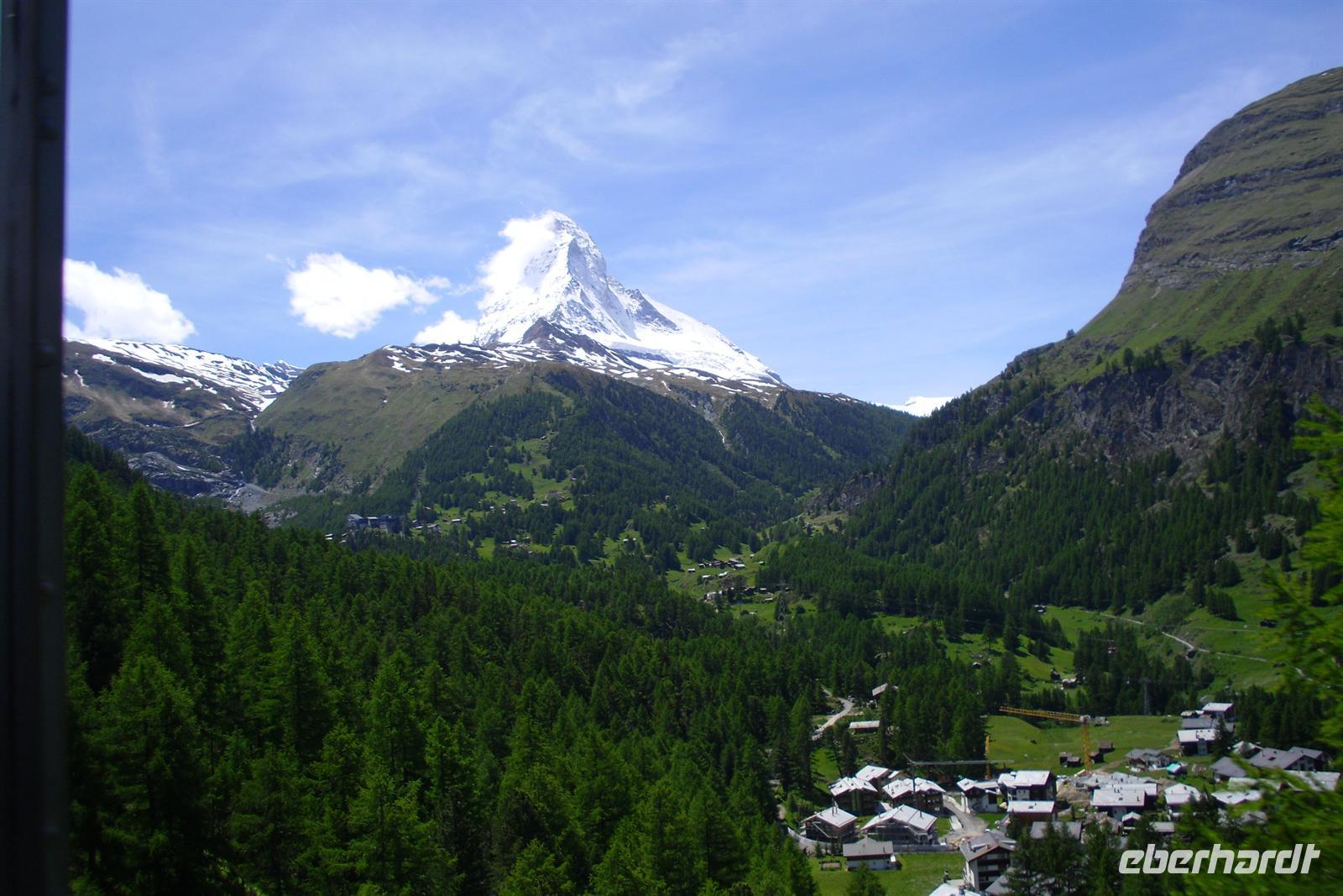 Am nächsten Morgen mussten wir dann leider schon wieder Abschied nehmen von dieser Region. Mit dem Pendelzug fuhren wir nach Täsch. Dort, ca. 5 Kilometer nördlich von Zermatt, mußte unser Bus parken, da Zermatt ein autofreier Ort ist. In Täsch angekommen, ging es dann gleich mit unserem Bus weiter.
