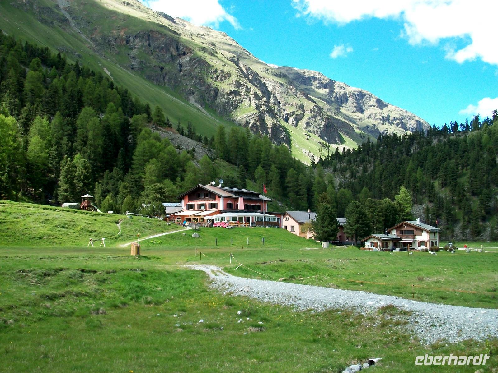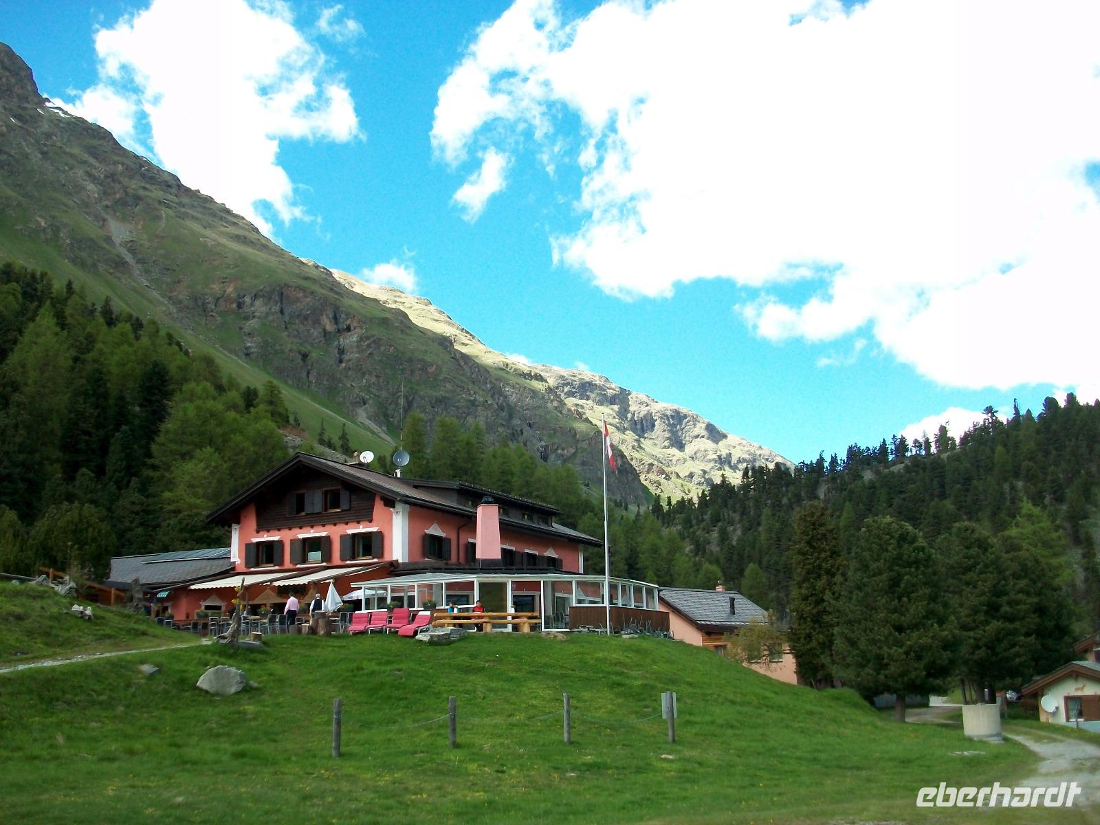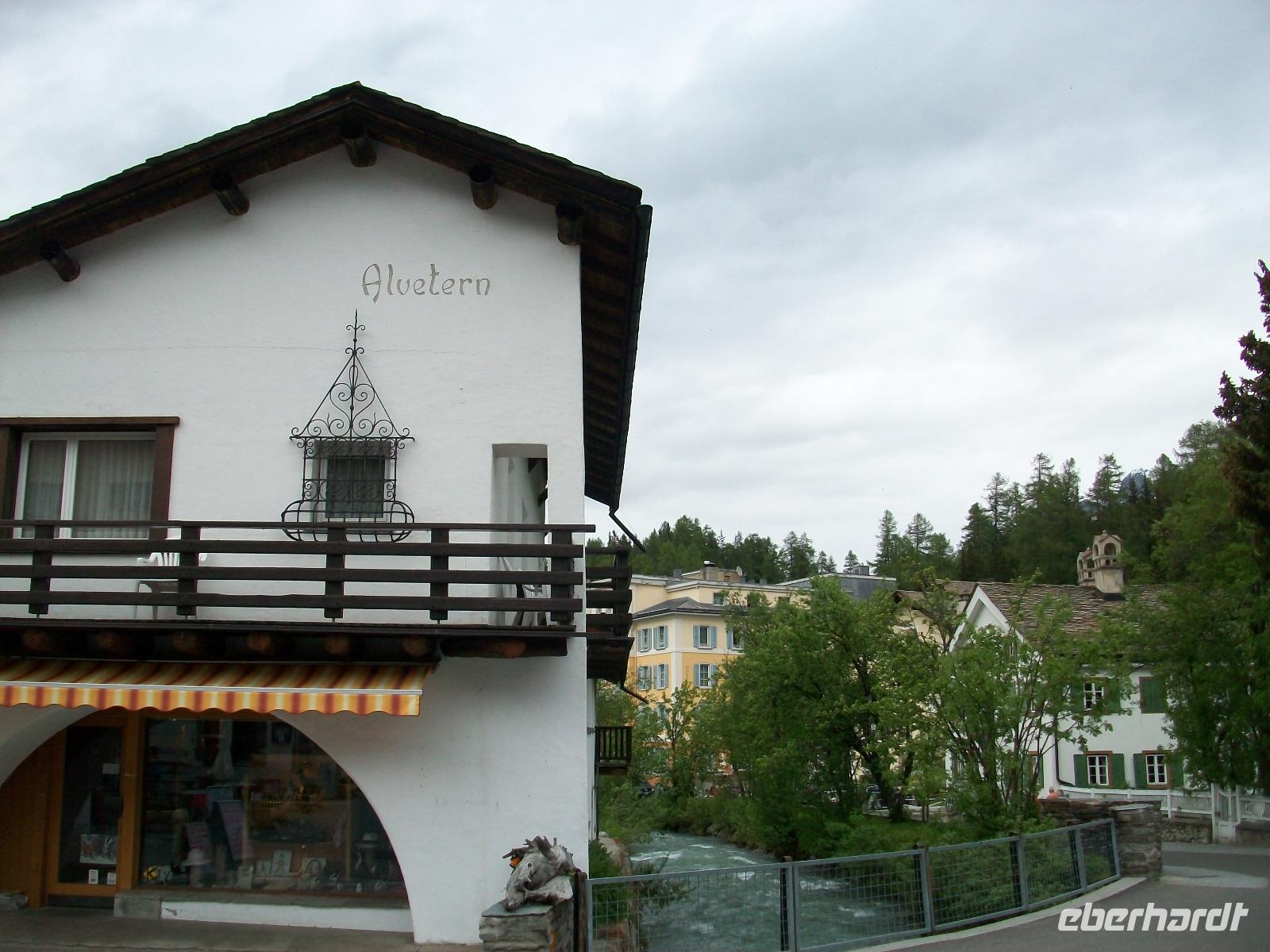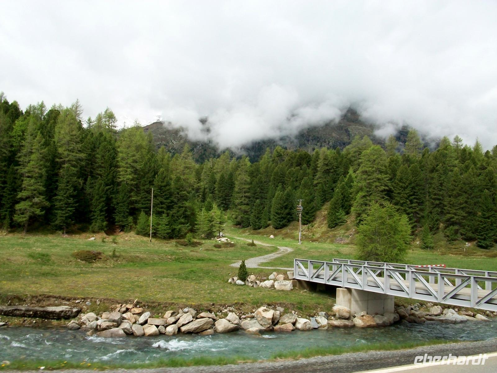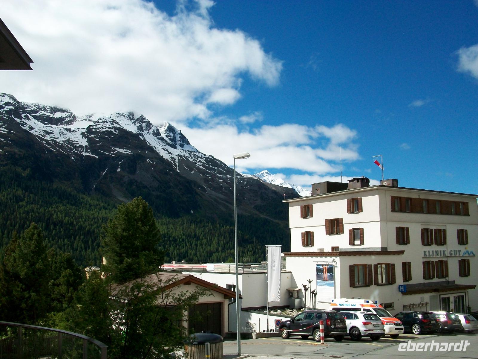 21.6.2016. Beim ersten Blick aus dem Fenster sehen wir zunächst dicke Wolken über den Engadiner Bergen hängen. Aber das Wetter soll sich bessern.