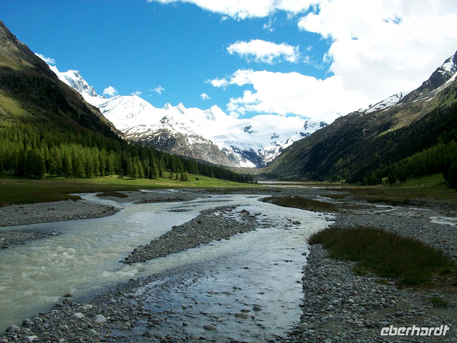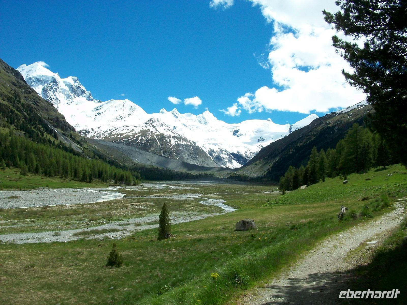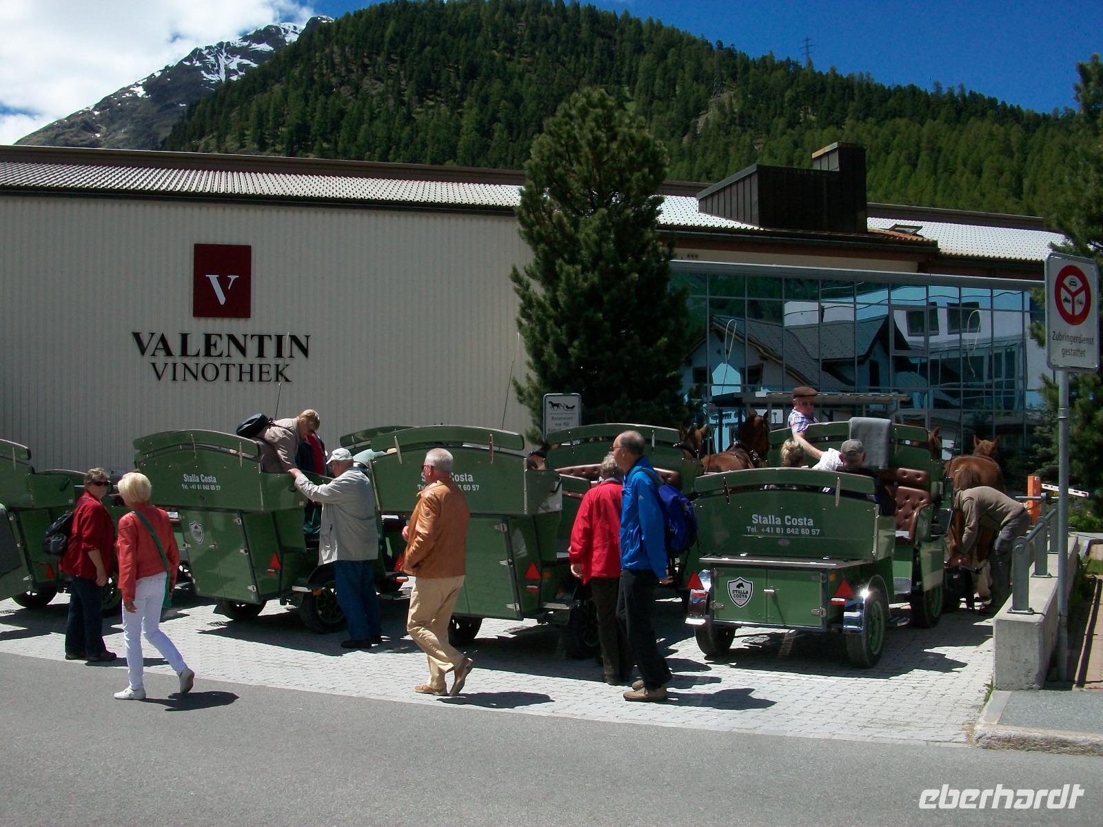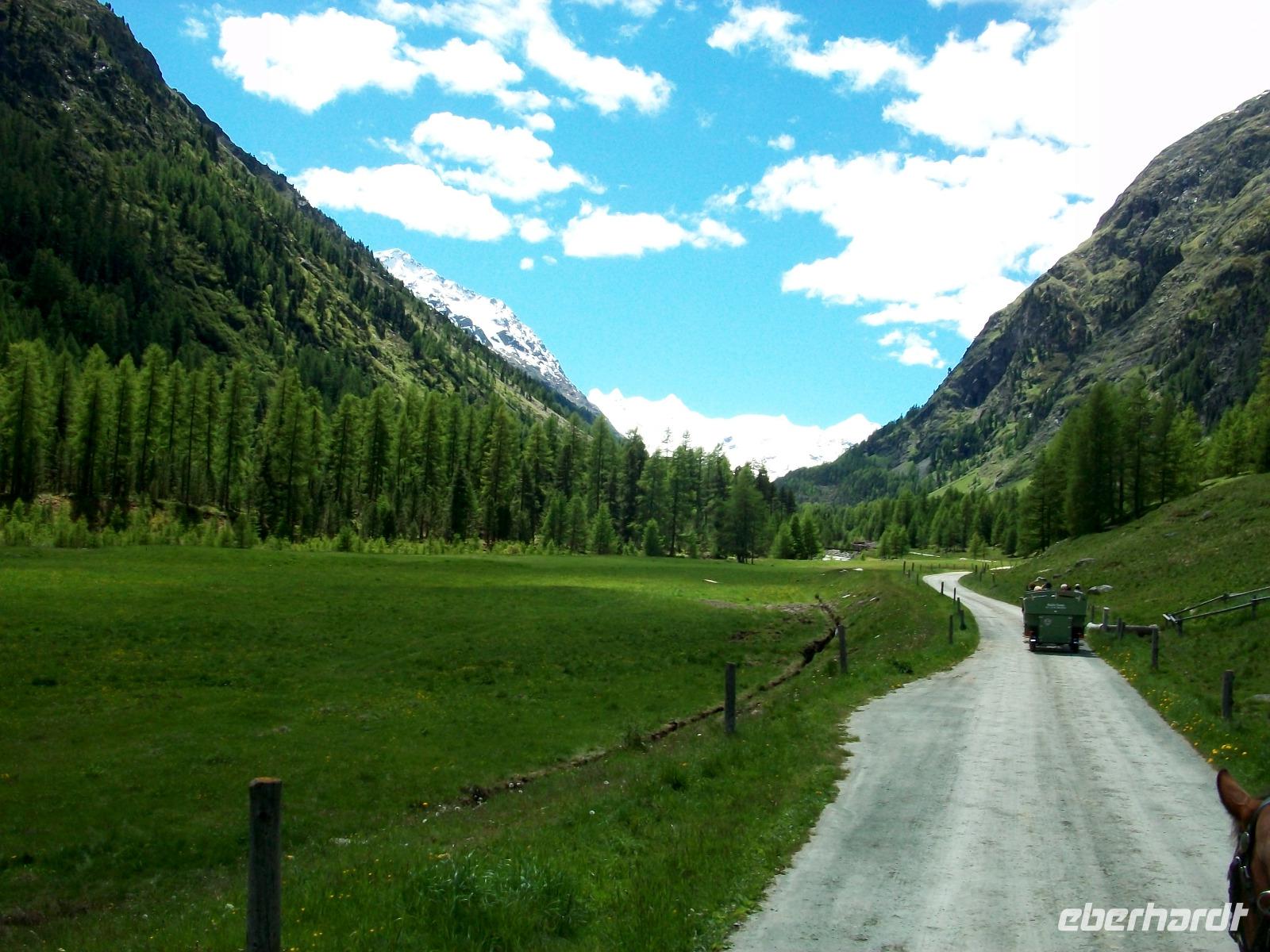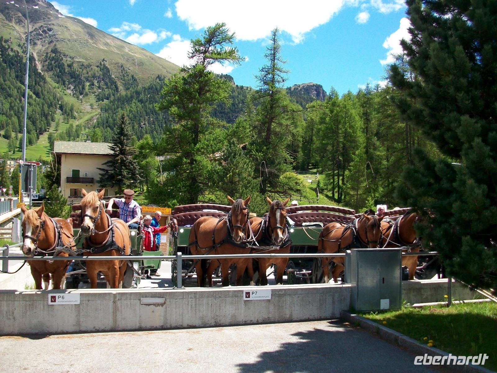 13.00 Uhr. Die Sonne lacht vom blauen Himmel herab an dem weiße Wölkchen langsam ihre Bahn ziehen. Am Bahnhof Pontresina stehen die Kutschen bereit die uns nun in das Tal Roseg fahren werden.