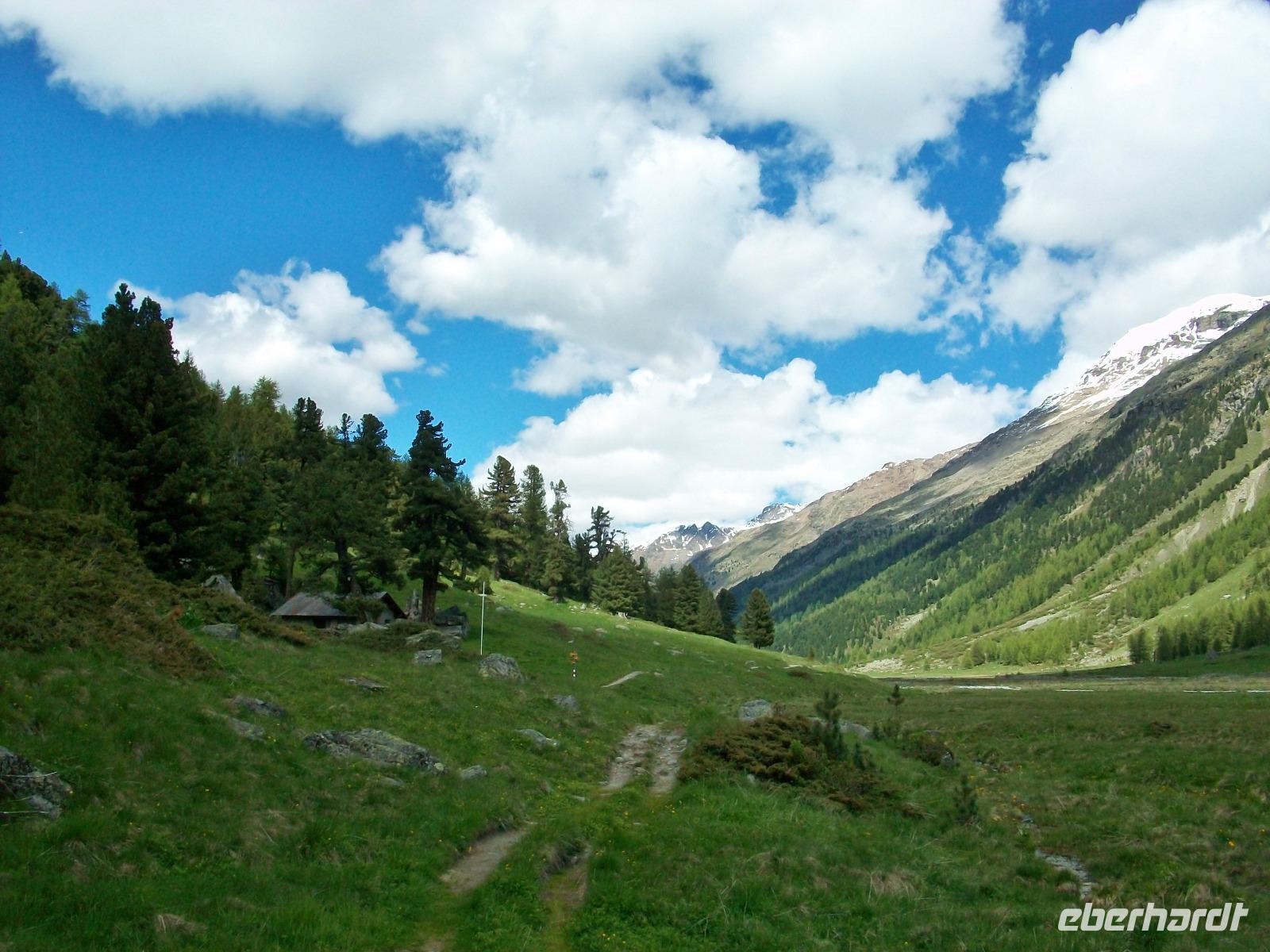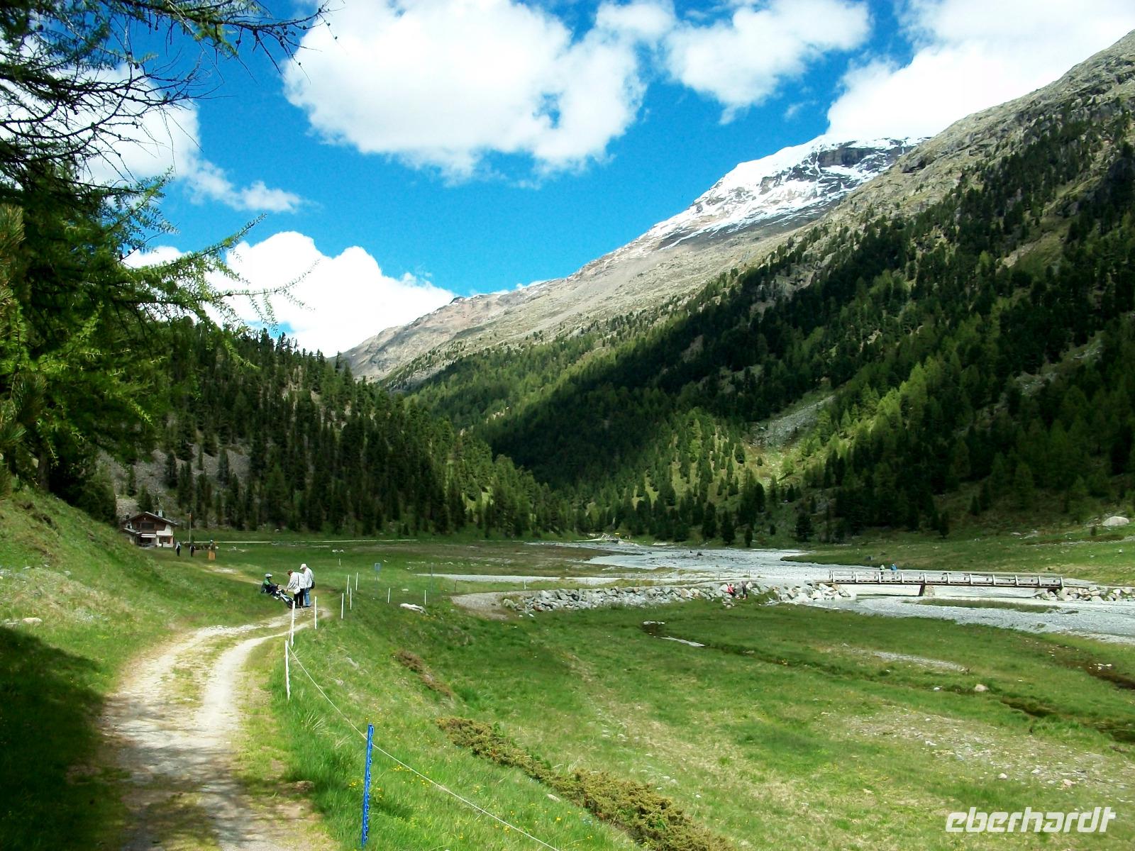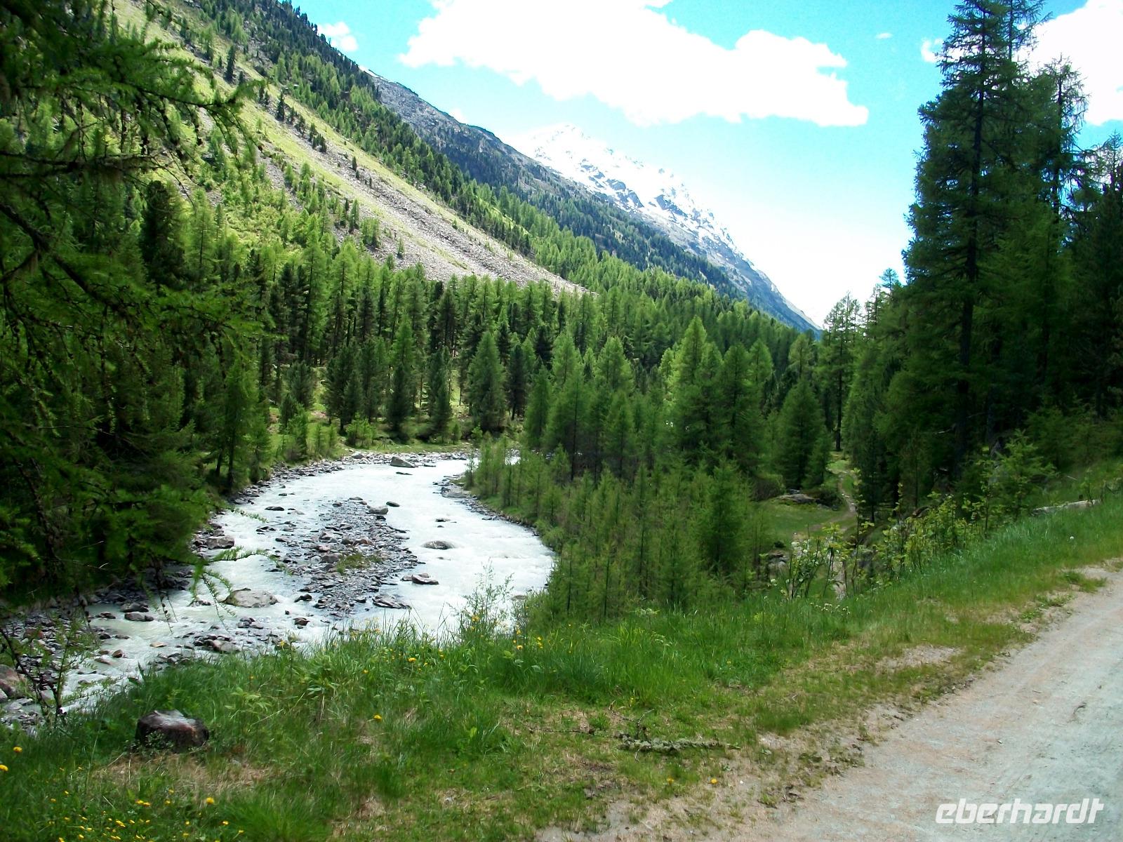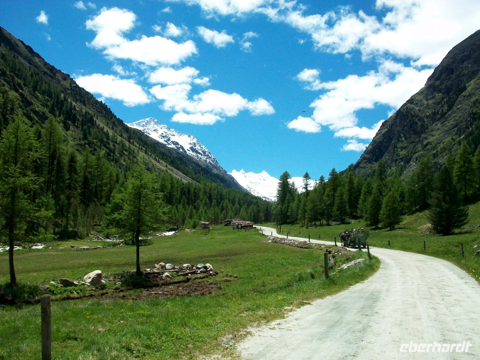 Und diese Fahrt kann romantischer nicht sein; wir gelangen durch das unberührte Grün des lichten Waldes durch den sich der Wildfluss windet und schäumend und tosend das Wasser zu Tal bringt. Die Pferde ziehen geduldig ihre Last und nach einer guten Stunde haben wir unser Ziel erreicht. Eine gewaltige Kulisse tut sich vor unseren Augen auf. Am Talende glitzert frisch gefallener Schnee weiß in der Sonne, während es hier unten im Tal grünt und blüht. Zur himmlischen Ruhe gesellt sich das Rauschen des Flusses, das ist Natur pur und bei einem Bummel durch diese schöne Landschaft können wir so richtig entspannen.