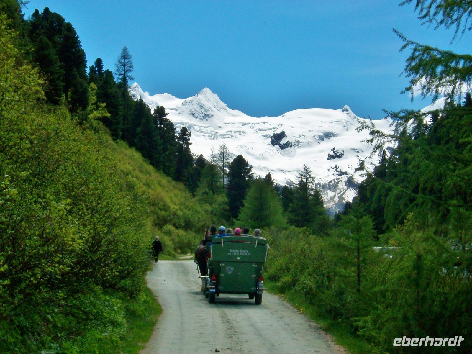 Über Andermatt gelangen wir dann durch den Furka - Basistunnel in das Rhonetal und folgen dem wilden Fluss bis nach Brig. Von da geht es nun stetig bergauf und über Sankt Nikolaus und Täsch gelangen wir zu unserem Ziel nach Zermatt.