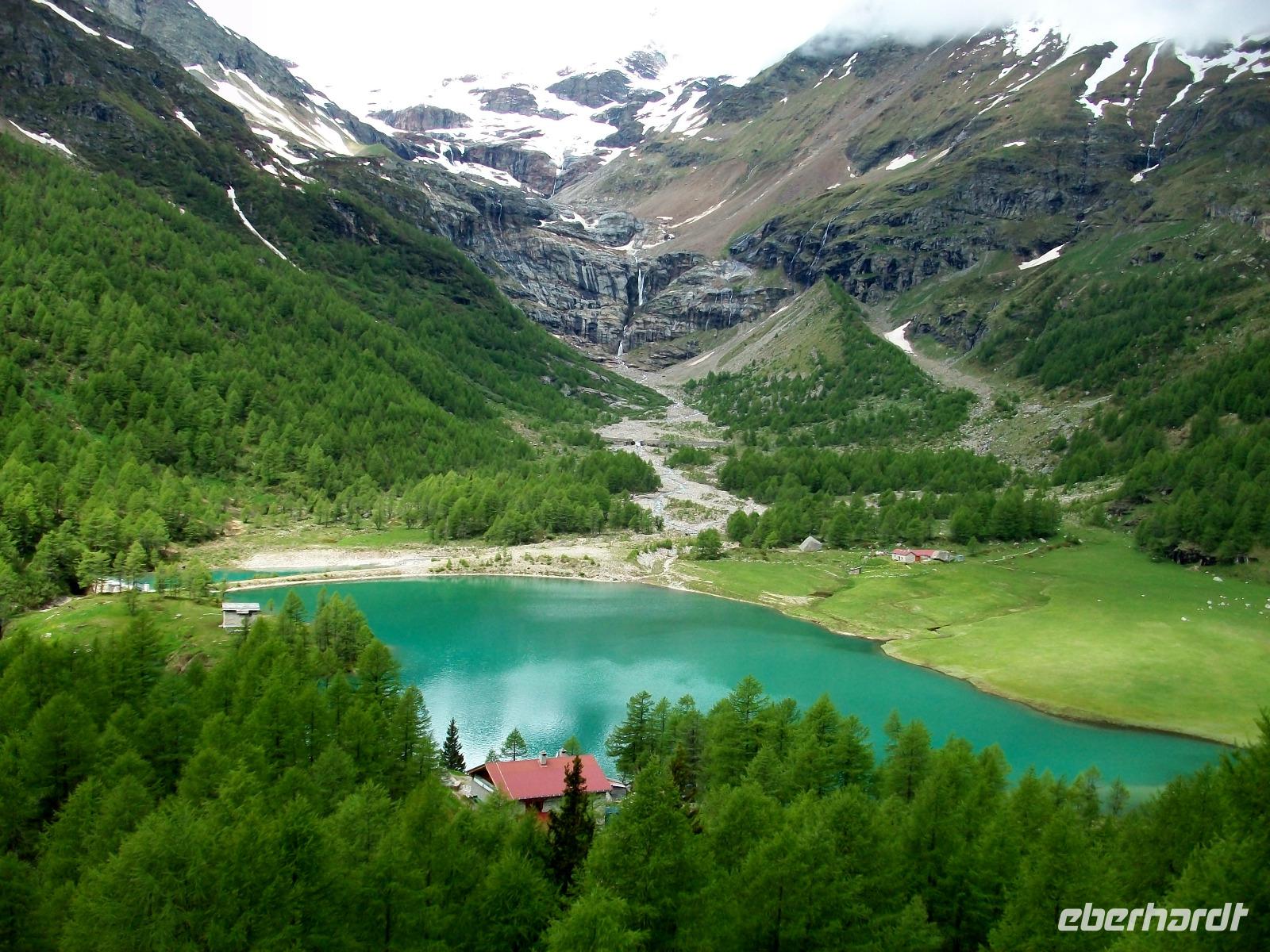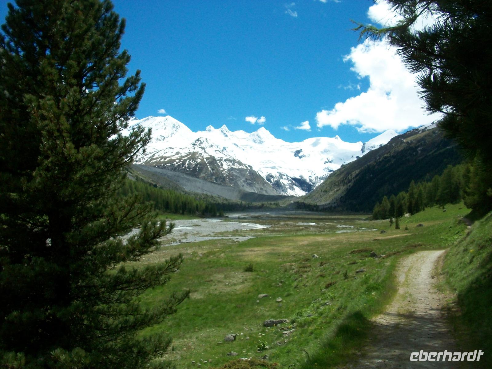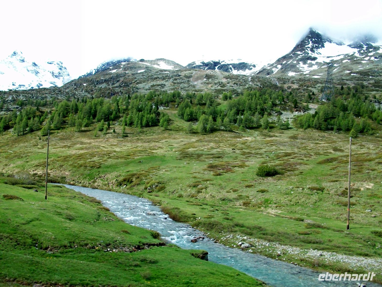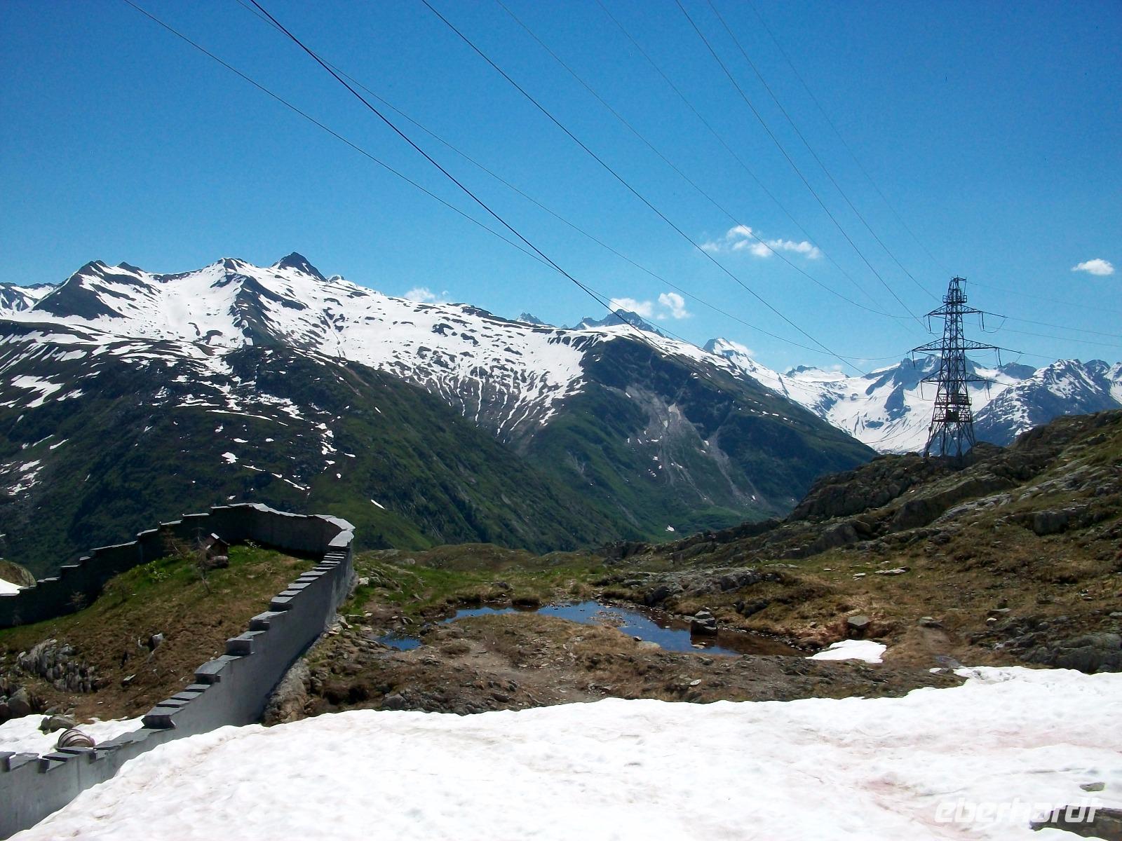Wir verlassen das grünende Tal, die Bäume machen niederem Bewuchs Platz und bald gelangen wir an Schneefeldern entlang. Schnell huscht ein Murmeltier am Zug entlang und nimmt Reißaus vor dem Ungetüm, unsere Fahrt jedoch geht unaufhaltsam nach oben. Bald taucht die grandioseste Bergkulisse vor unseren Augen auf die man sich nur vorstellen kann. Berge mir grellweißer Schneedecke kontrastieren vor dungelblauem Himmel, das Auge kann sich gar nicht satt sehen vor diesen Wundern der Natur.