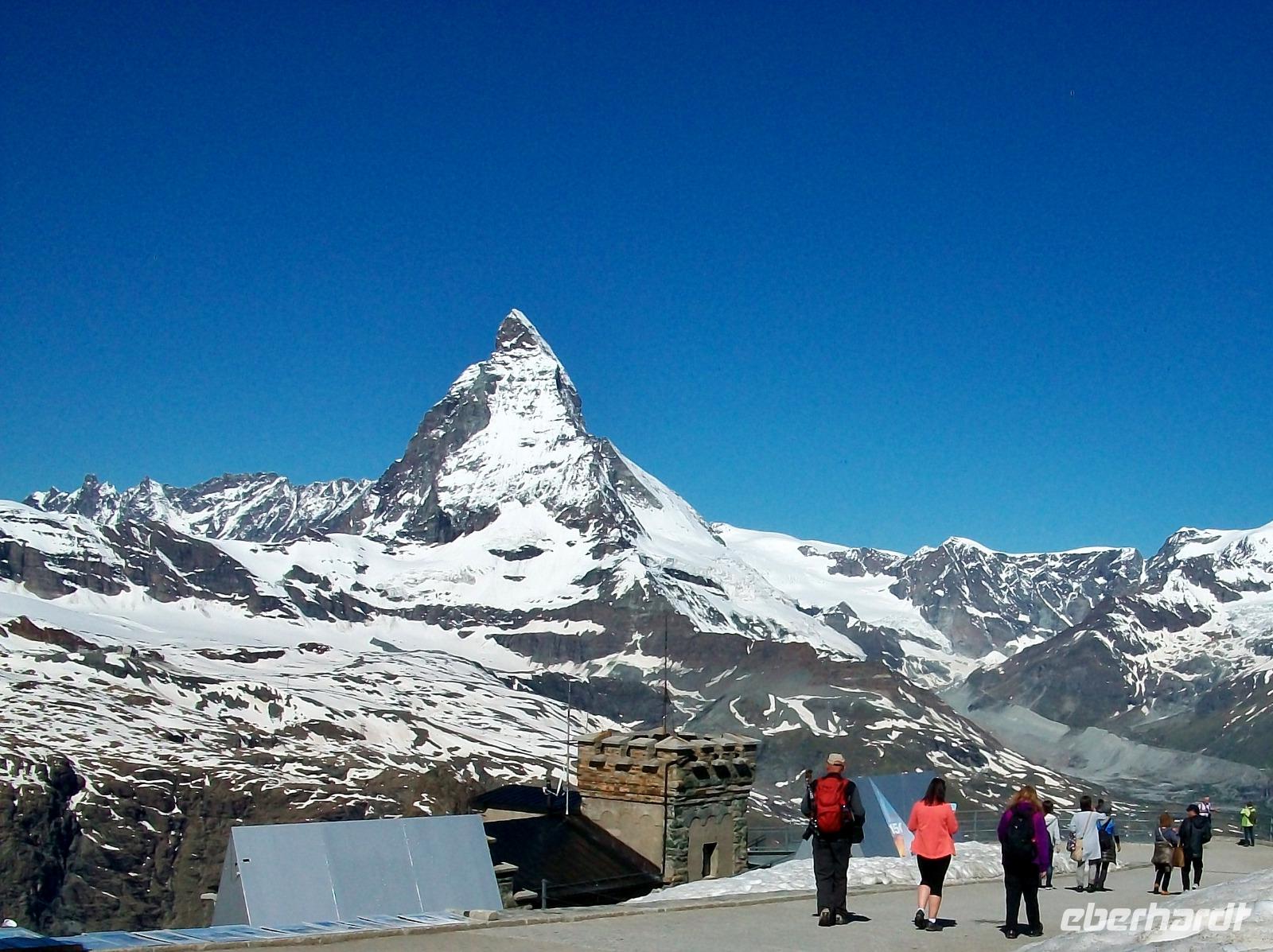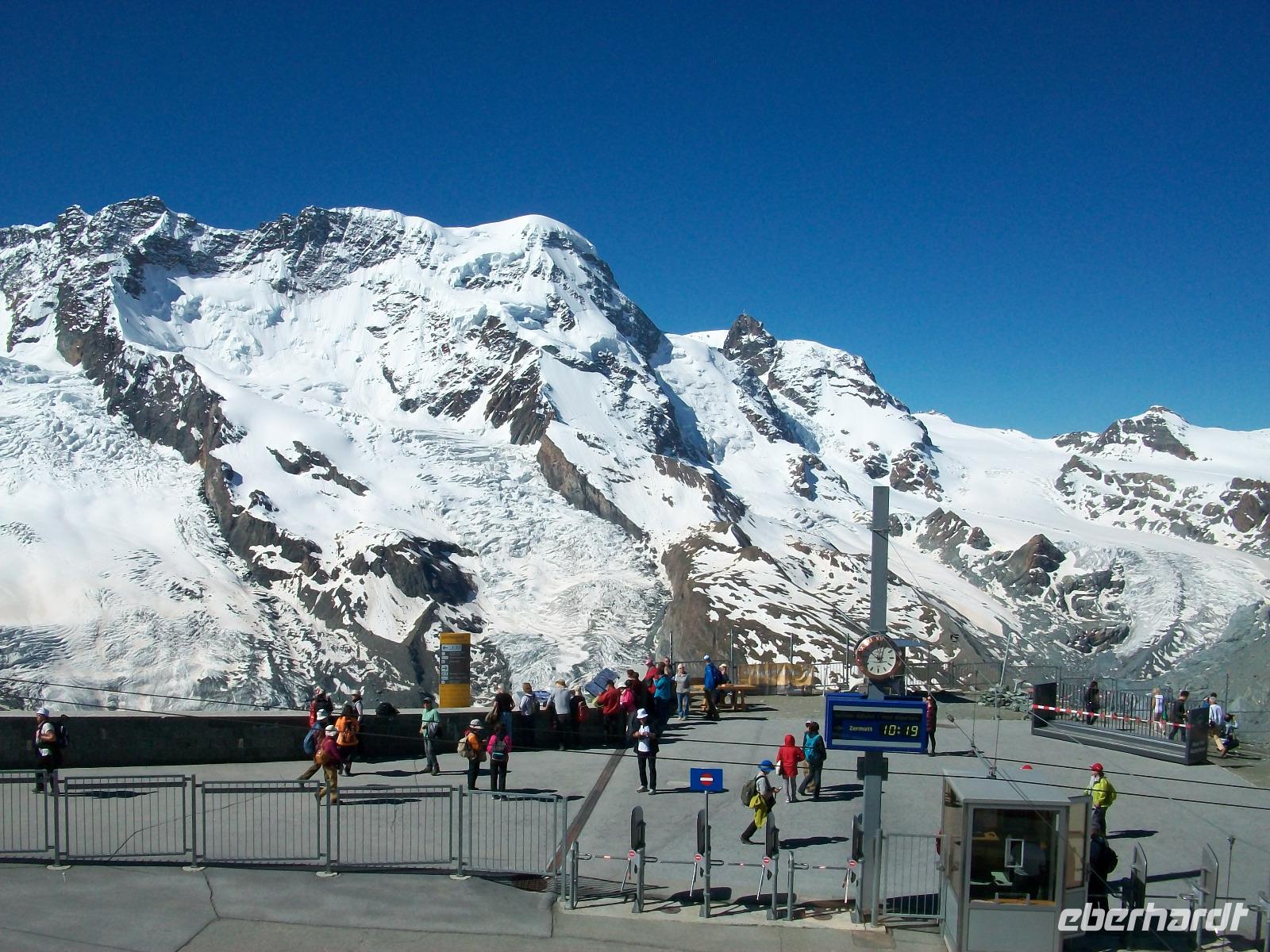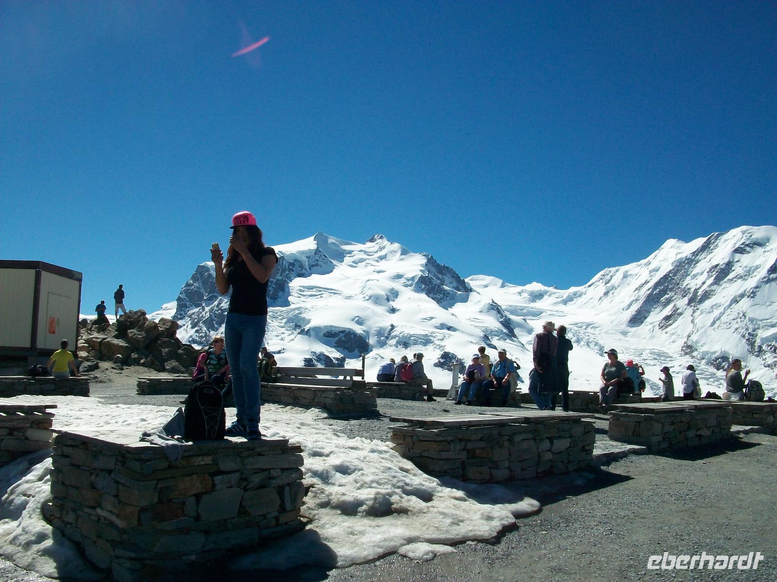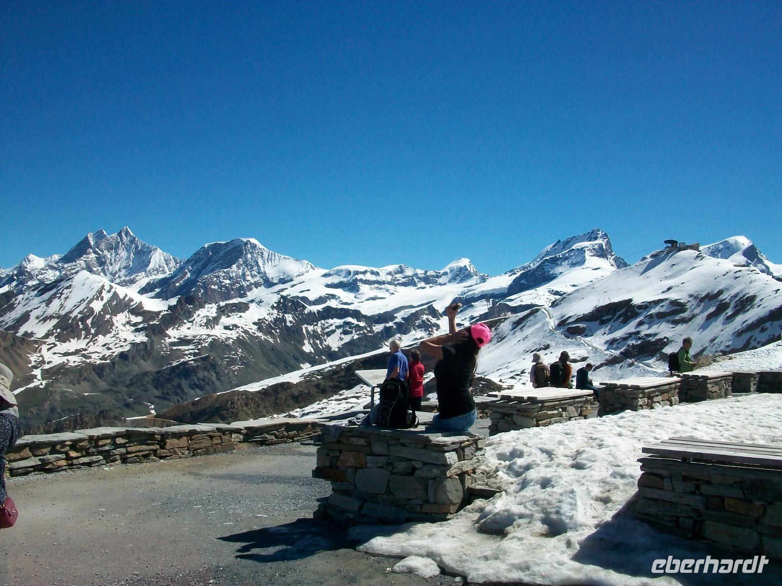 Als wir dann am Gornergrat anlangen ist es hier oben ungewöhnlich warm, aber es liegt noch Schnee, ein eigentümliches Gefühl. Am Aussichtspunkt herrscht himmlische Ruhe, von hier schweift der Blick hinunter in die tiefe Schlucht und das ewige Eis der Gletscher; durch die Lüfte gleiten elegant die Bergdohlen, immer auf der Hut einen Brocken zu erhaschen den die Touristen manchmal spendieren.