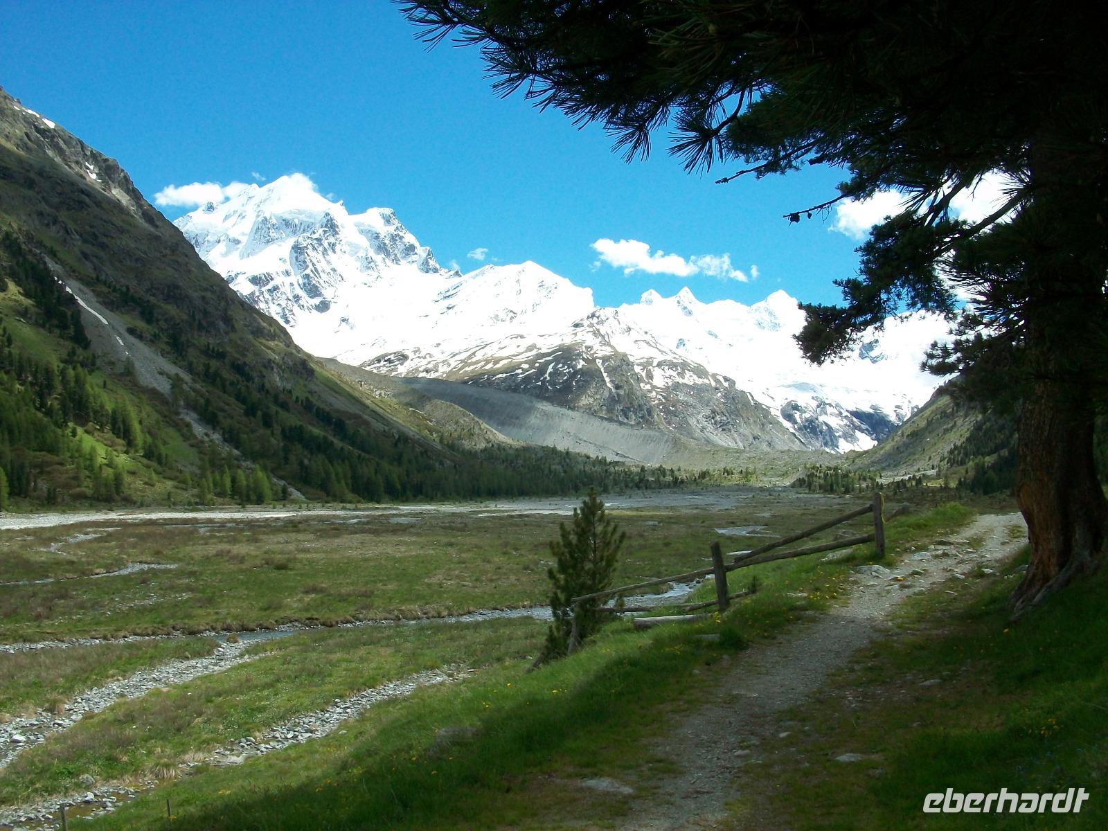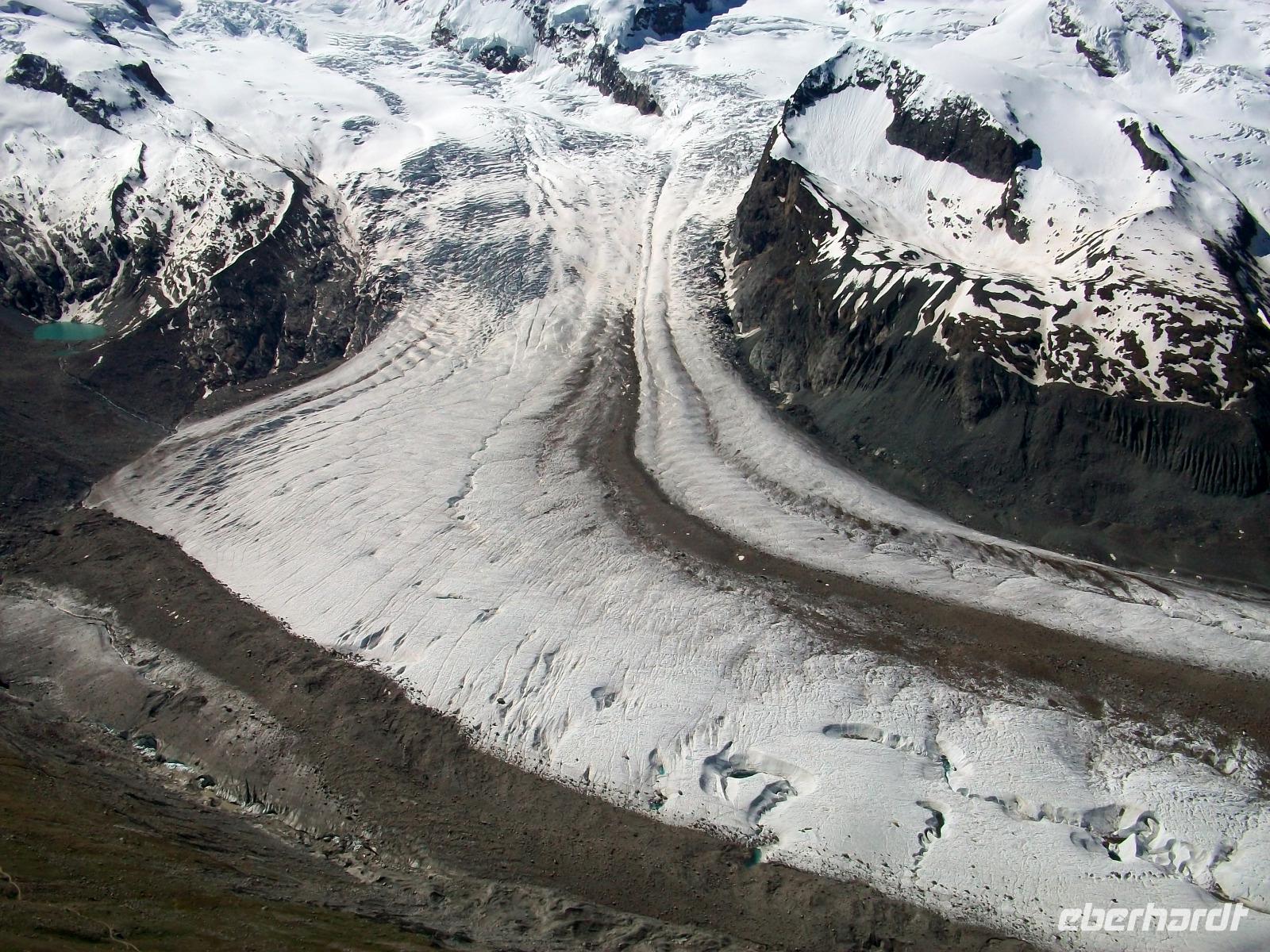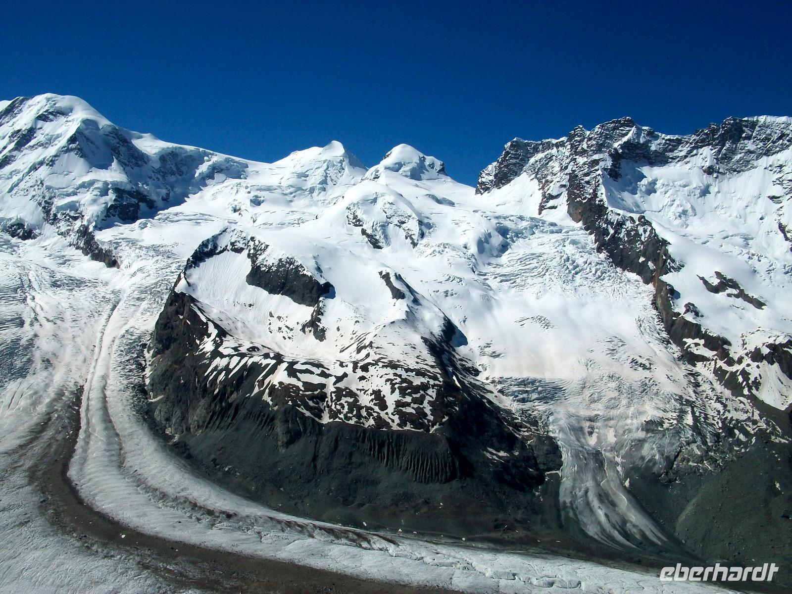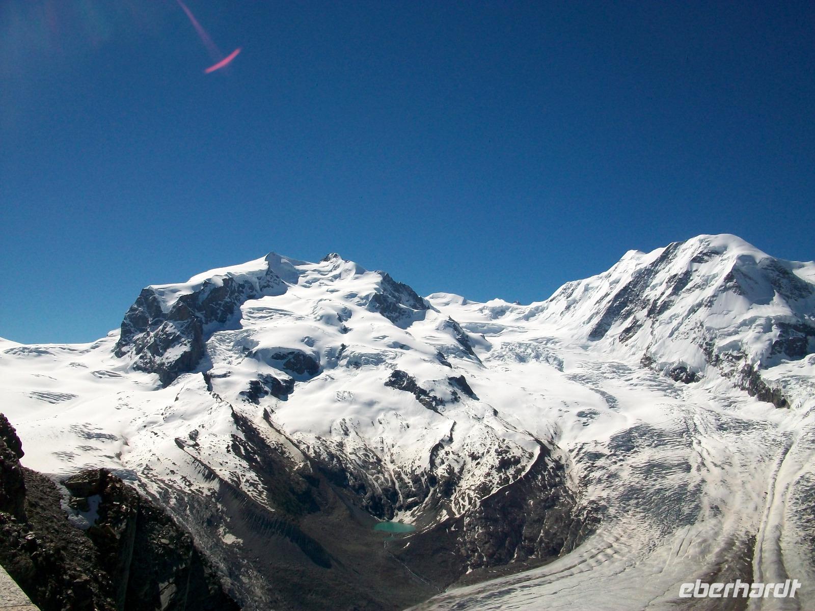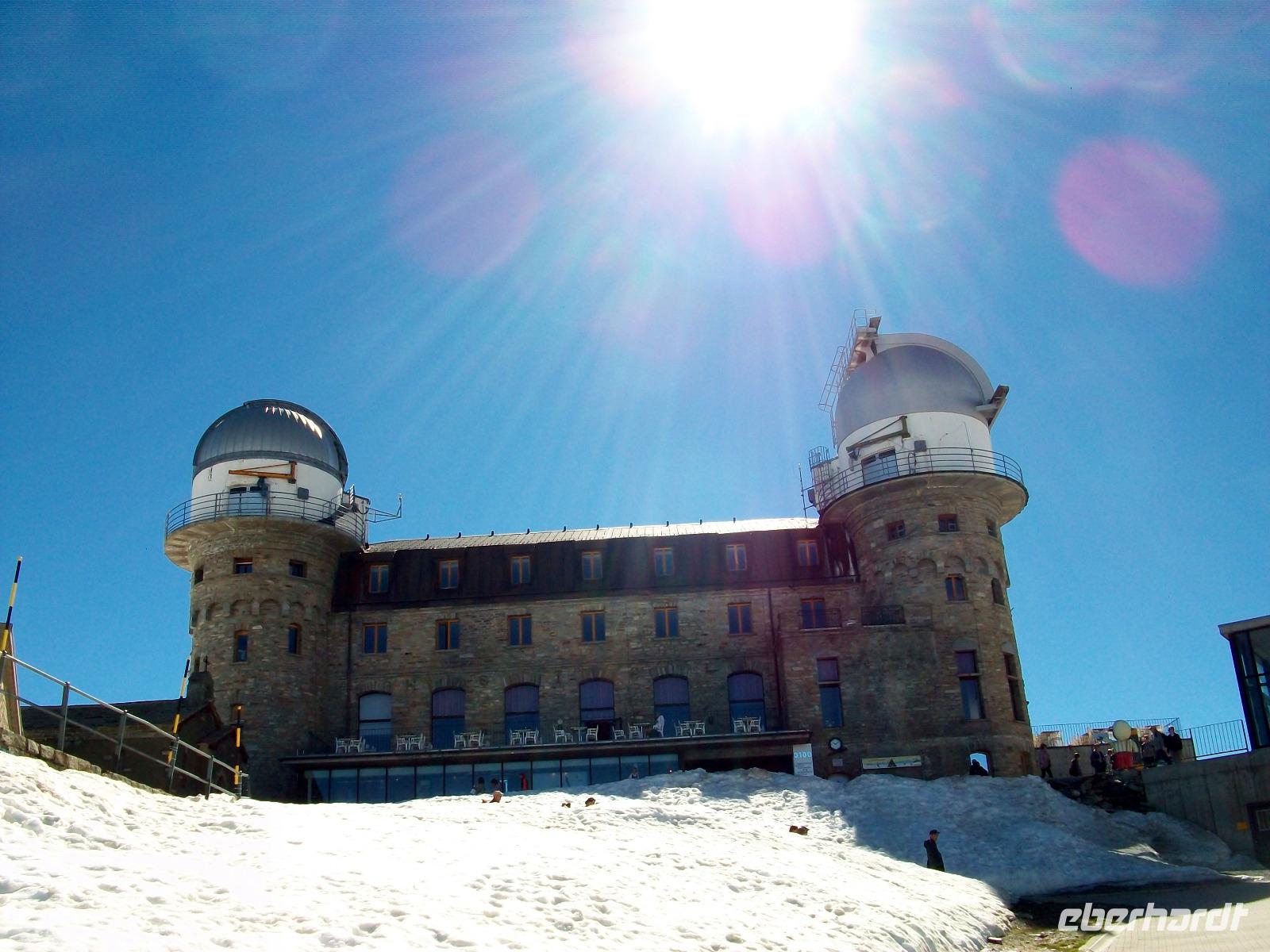 Als wir dann am Gornergrat anlangen ist es hier oben ungewöhnlich warm, aber es liegt noch Schnee, ein eigentümliches Gefühl. Am Aussichtspunkt herrscht himmlische Ruhe, von hier schweift der Blick hinunter in die tiefe Schlucht und das ewige Eis der Gletscher; durch die Lüfte gleiten elegant die Bergdohlen, immer auf der Hut einen Brocken zu erhaschen den die Touristen manchmal spendieren.