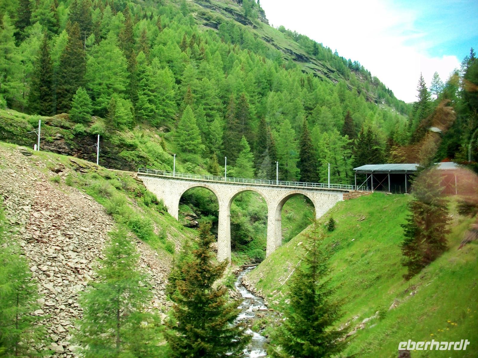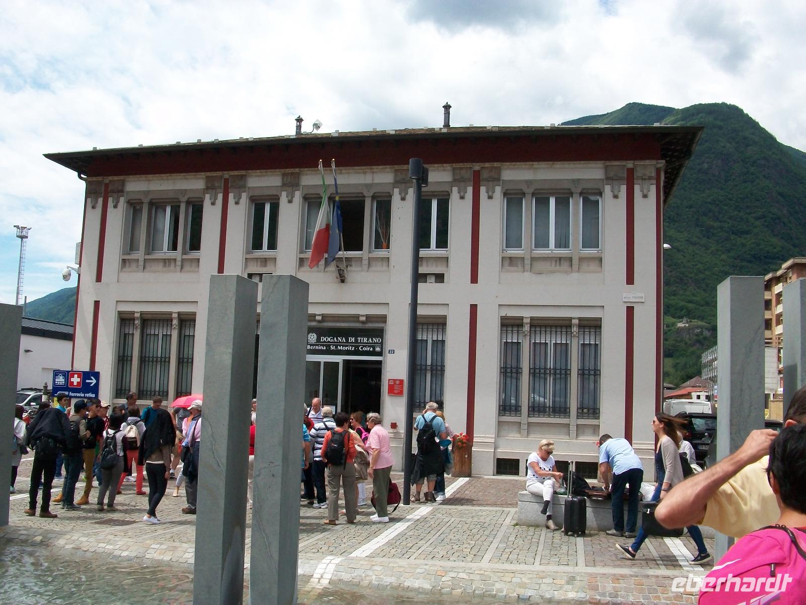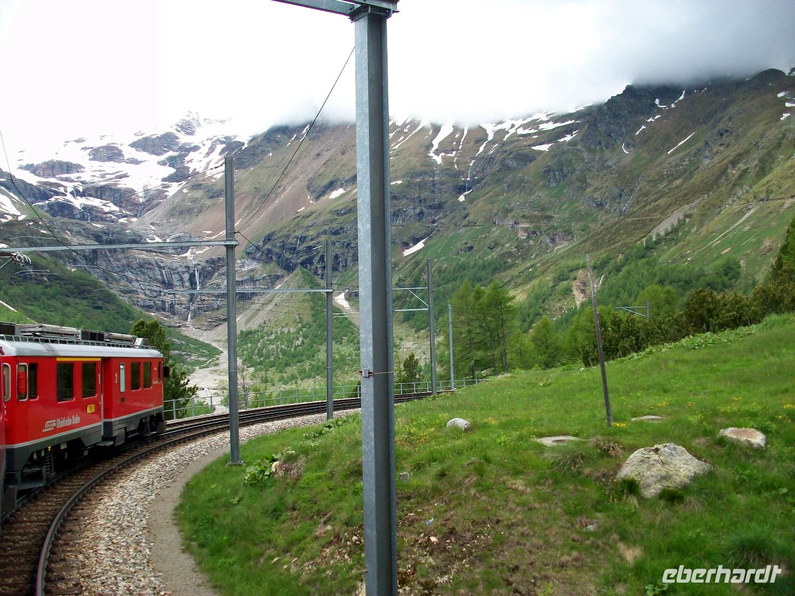 Ein weiterer großer Höhepunkt dieser Reise steht an und es ist auch ein besonderer Tag für unsere Eisenbahnfreunde. Zunächst gelangen wir nach Sankt Moritz zum Bahnhof, bald haben wir in den für uns reservierten Panoramawagen Platz genommen und erwarten die Abfahrt. Diese erfolgt auch pünktlich mit einem Pfiff und langsam setzt sich der Zug in Bewegung. Die schöne Landschaft des Oberengadins gleitet an den Fenstern vorbei; rechts ist auch die gigantische Eismasse des Morteratschgletschers zu sehen. Der Zug gewinnt an Höhe, bald sind wir über der Baumgrenze und im Reich der Murmeltiere angelangt. Wir überschreiten den Scheitelpunkt mit der spärlichen Vegetation und durch mehrere Kehrtunnel geht es wieder hinab. Wir sehen die schönen Häuser von Poschiavo im Tal liegen, fahren auf dem Kreisviadukt von Brusio mit dem Zug einmal im Kreis herum und langen zum Mittag an unserem Ziel an, es ist der italienische Ort Tirano.