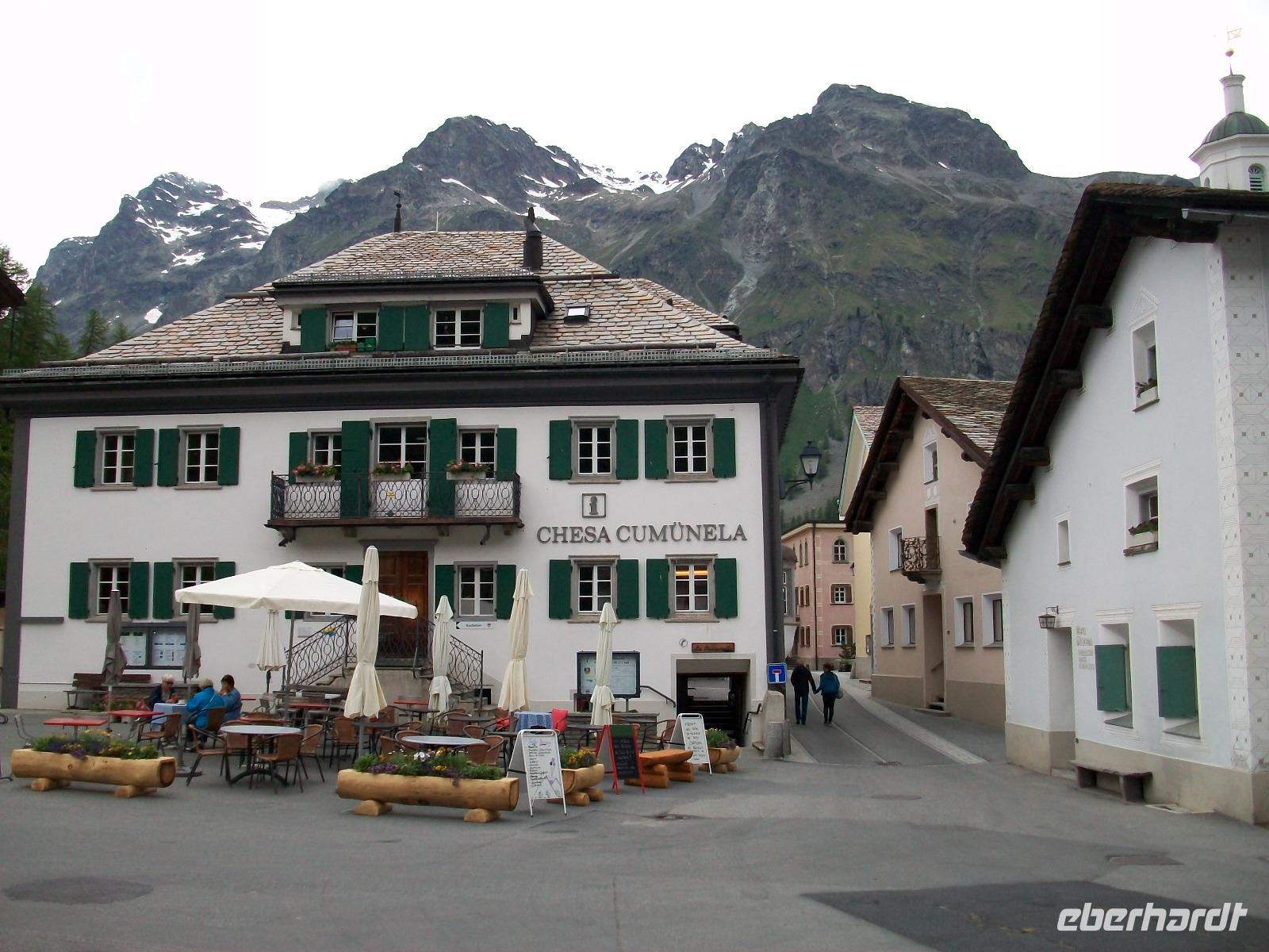 Wild kommt uns die Albula entgegen als wir die Autobahn bei Thusis verlassen haben, hinter Tiefenkastel beginnt dann der Aufstieg zum Julierpass. Der Baumbestand tritt zurück und bei über 2 000 Metern überqueren wir diese Scheidelinie um von nun an bergab ins Oberengadin zu gelangen. Ja, diese Anreise war schon voll von Höhepunkten aber auch nicht ohne Anstrengung, daher lassen wir es uns dann besonders gut schmecken als wir dann zum Diner im geschmackvollen Jugendstilsaal unseres Hotels wieder vereint sind.