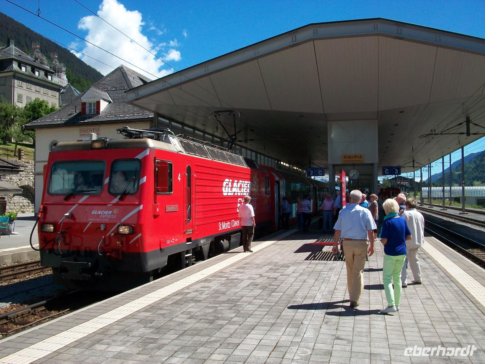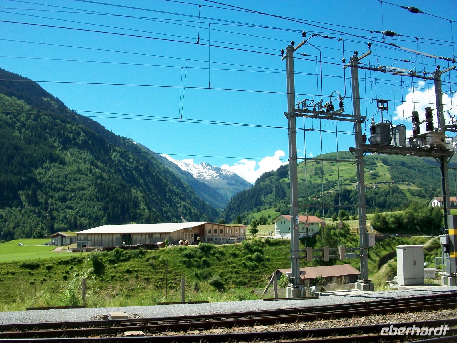 Dann, in Disentis, wird die Lok gewechselt, ab hier benötigt der Zug die Zahnradtechnik um die steilen Anstiege und Gefälle zu meistern.