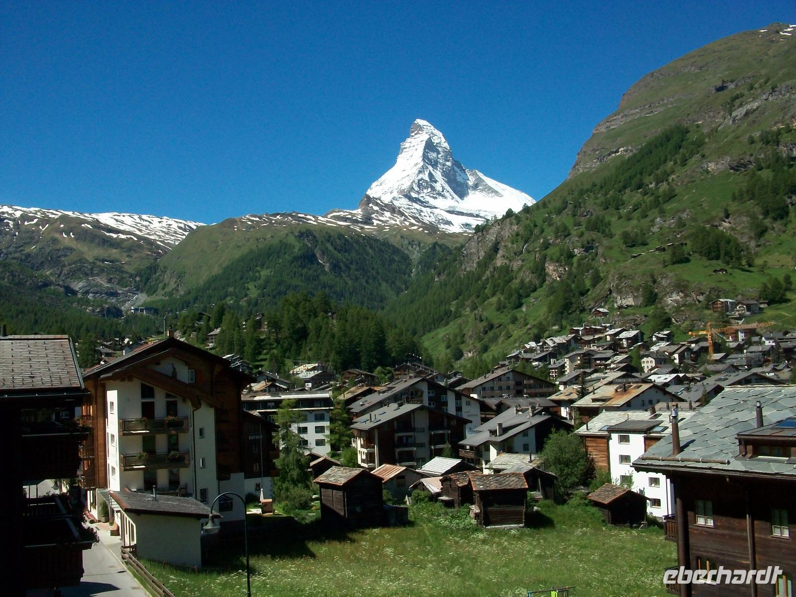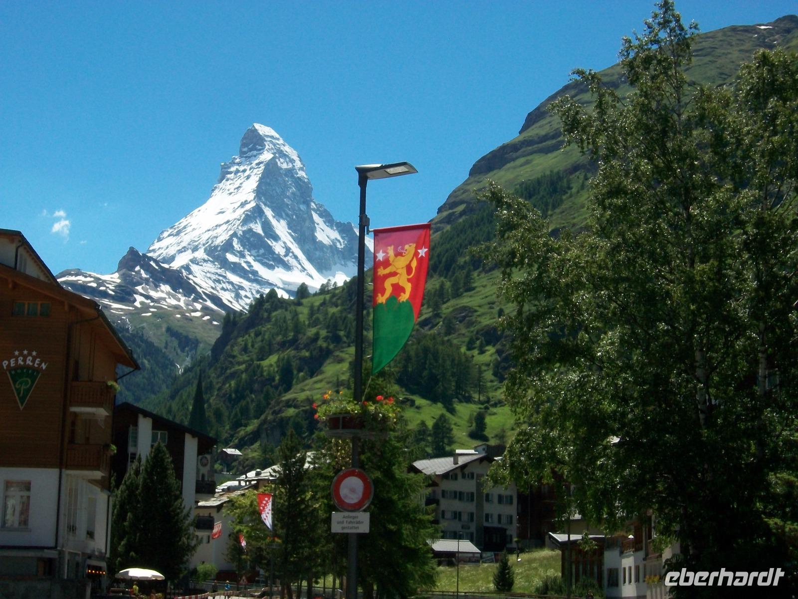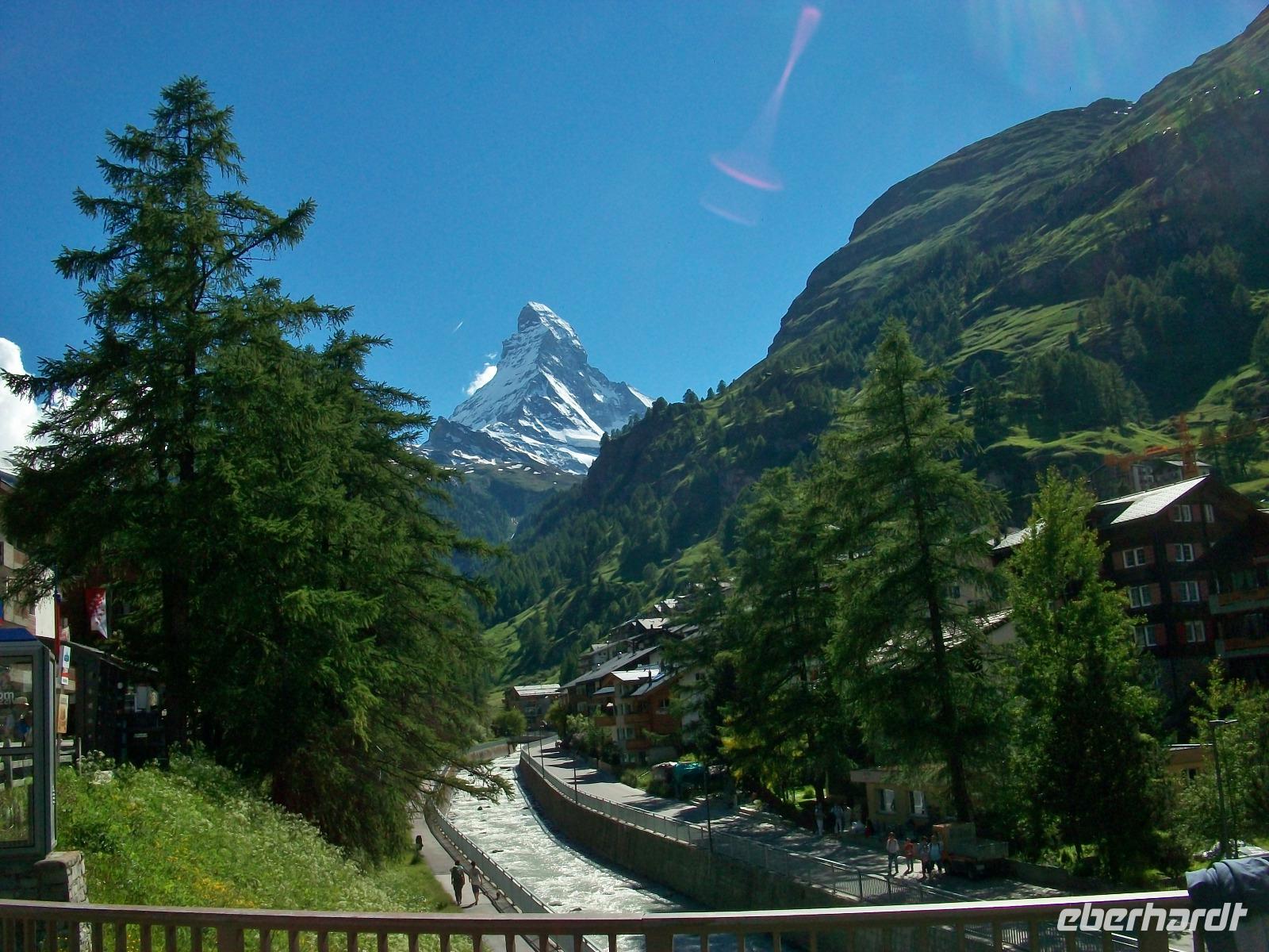 Warme Luft empfängt uns im Bergort und wir werden begrüßt vom Matterhorn das schon heute in voller Schönheit zu sehen ist. Schnell ins Hotel und dann ab zu einer ersten Erkundung von Zermatt! Zum Abendessen sind wir uns einig: das war ein besonders schöner Tag.