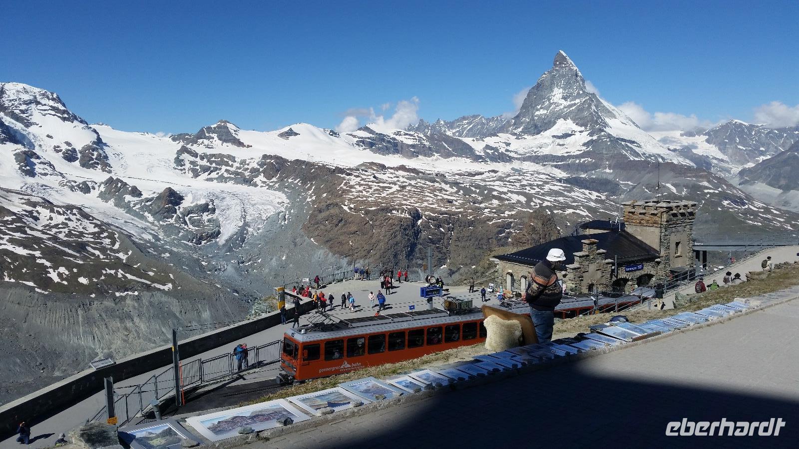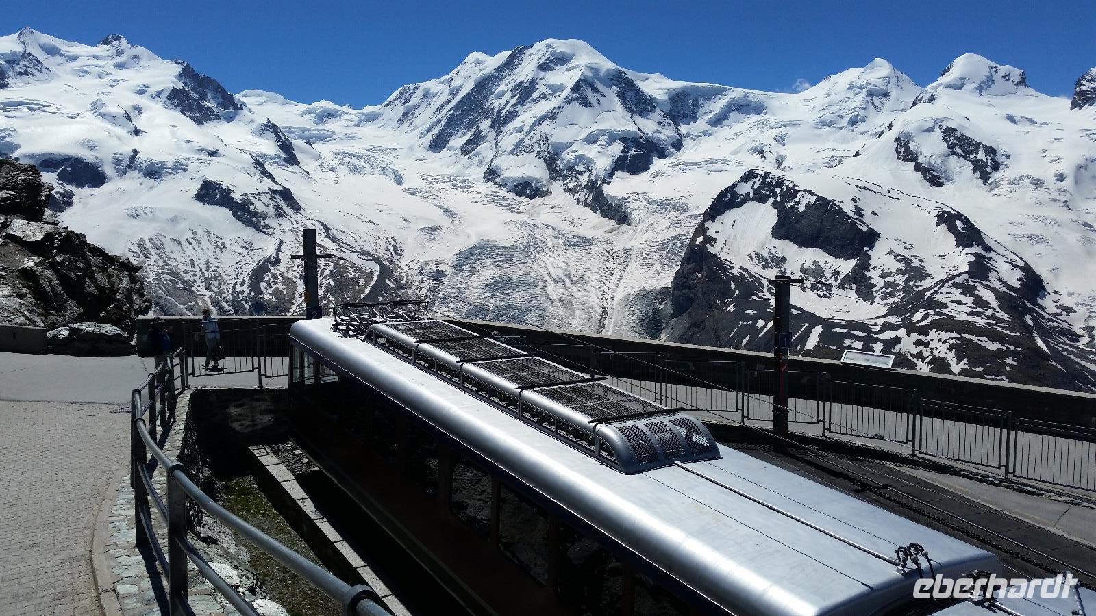 21 Personen hatten sich am Vorabend gemeldet, um mit mir auf den Gornergrat zu fahren. 9.12 Uhr setzte sich die höchste, frei im Gelände angelegte Zahnradbahn Europas auf den 3089 m hohen Berg in Bewegung. Oben angekommen hatten wir bei strahlendem Sonnenschein einen fantastischen Blick auf einige Viertausender und natürlich auch auf das Matterhorn, aber auch auf die leider immer kleiner werdenden Gletscher.