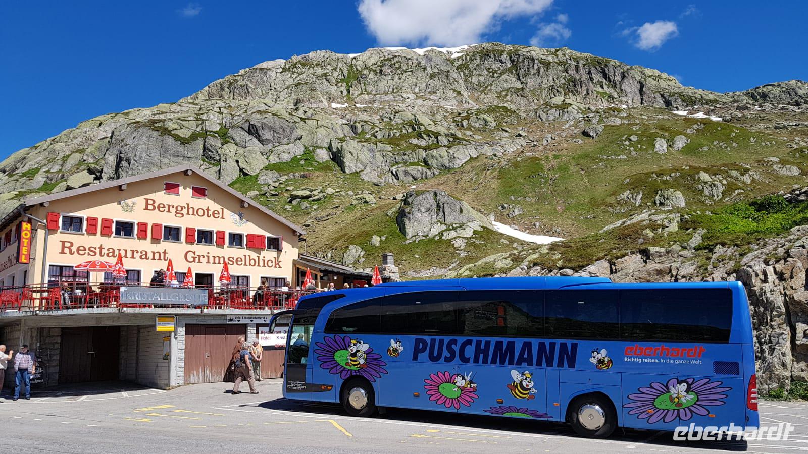 Nachdem unsere Koffer 7.30 Uhr im Hotel verladen und zum Zug gebracht wurden, konnten wir in aller Ruhe frühstücken, fotografieren und gemütlich zum Bahnhof laufen. Von dort fuhren wir mit der Bahn nach Täsch. Unser Busfahrer erwartete uns dort schon freudig. Er hatte die Koffer schon im Bus verladen. So fuhren wir gemeinsam Richtung Luzern. Das große Staunen begann, als wir vor einer großen steilen Wand standen. Entweder links den Grimsel-Pass oder rechts den Furka-Pass. Der Busfahrer entschied sich für die linke Variante. Atemberaubende Kehren auf schwindeleregender Höhe, ein wunderbares Erlebnis auf dieser Straße zu fahren.