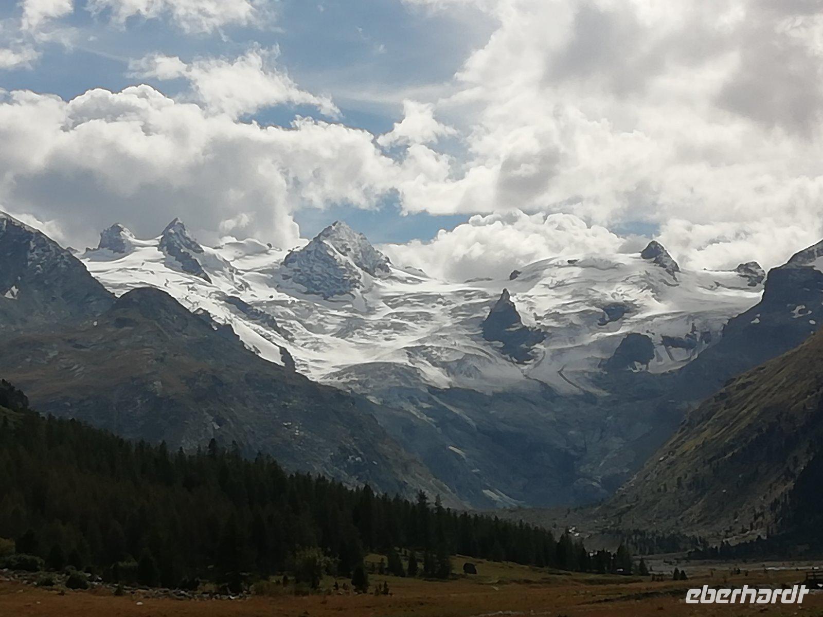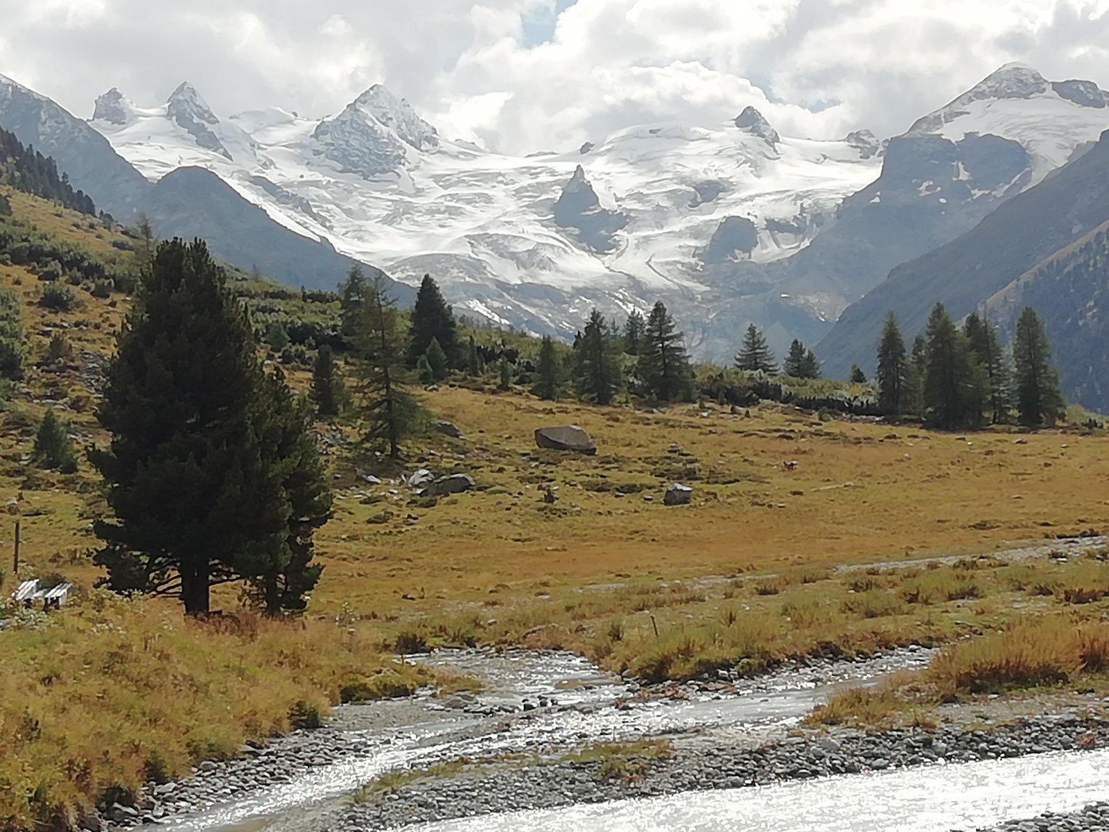 Danach bringt uns Gisela mit dem Bus in den Nachbarort Pontresina, wo wir unsere Mittagspause machen. Gut gestärkt geht es mit zwei Pferdekutschen ins wildromantische Rosegtal. Die 7 Kilometer lange Strecke führt durch ein Naturreservat für alpine Flora und Fauna. Am Ziel auf 1999 m Höhe erwartet uns ein wundervoller Blick auf den Roseg-Gletscher. Wir unternehmen einen kleinen Spaziergang und machen eine Kaffeepause auf der Sonnenterrasse. Dann fahren wir mit 2 PS wieder zurück.