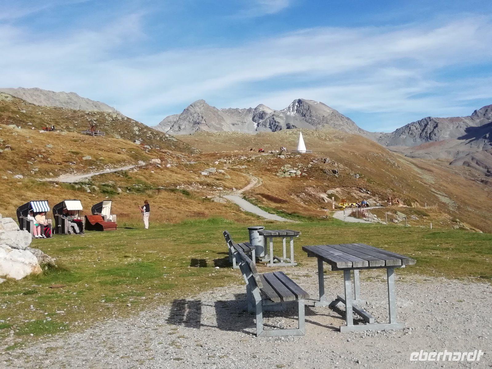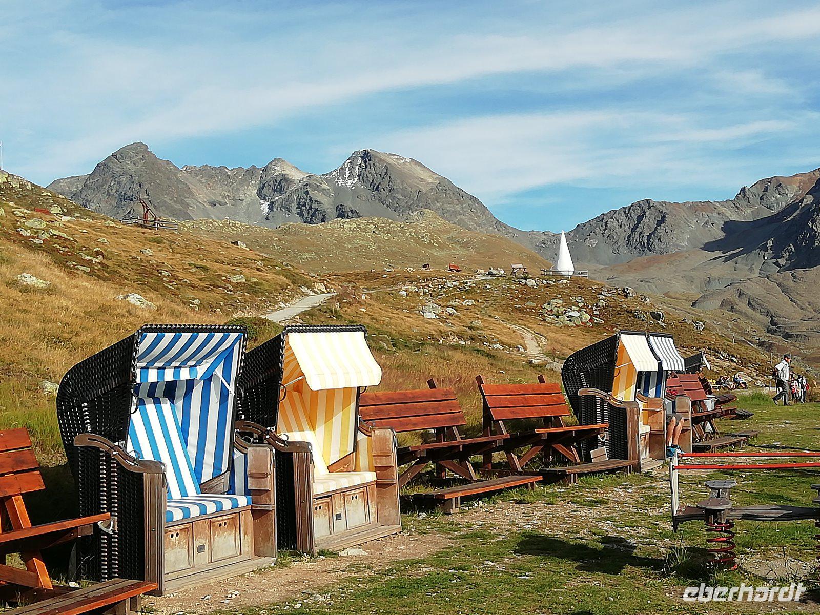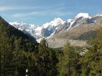 Auch heute geht es mit dem Bus nach dem Frühstück wieder nach St. Moritz. Es steht unsere erste Bahnfahrt auf dem Programm. Im Bernina-Express können wir unsere reservierten Plätze im Panoramawagen der 1. Klasse einnehmen. Pünktlich fährt der Zug ab. Die Berninastrecke gilt als Meisterwerk der Ingenieurbaukunst. Über Pontresina geht es mit schönem Blick auf den Morteratschgletscher hinauf zur Station Ospizio Bernina. Mit 2253 m.ü.M. ist es die höchstgelegene Station auf dem Netz der Rhätischen Bahn. Vorbei am Aussichtspunkt Alp Grüm, wo wir für einen Fotostopp aussteigen, fahren wir weiter durch das Puschlav, drehen mit dem Zug eine Schleife auf dem Kreisviadukt von Brusio und erreichen schließlich Tirano in Italien. Hier empfangen uns sehr sommerliche Temperaturen. Wir essen im Ristorante „Al Portici" Pasta und Eis und bummeln durch die Altstadt. Viele schauen sich auch die Basilika Madonna di Tirano mit den reich verzierten Fresken und der aus Kiefernholz geschnitzten Orgel an. Dann fährt uns Gisela mit dem Bus wieder zurück. Dabei können wir vieles, was wir vom Zug aus gesehen haben, nun aus einer anderen Perspektive betrachten. Auf dem Berninapass machen wir unsere Kaffeepause. Am dortigen Hotel wird angezeigt, wie hoch der Schnee hier in vergangenen Jahren gelegen hat - kaum vorstellbar. Weiter geht es nach Pontresina. Da wir mit der Gästekarte einige Bergbahnen kostenlos nutzen können, machen wir noch einen Halt an der Talstation vom Punt Muragl. Mit der Zahnradbahn fahren wir hinauf auf eine Höhe von 2454 m. Hier unternehmen wir einen kleinen Spaziergang oder sonnen uns in den Strandkörben.