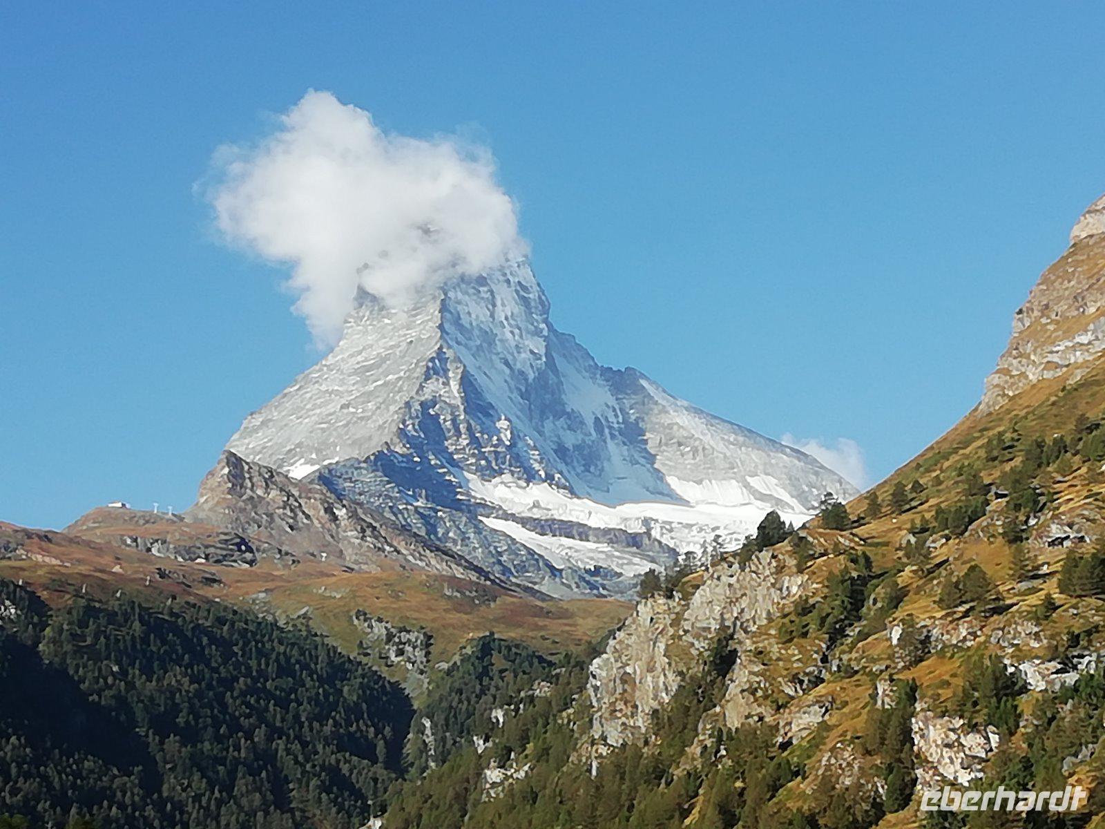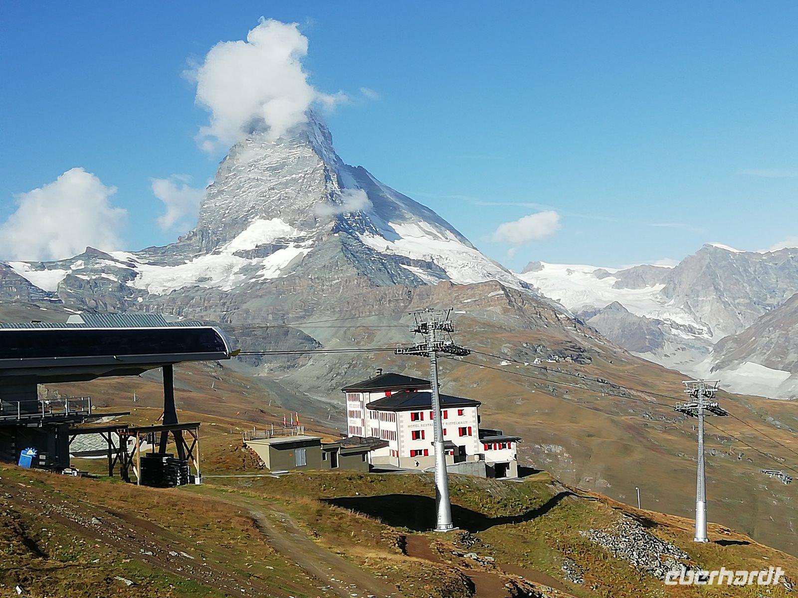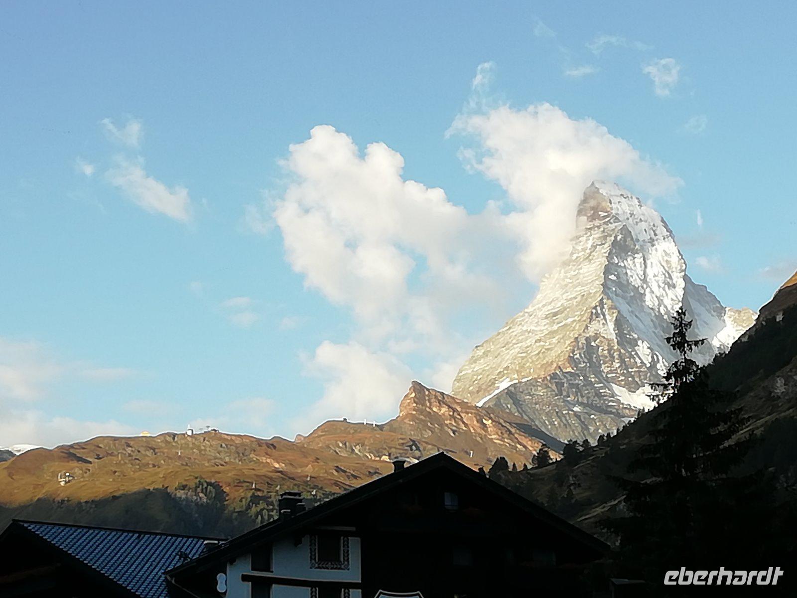 Kaum hat der Wecker geklingelt, schauen wir zum Himmel: Sonnenschein und keine Wolken, das Matterhorn ist zu sehen! Gleich werden die ersten Fotos gemacht.