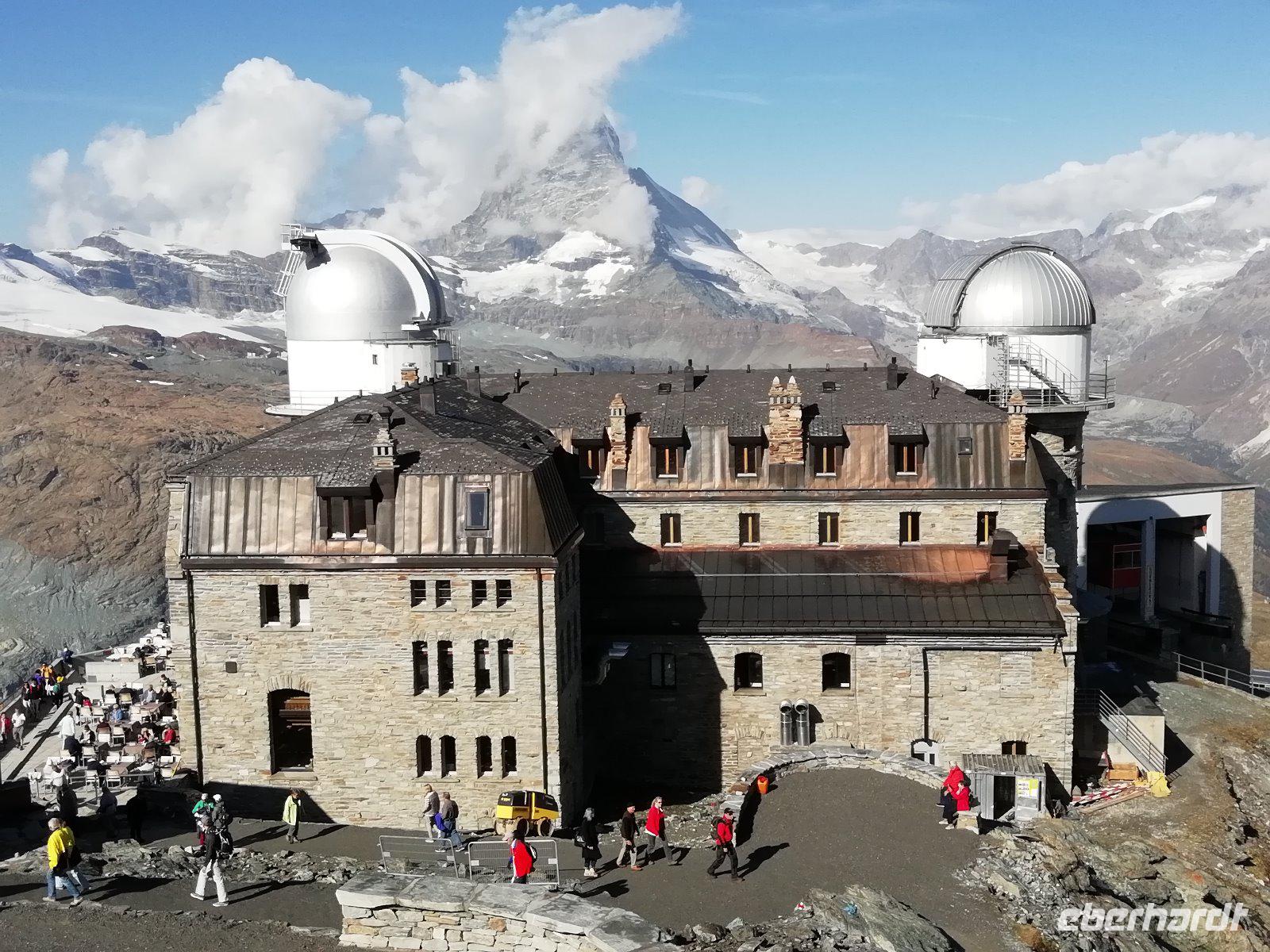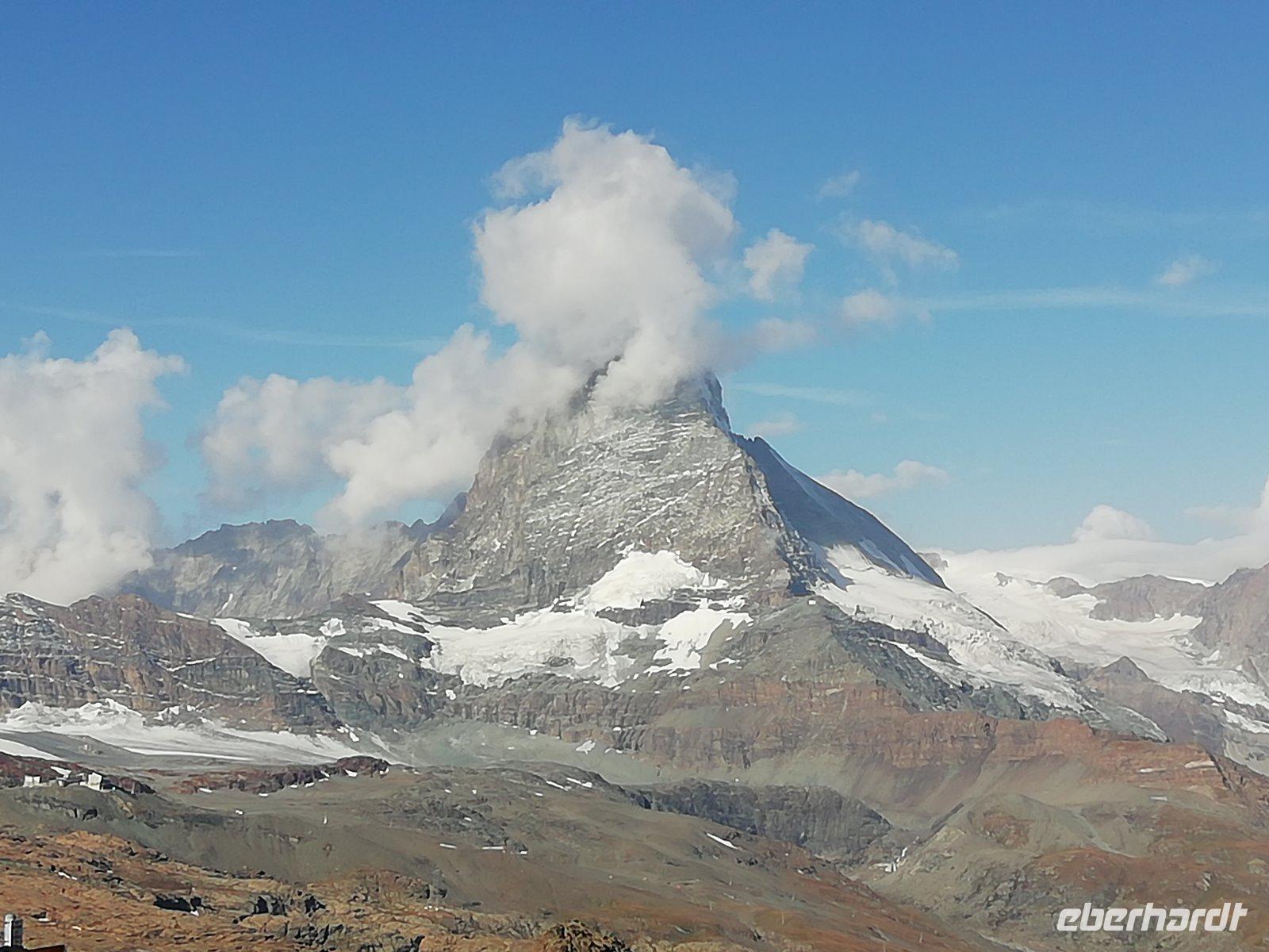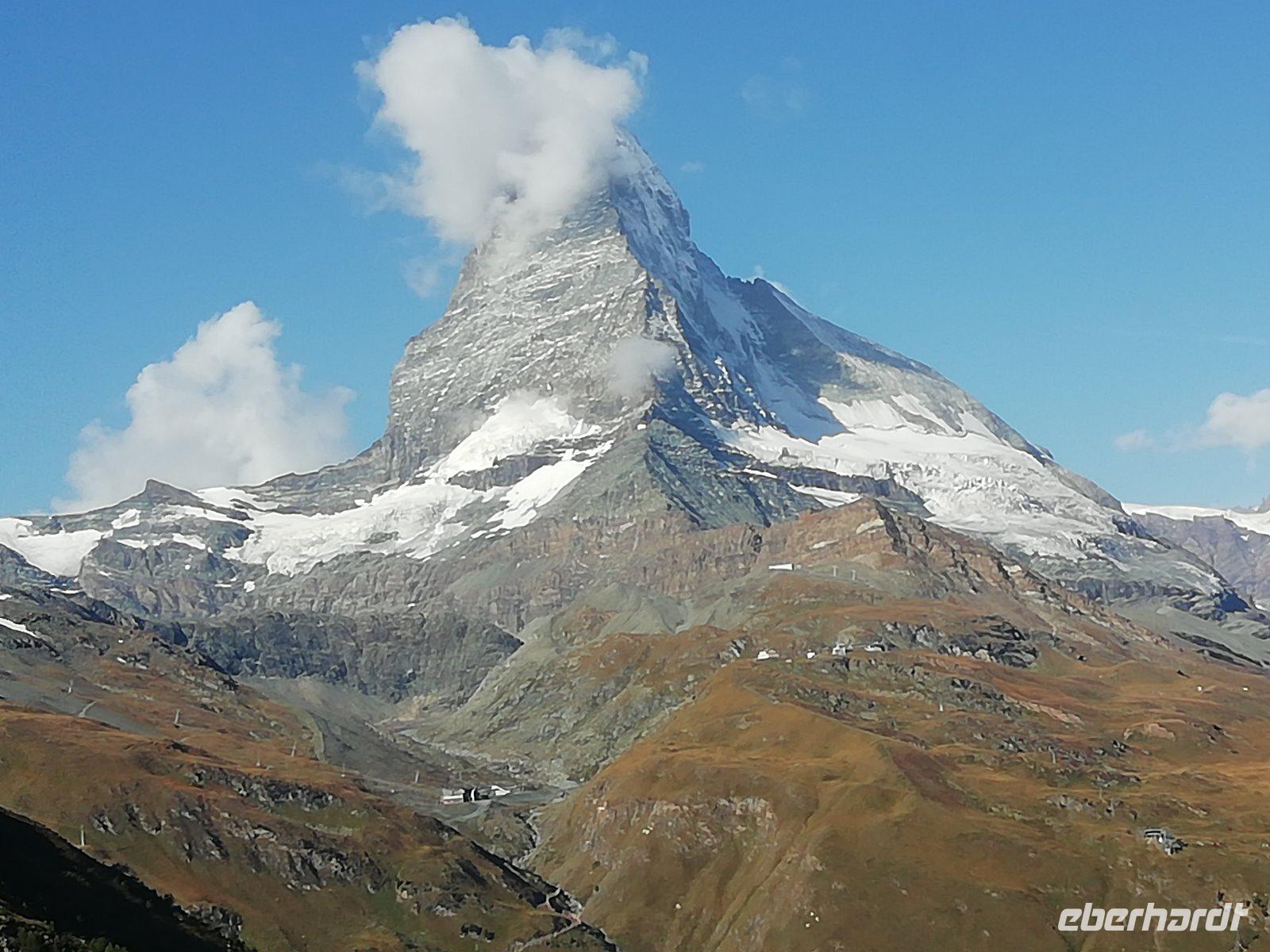 Kaum hat der Wecker geklingelt, schauen wir zum Himmel: Sonnenschein und keine Wolken, das Matterhorn ist zu sehen! Gleich werden die ersten Fotos gemacht.