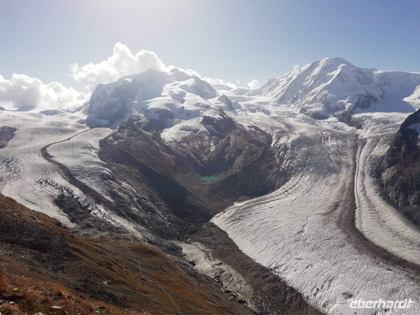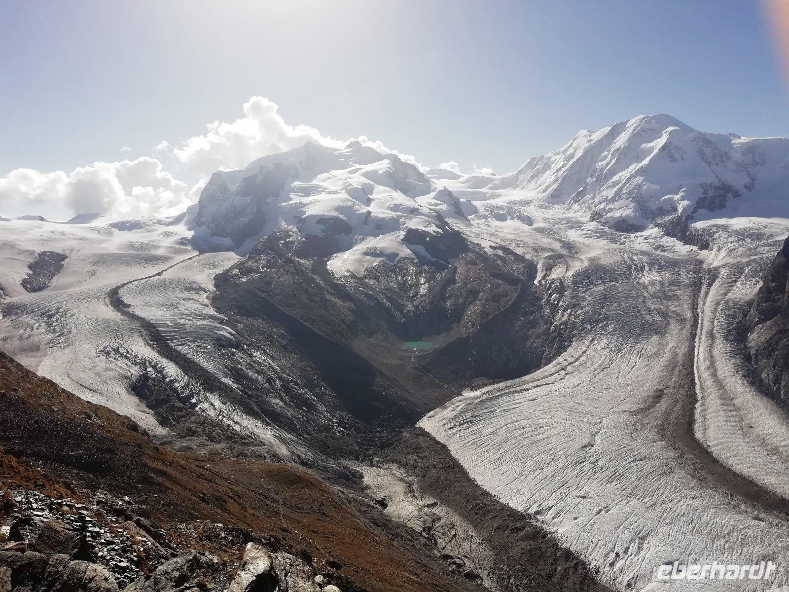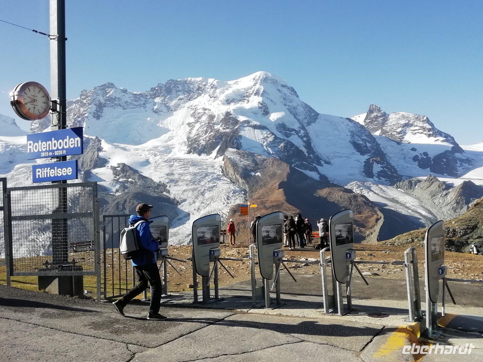 Nach dem Frühstück fahren wir gemeinsam mit der Bahn hinauf zum Gornergrat. Bereits während der 40minütigen Fahrt bietet sich uns immer wieder ein fantastischer Blick auf das Matterhorn. Wir genießen die Zeit auf dem Gipfel in der Sonne und können uns am unbeschreiblichen Panorama kaum satt sehen. Die Rundumsicht mit den beeindruckenden Gletschern, dem Kleinen Matterhorn, dem Breithorn und dem Monte-Rosa-Massiv ist einfach toll. Die meisten Gäste legen bei der Rückfahrt noch an der Station Rotenboden einen Halt ein, um zum Riffelsee zu gehen.