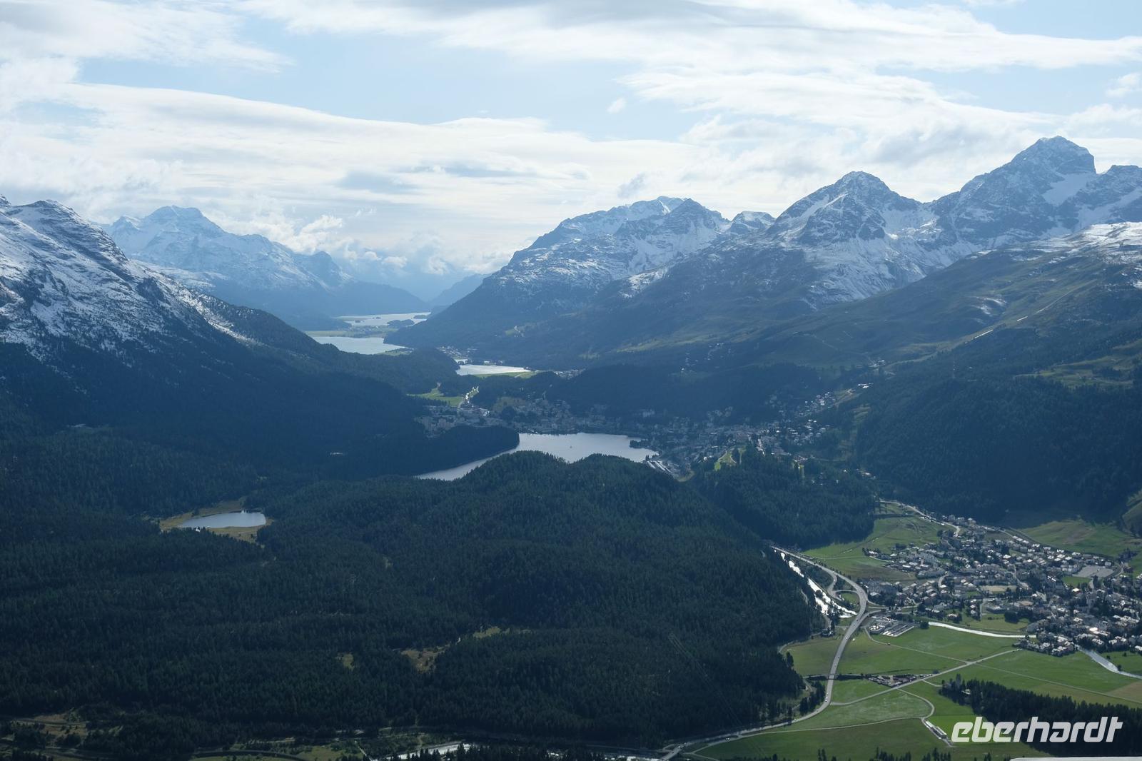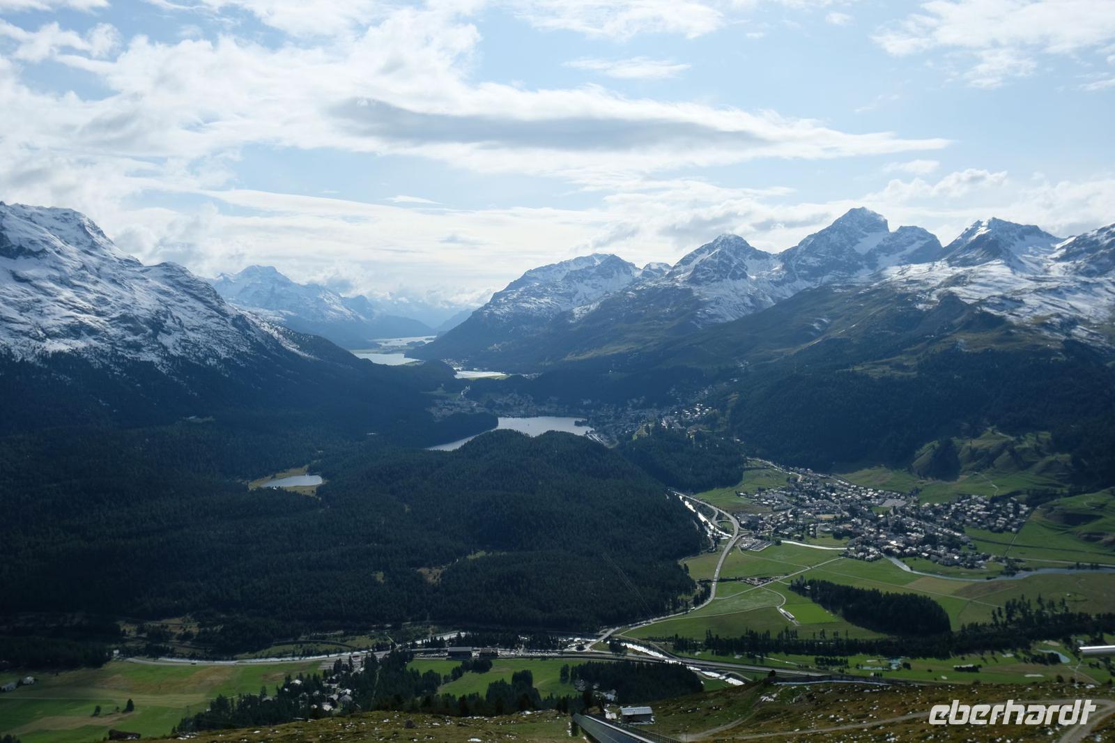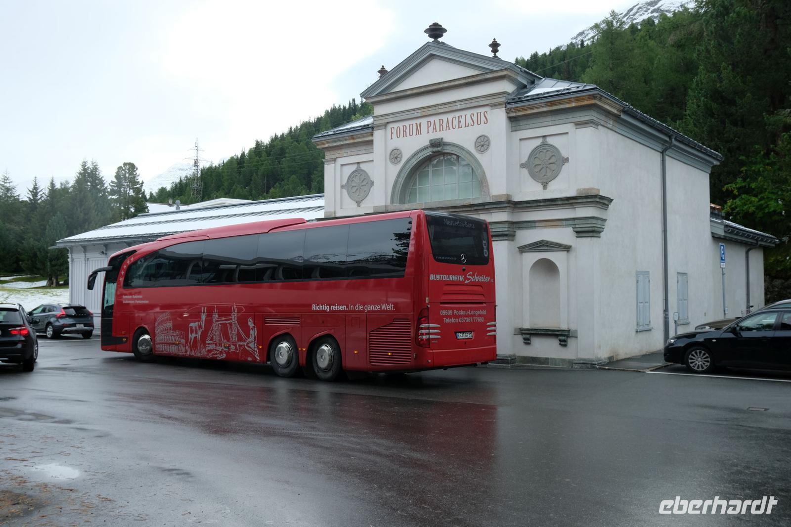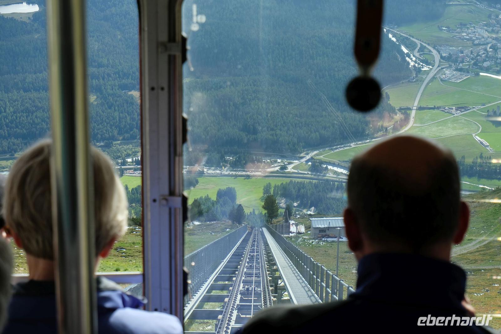 Nach einer reichlich 2-stündigen Fahrt kamen wir mittags im italienischen Tirano an. Einige Teilnehmer probierten in einem Restaurant die italienische Küche. 14.00 Uhr trafen wir uns alle wieder an unserem Bus. Bei der Rückfahrt hielten wir am Kreisviadukt von Brusio und auf dem Bernina-Pass. Beide Male konnten wir vorbeifahrende Züge fotografieren. Eine besondere Überraschung für unsere Gäste hatten wir uns noch aufgehoben. An der Talstation des Muottas Muragel hielten wir an und fuhren mit einer Seilbahn auf den 2456 m hohen Berg. Die Aussicht auf die Berge und auf St. Moritz war beeindruckend. Nach 25 Minuten Aufenthalt und einer steilen Abfahrt ging es dann zurück nach Sils, wo wir wieder ein leckeres Abendessen genießen konnten.
