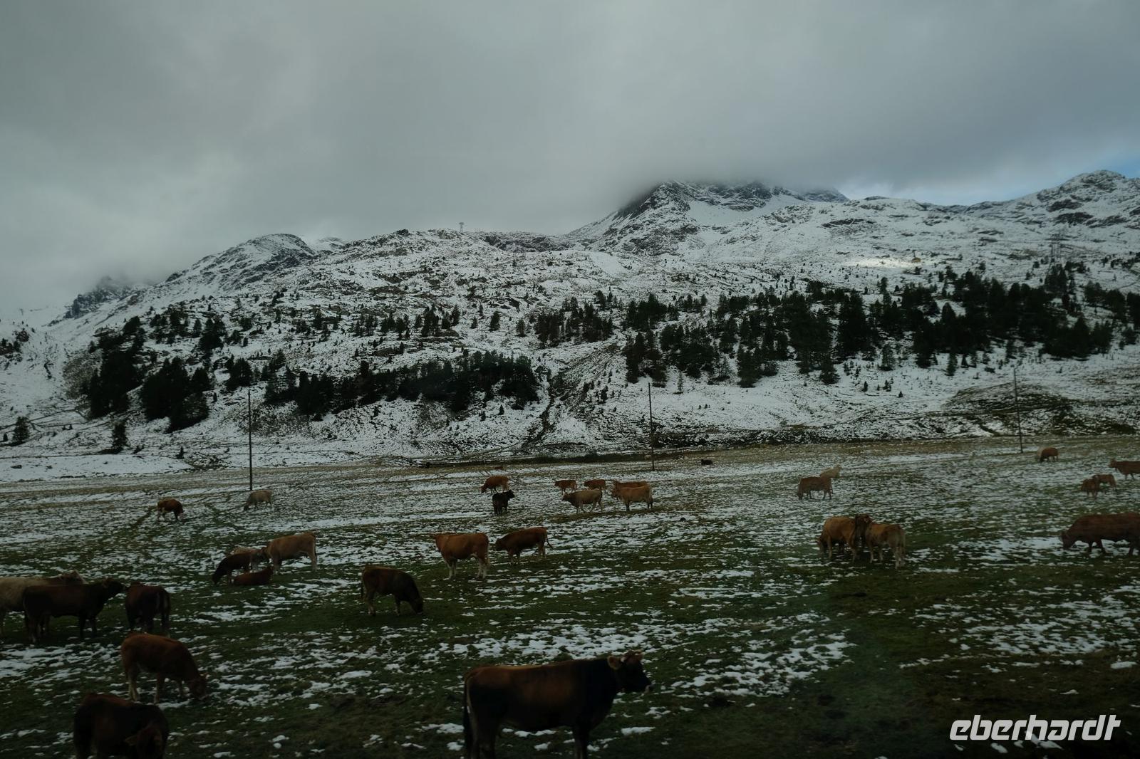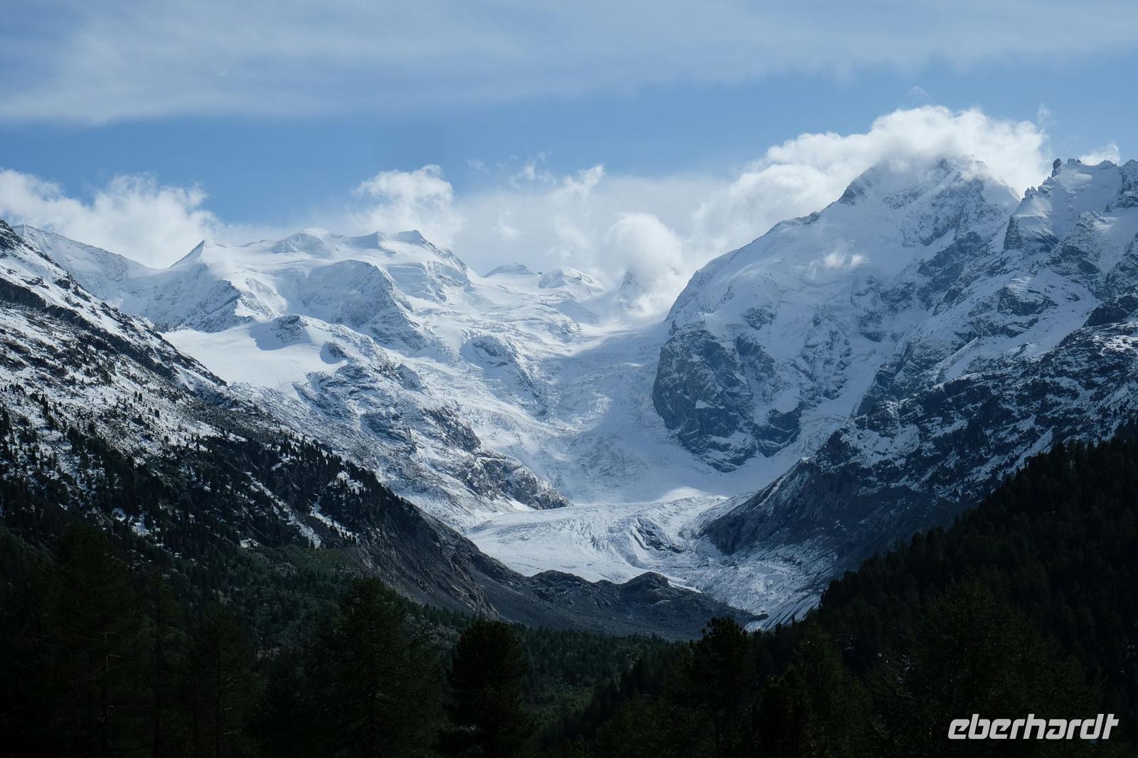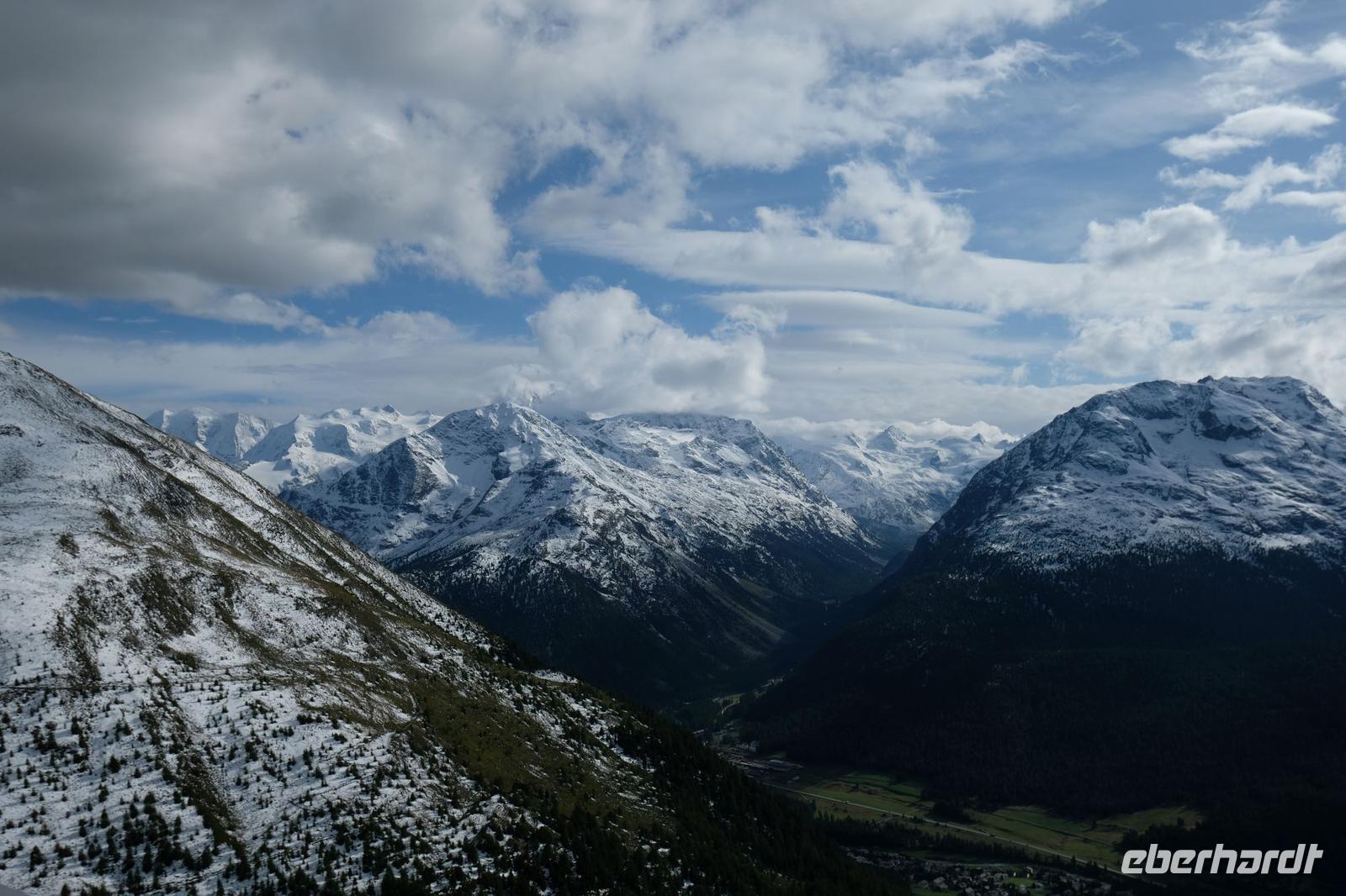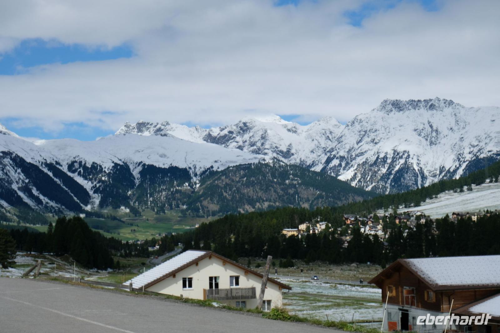Nach einer reichlich 2-stündigen Fahrt kamen wir mittags im italienischen Tirano an. Einige Teilnehmer probierten in einem Restaurant die italienische Küche. 14.00 Uhr trafen wir uns alle wieder an unserem Bus. Bei der Rückfahrt hielten wir am Kreisviadukt von Brusio und auf dem Bernina-Pass. Beide Male konnten wir vorbeifahrende Züge fotografieren. Eine besondere Überraschung für unsere Gäste hatten wir uns noch aufgehoben. An der Talstation des Muottas Muragel hielten wir an und fuhren mit einer Seilbahn auf den 2456 m hohen Berg. Die Aussicht auf die Berge und auf St. Moritz war beeindruckend. Nach 25 Minuten Aufenthalt und einer steilen Abfahrt ging es dann zurück nach Sils, wo wir wieder ein leckeres Abendessen genießen konnten.