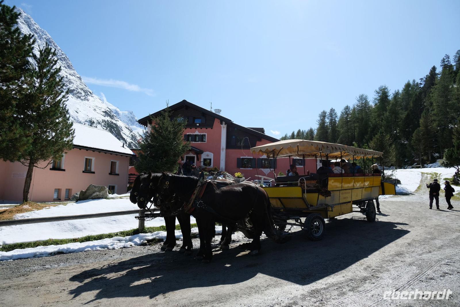 Nach einem ausgiebigen Frühstück fuhren wir nach St Moritz, um zunächst mit der örtlichen Reiseleiterin zu einer 40 min. Stadtrundfahrt zu starten. Dabei erhielten wir interessante Einblicke in die Stadtgeschichte und bekamen so beeindruckende Bilder dieser wunderschönen Stadt. Wir konnten im Forum Paracelsus sogar das Heilwasser des Kurortes kosten. Der anschließende Stadtrundgang wurde im Cafe Hauser mit der Verkostung der Bündner Nusstorte abgeschlossen. Langsam zeigte sich auch die Sonne. Damit konnten wir bei schönem Wetter nach Pontresina fahren. Nach Würstchen mit Senf und Toastbrot stiegen wir in unsere Pferdekutschen und fuhren 1 Stunde lang durch das malerische Val Rosseg. Am Ziel angelangt konnte jeder ganz individuell seinen Wünschen nach einer Wanderung durch die Natur oder einer Tasse Kaffee nachgehen. Gegen 16.30 Uhr fuhren wir wieder gemeinsam zurück zu unserem Ausgangspunkt. Von Pontresina fuhr Frank wieder sicher nach Sils.